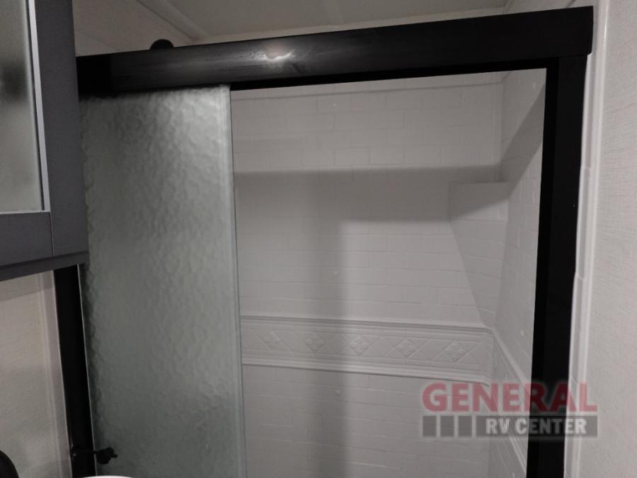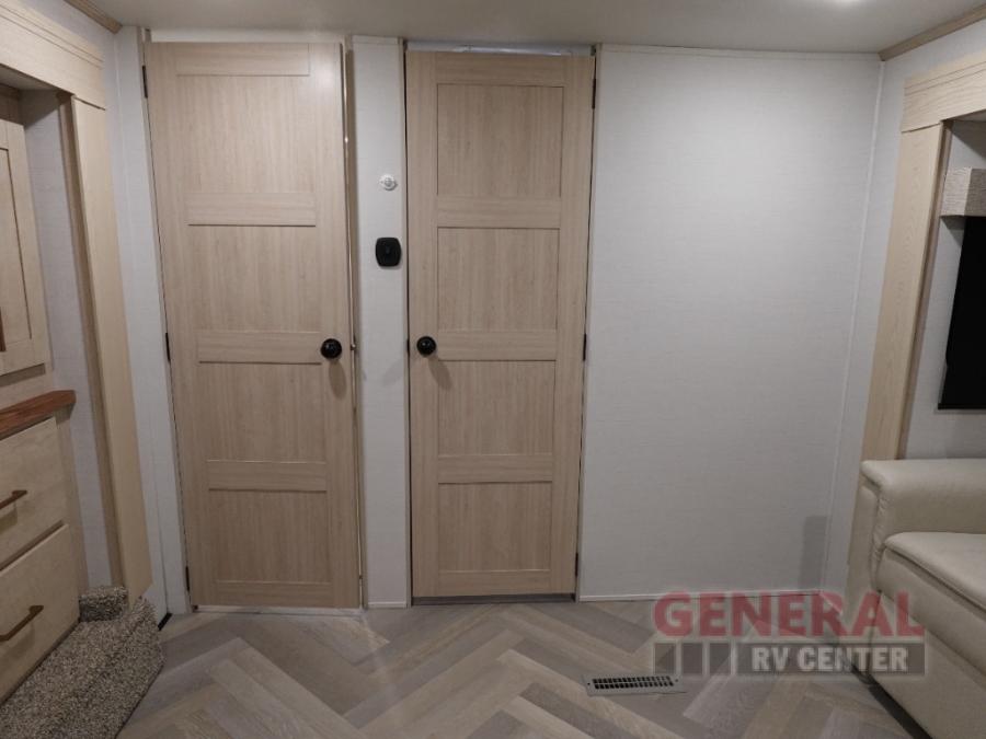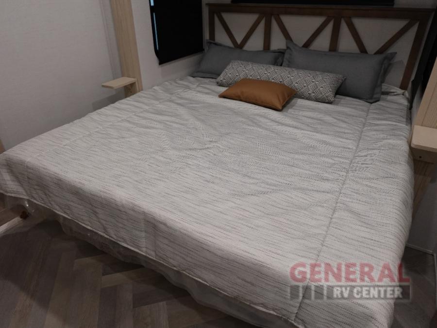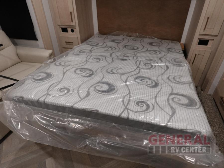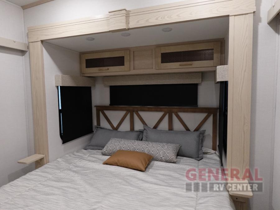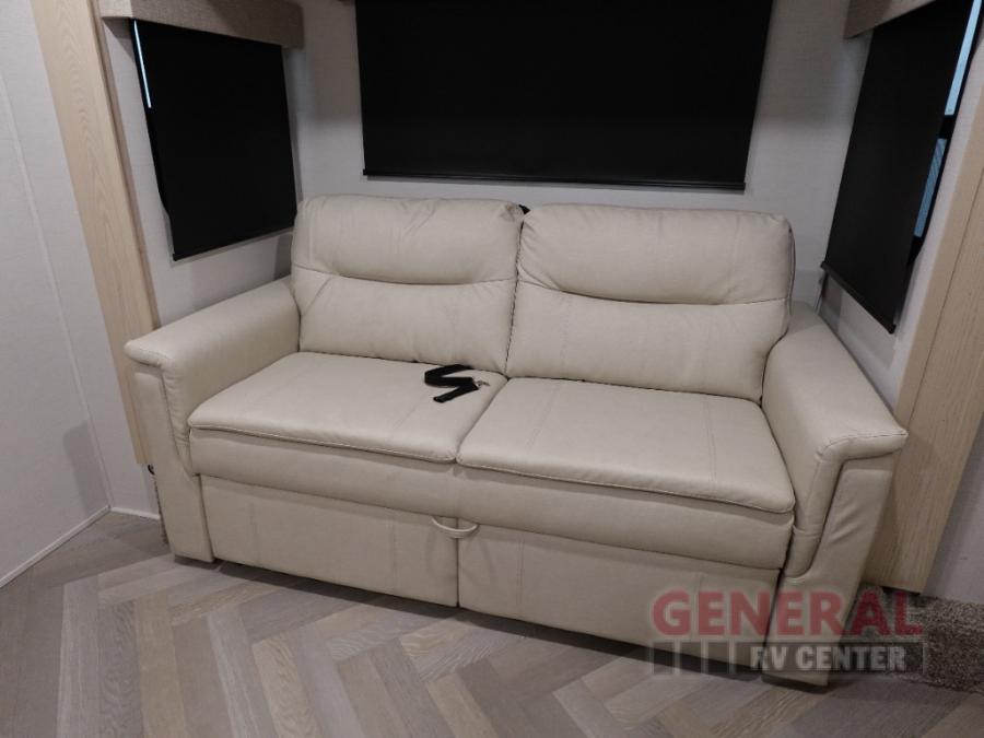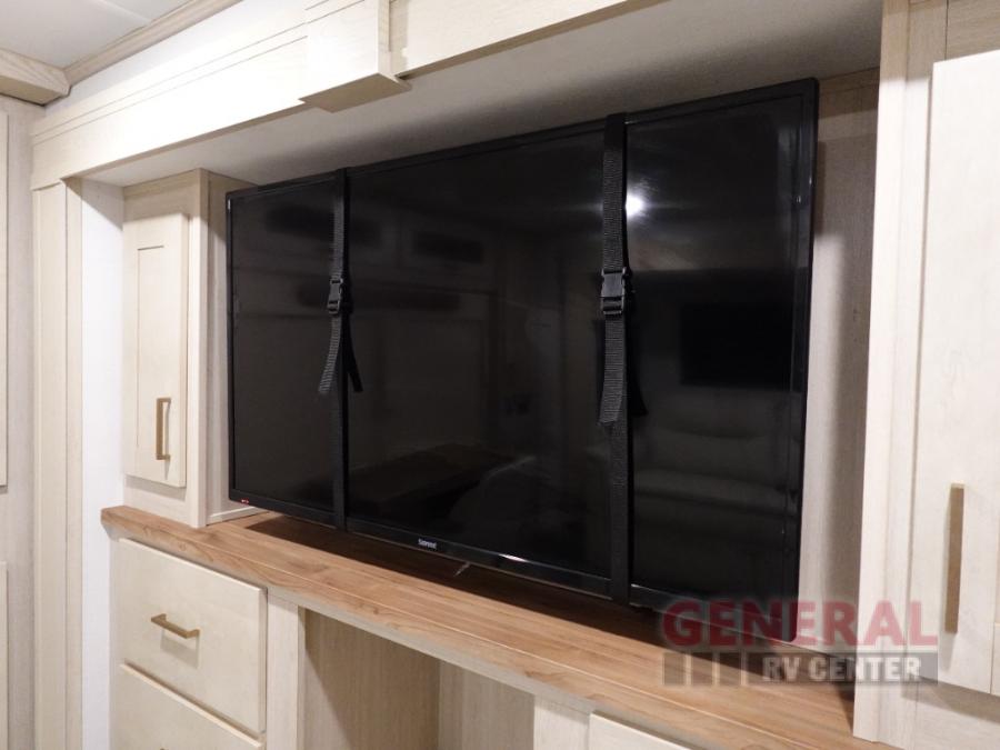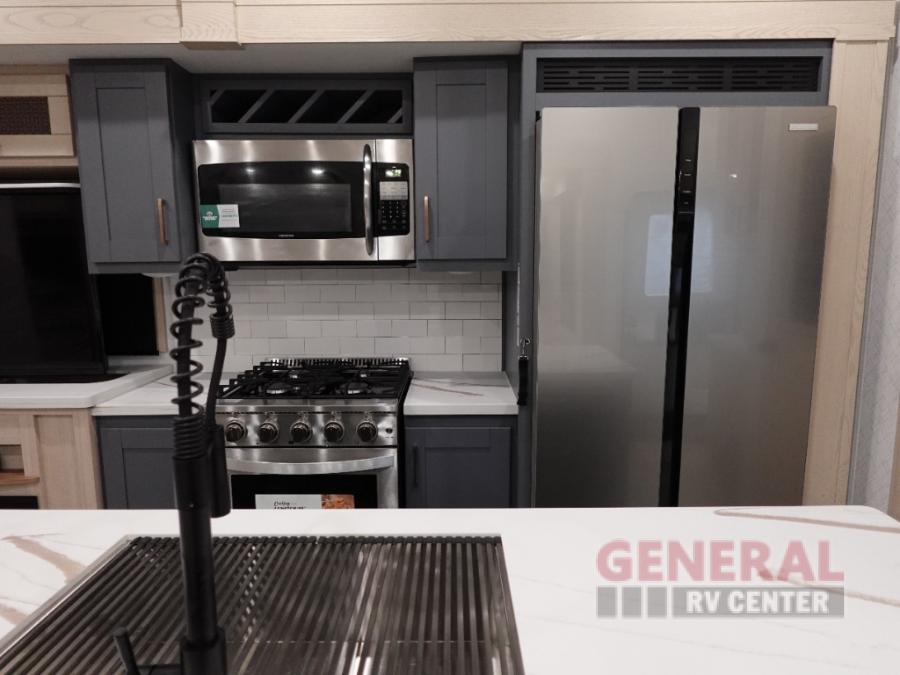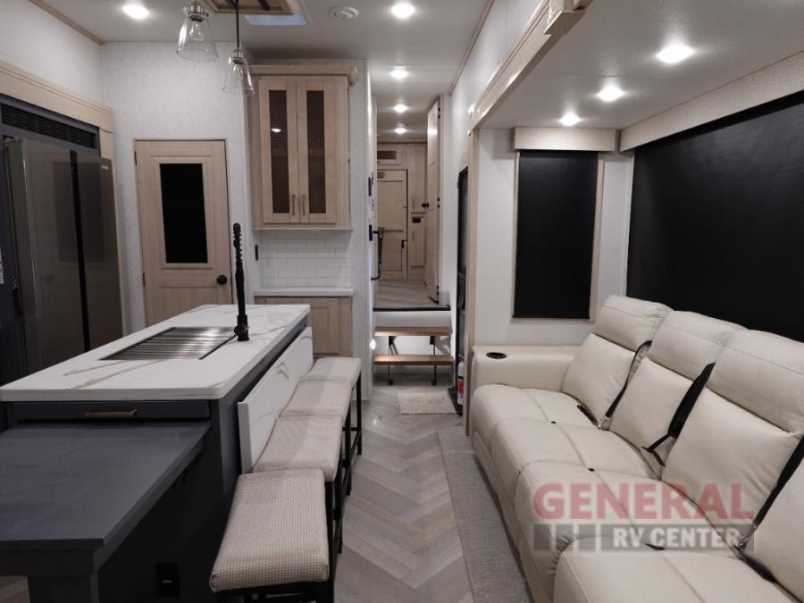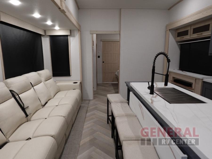 This fifth wheel is sure to wow you! You can easily invite your close neighbor friends along since there is a front den/bedroom that includes dual opposing slides, a Murphy bed/desk, a tri-fold sofa and a wardrobe, plus a full bath! You'll have the master suite towards the back all to yourselves, and here you'll find a king bed slide out, a bedroom fireplace, and a full rear bath, complete with dual bath sinks. There is even a linen closet with washer and dryer prep if you want the option to go full-time! In the morning, everyone can meet in the combined kitchen and living area as the chef whips up breakfast on the four burner cooktop. There is a gourmet island with a flip-up counter and a hidden dinette to provide everyone space to gather around. And you'll love the large sofa with pop-up chargers across from the hidden Smart TV and fireplace. Don't let this fifth wheel slip away!