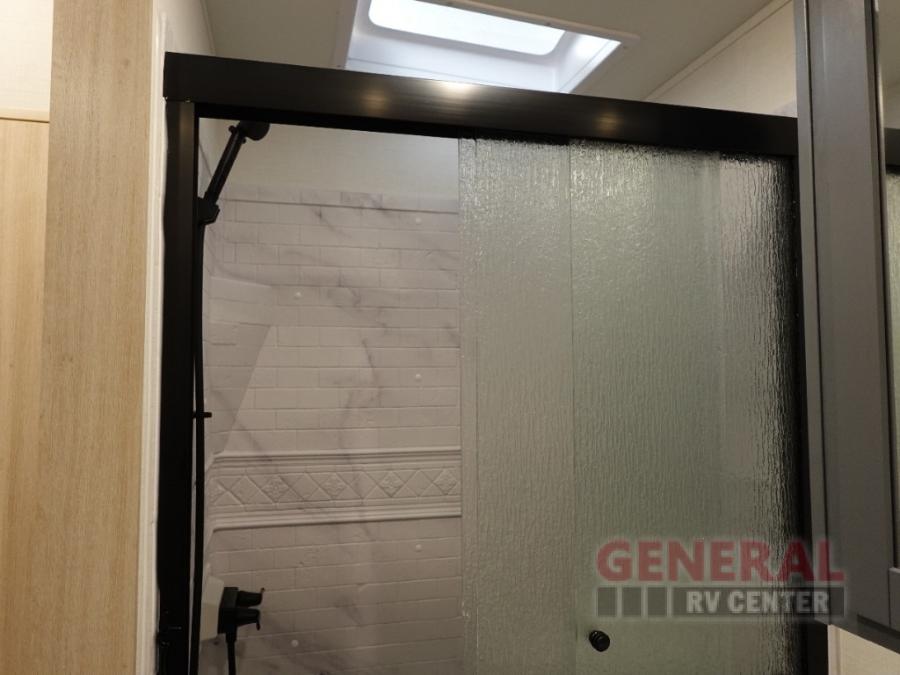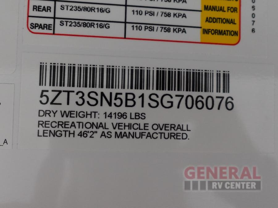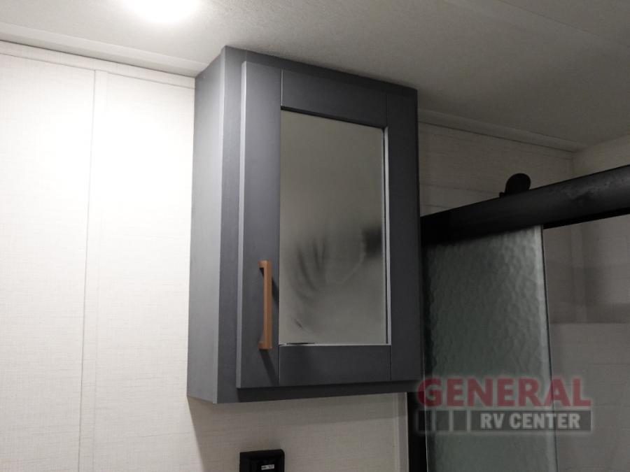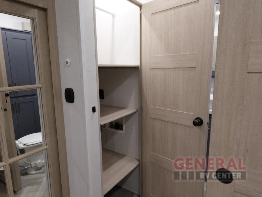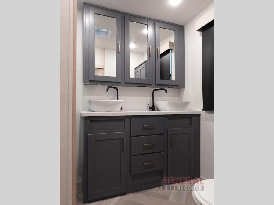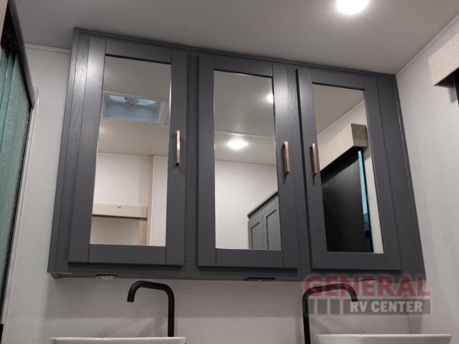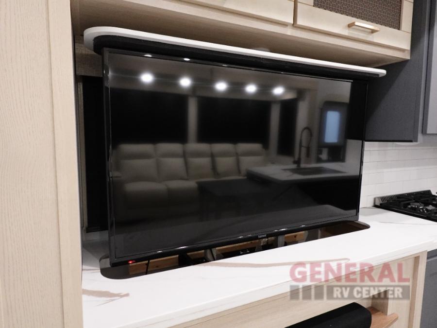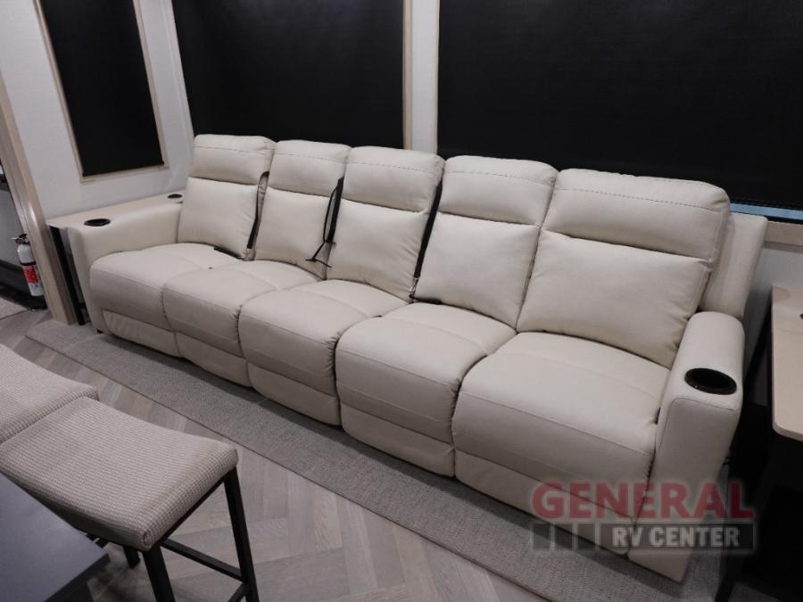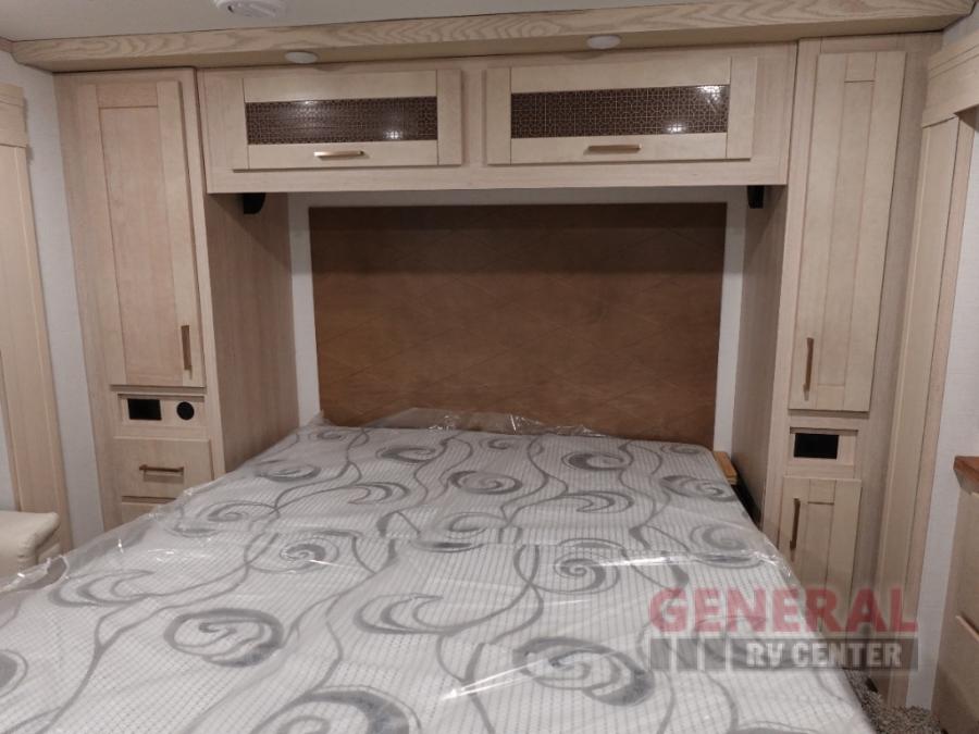 This fifth wheel is sure to wow you! You can easily invite your close neighbor friends along since there is a front den/bedroom that includes dual opposing slides, a Murphy bed/desk, a tri-fold sofa and a wardrobe, plus a full bath! You'll have the master suite towards the back all to yourselves, and here you'll find a king bed slide out, a bedroom fireplace, and a full rear bath, complete with dual bath sinks. There is even a linen closet with washer and dryer prep if you want the option to go full-time! In the morning, everyone can meet in the combined kitchen and living area as the chef whips up breakfast on the four burner cooktop. There is a gourmet island with a flip-up counter and a hidden dinette to provide everyone space to gather around. And you'll love the large sofa with pop-up chargers across from the hidden Smart TV and fireplace. Don't let this fifth wheel slip away!