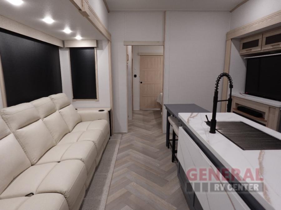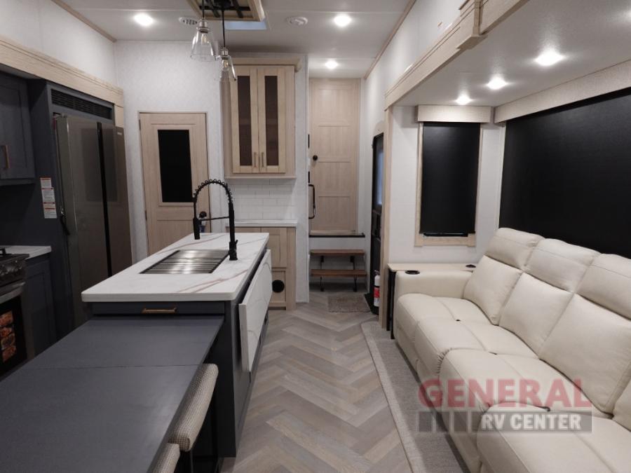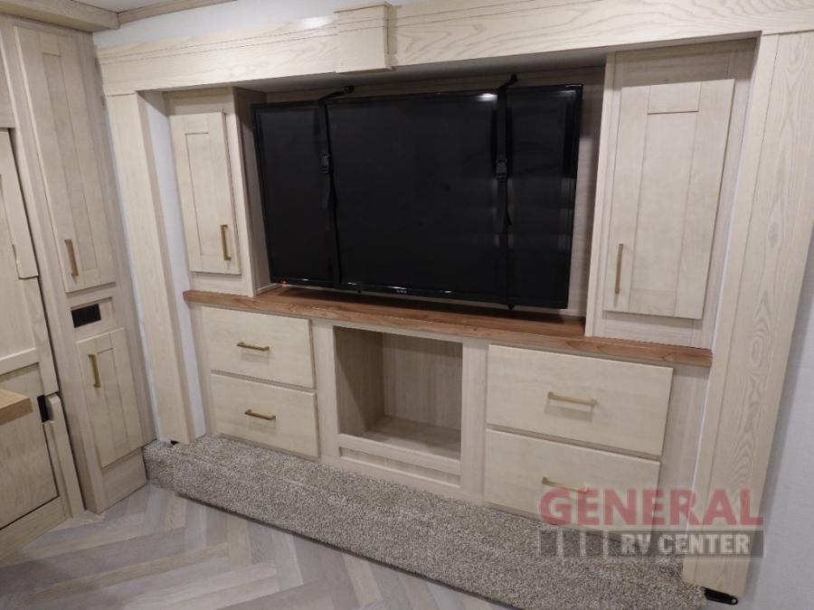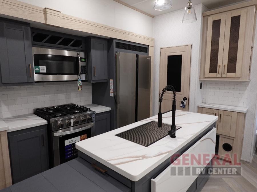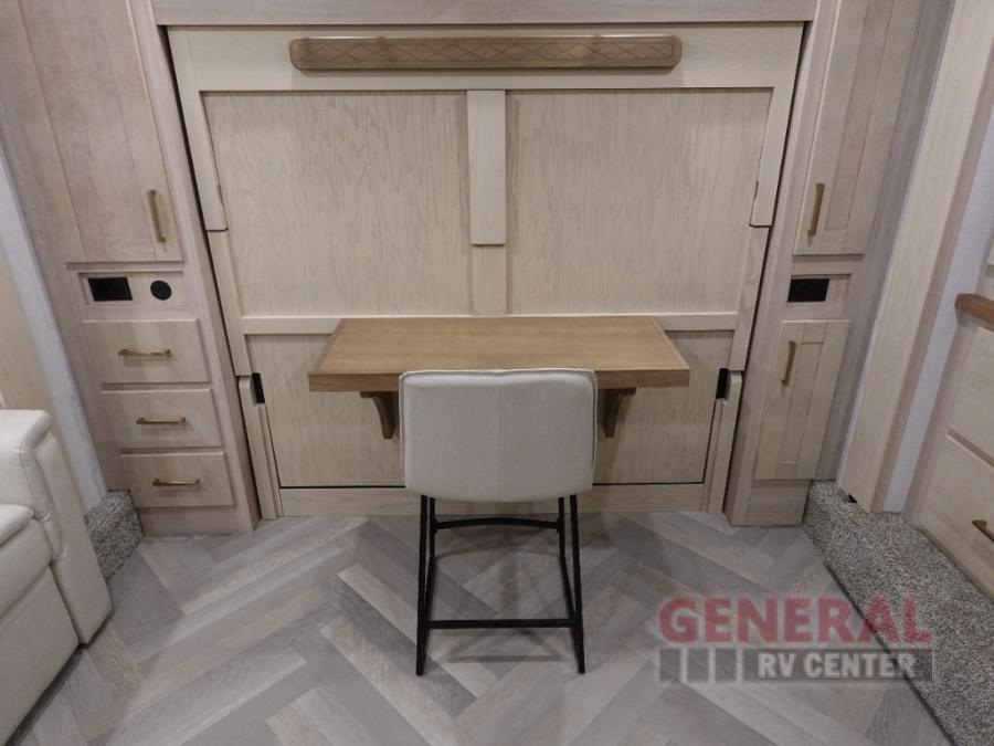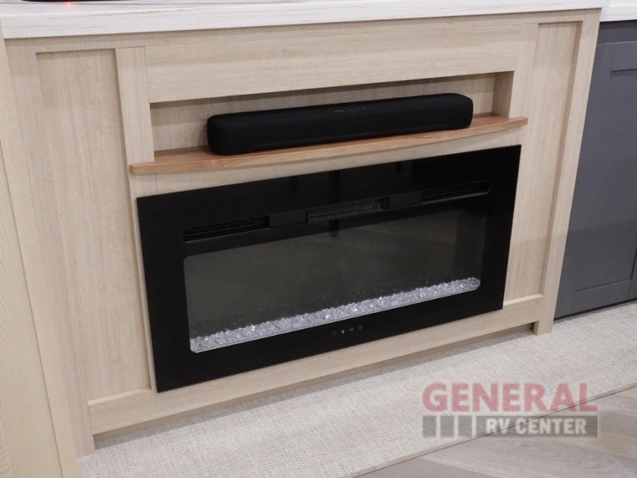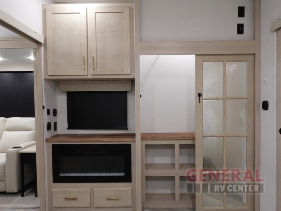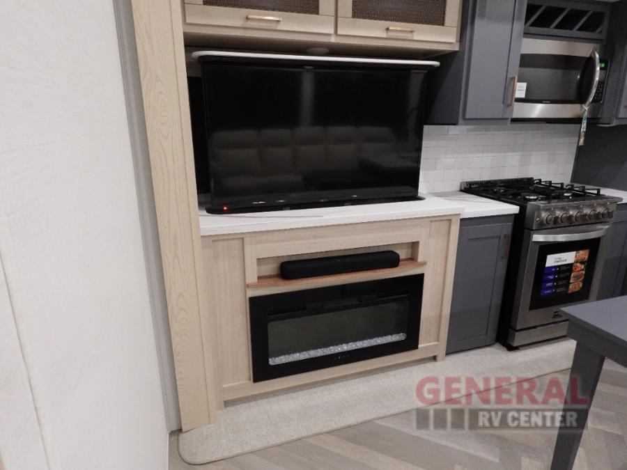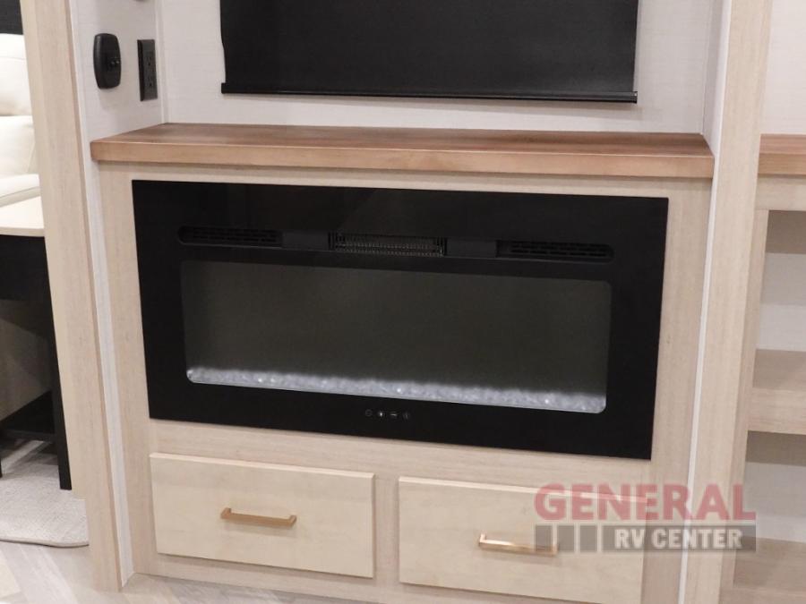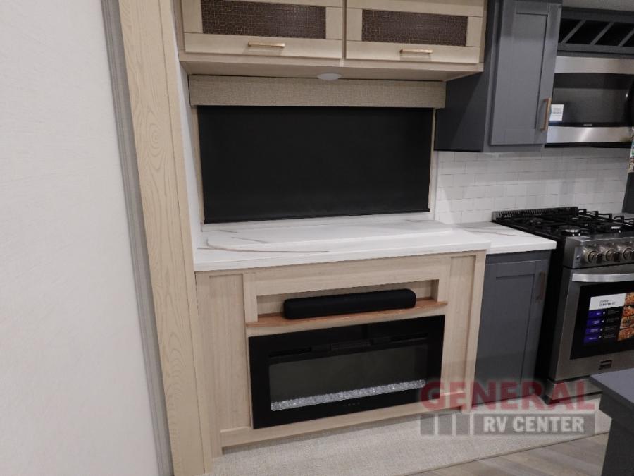 This fifth wheel is sure to wow you! You can easily invite your close neighbor friends along since there is a front den/bedroom that includes dual opposing slides, a Murphy bed/desk, a tri-fold sofa and a wardrobe, plus a full bath! You'll have the master suite towards the back all to yourselves, and here you'll find a king bed slide out, a bedroom fireplace, and a full rear bath, complete with dual bath sinks. There is even a linen closet with washer and dryer prep if you want the option to go full-time! In the morning, everyone can meet in the combined kitchen and living area as the chef whips up breakfast on the four burner cooktop. There is a gourmet island with a flip-up counter and a hidden dinette to provide everyone space to gather around. And you'll love the large sofa with pop-up chargers across from the hidden Smart TV and fireplace. Don't let this fifth wheel slip away!