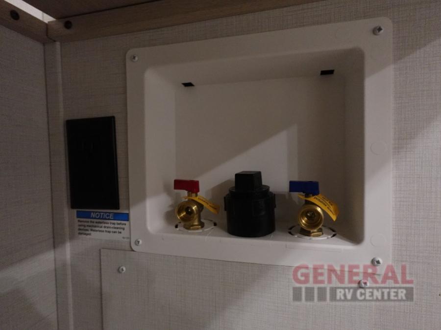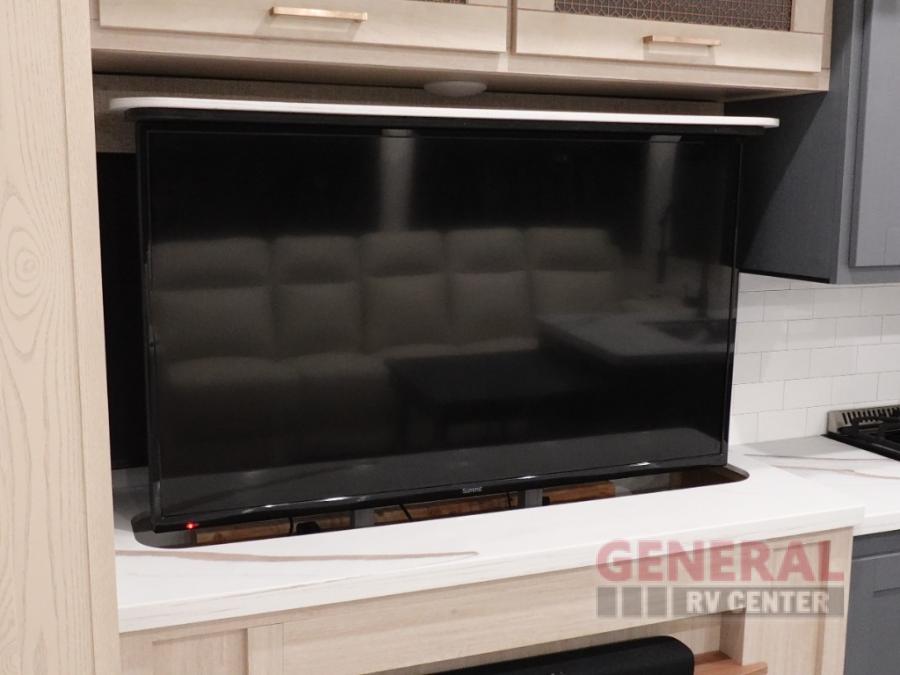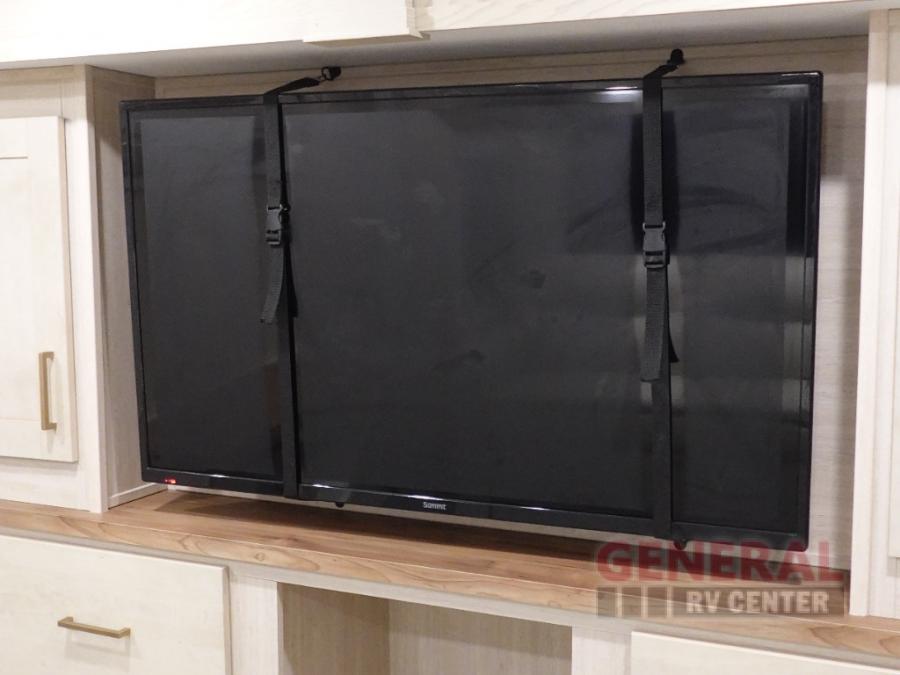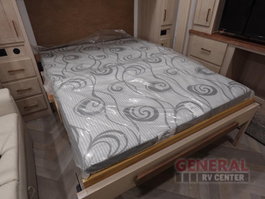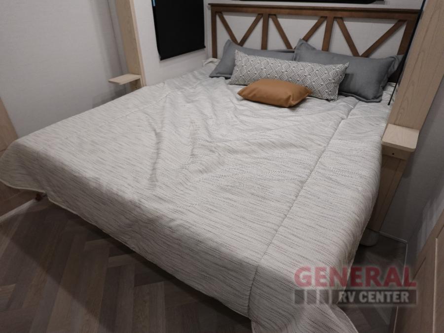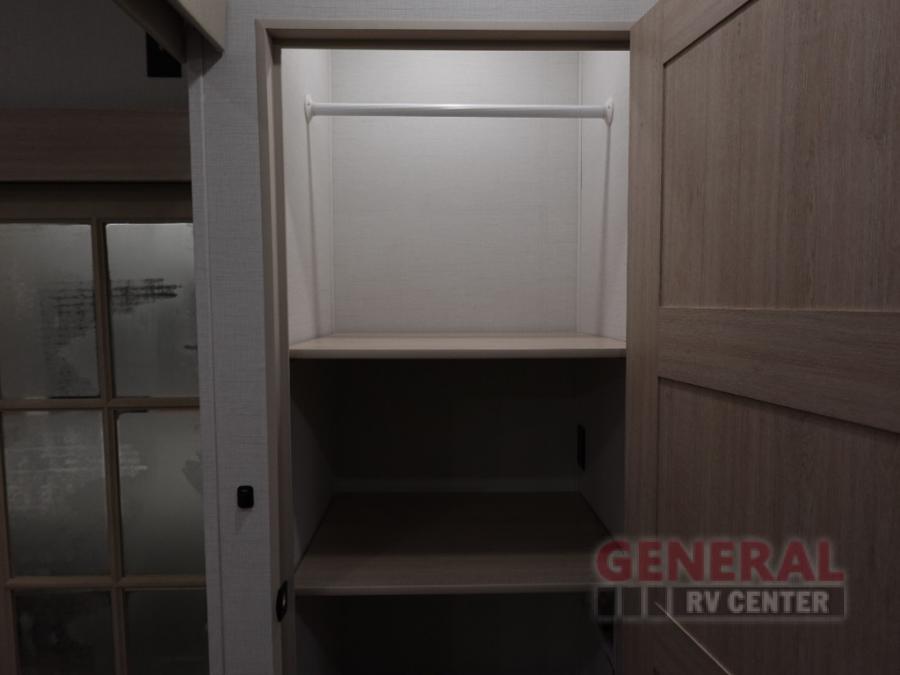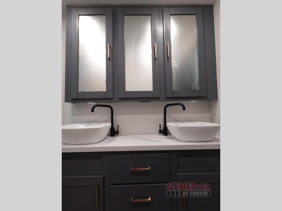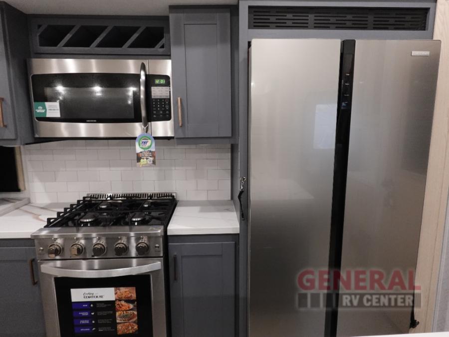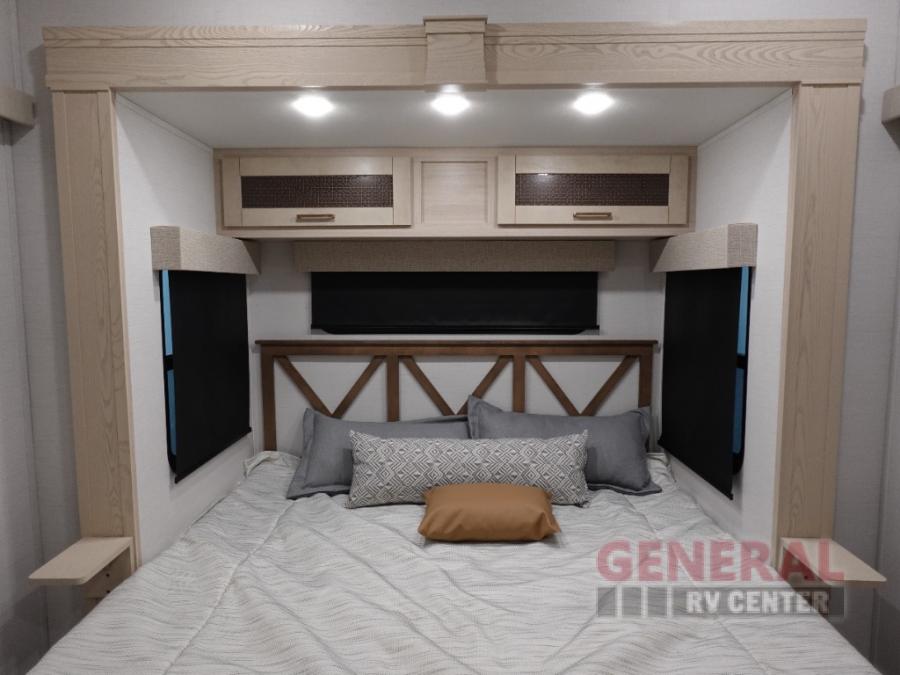 This fifth wheel is sure to wow you! You can easily invite your close neighbor friends along since there is a front den/bedroom that includes dual opposing slides, a Murphy bed/desk, a tri-fold sofa and a wardrobe, plus a full bath! You'll have the master suite towards the back all to yourselves, and here you'll find a king bed slide out, a bedroom fireplace, and a full rear bath, complete with dual bath sinks. There is even a linen closet with washer and dryer prep if you want the option to go full-time! In the morning, everyone can meet in the combined kitchen and living area as the chef whips up breakfast on the four burner cooktop. There is a gourmet island with a flip-up counter and a hidden dinette to provide everyone space to gather around. And you'll love the large sofa with pop-up chargers across from the hidden Smart TV and fireplace. Don't let this fifth wheel slip away!