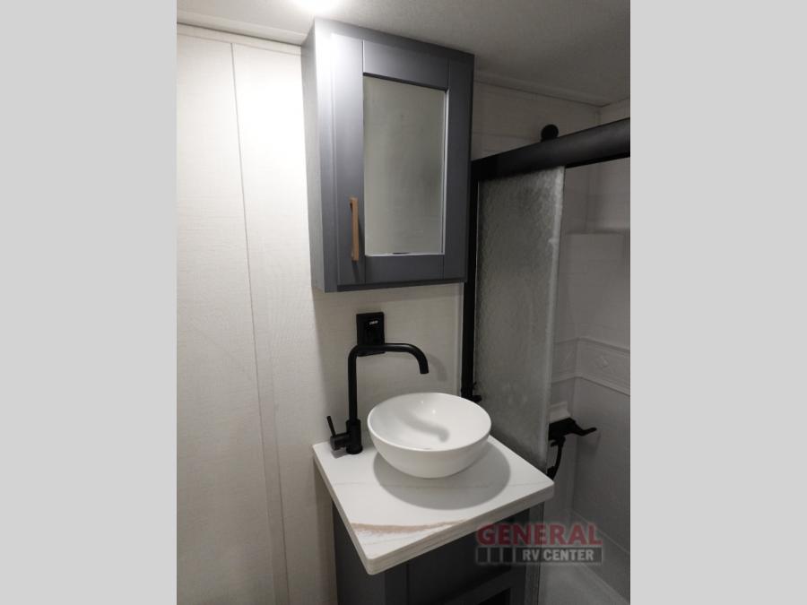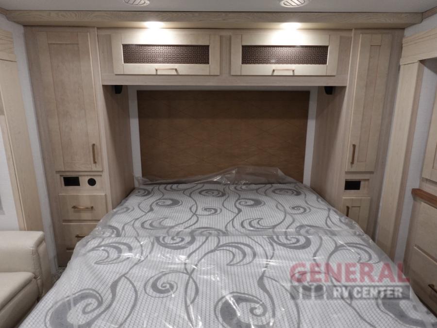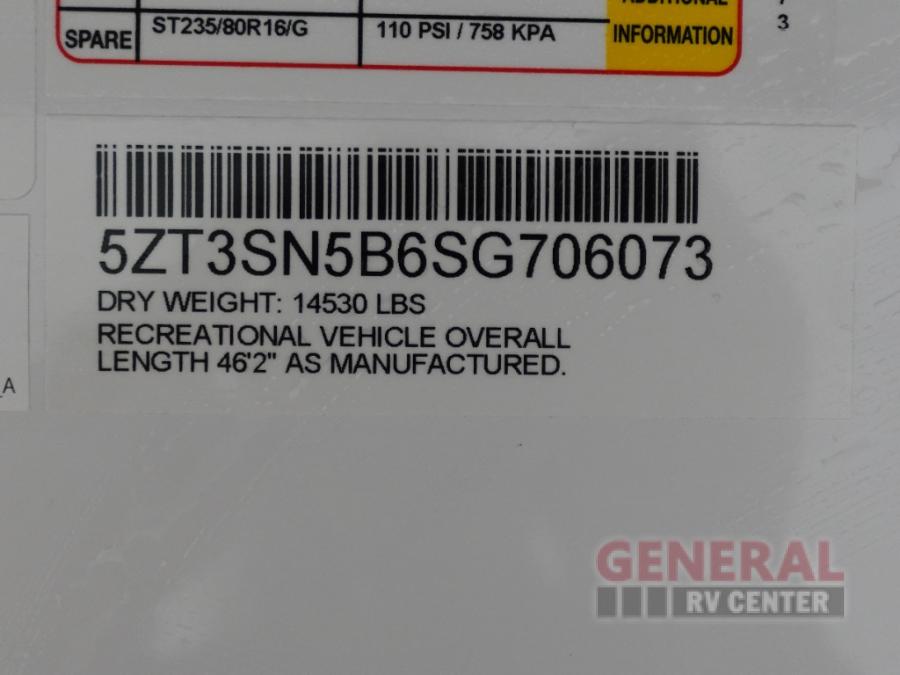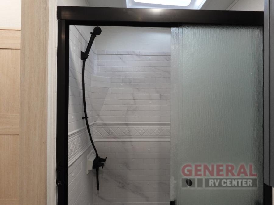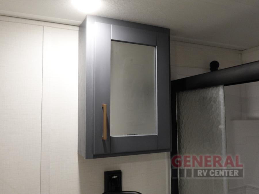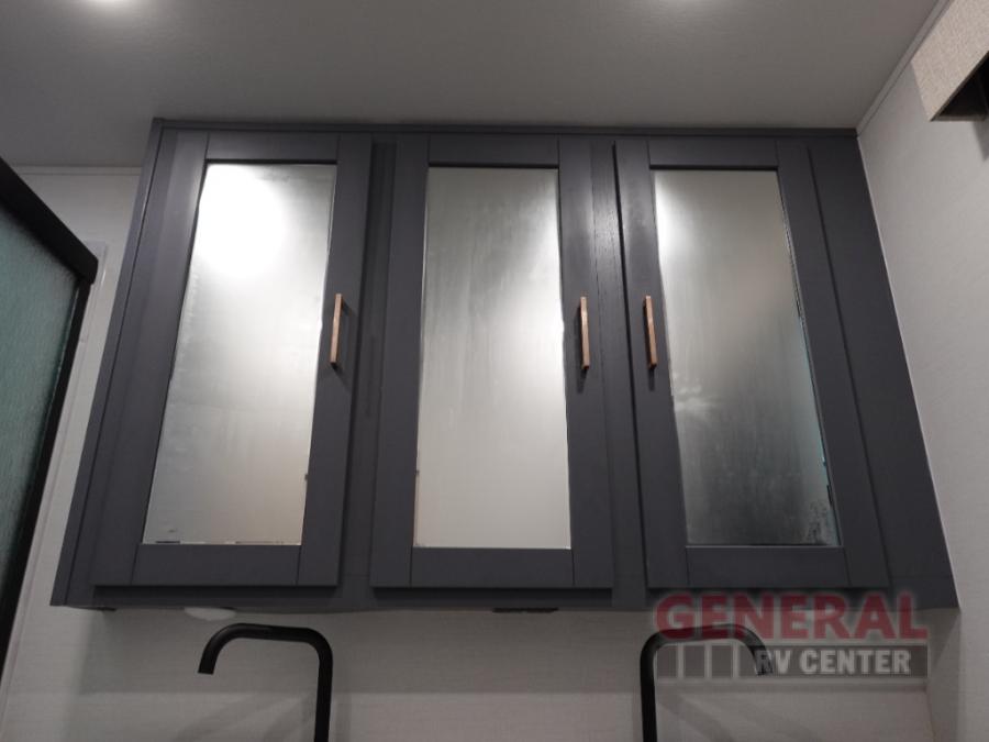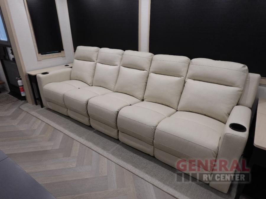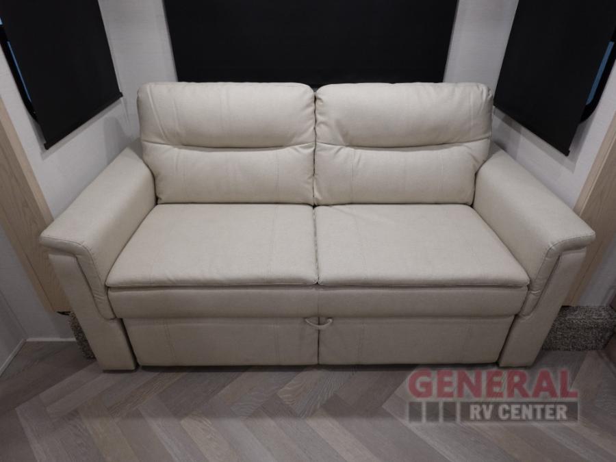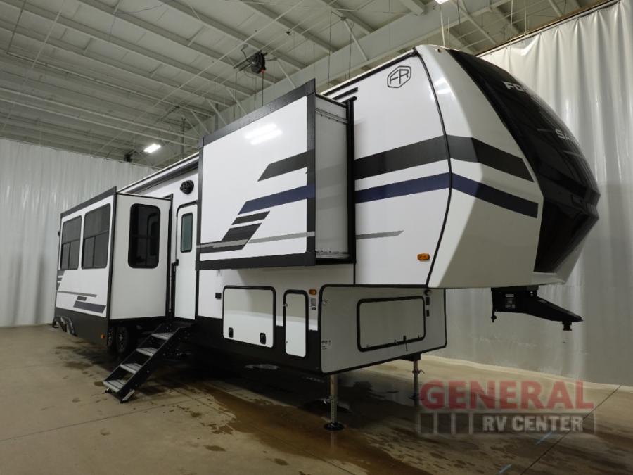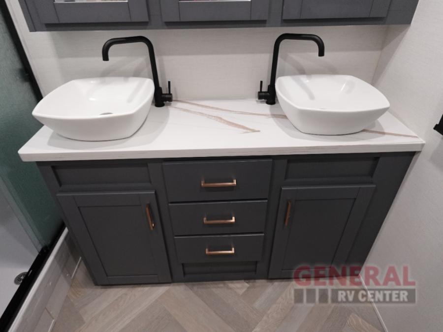 This fifth wheel is sure to wow you! You can easily invite your close neighbor friends along since there is a front den/bedroom that includes dual opposing slides, a Murphy bed/desk, a tri-fold sofa and a wardrobe, plus a full bath! You'll have the master suite towards the back all to yourselves, and here you'll find a king bed slide out, a bedroom fireplace, and a full rear bath, complete with dual bath sinks. There is even a linen closet with washer and dryer prep if you want the option to go full-time! In the morning, everyone can meet in the combined kitchen and living area as the chef whips up breakfast on the four burner cooktop. There is a gourmet island with a flip-up counter and a hidden dinette to provide everyone space to gather around. And you'll love the large sofa with pop-up chargers across from the hidden Smart TV and fireplace. Don't let this fifth wheel slip away!
