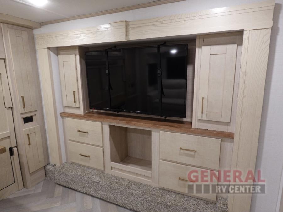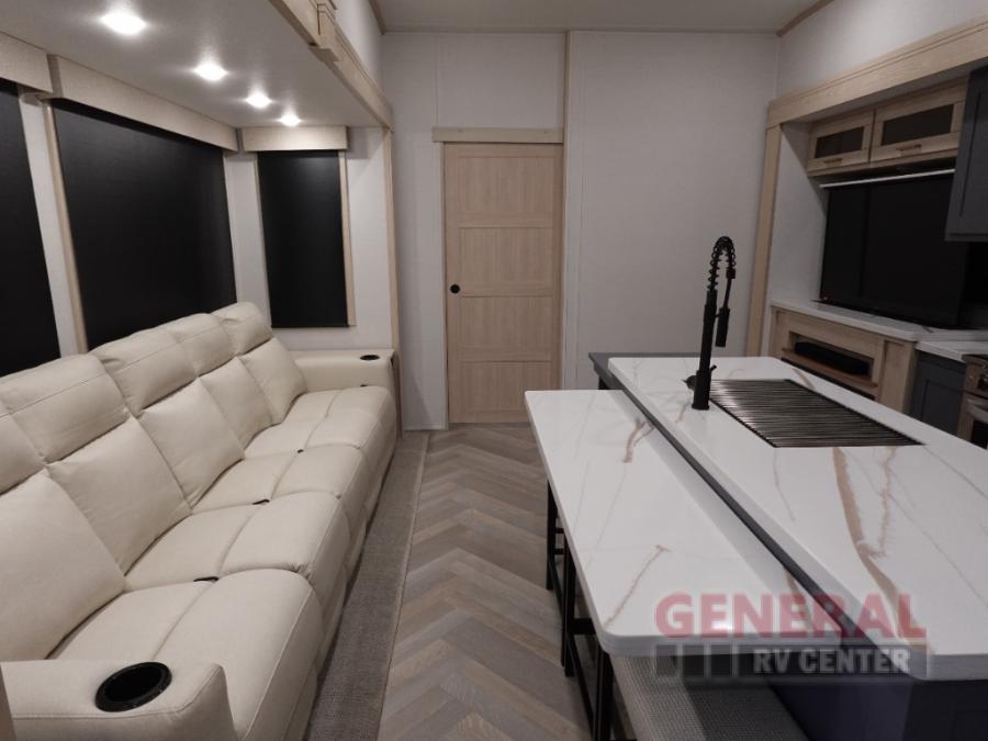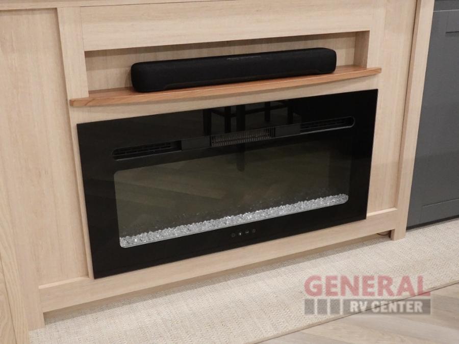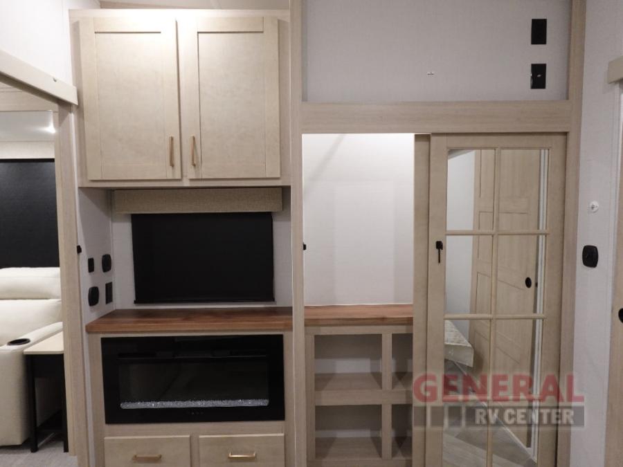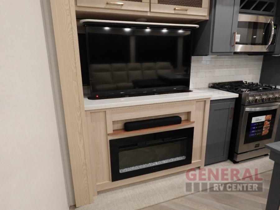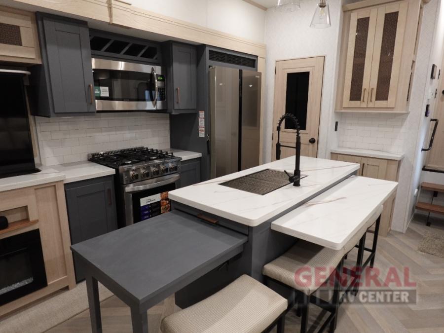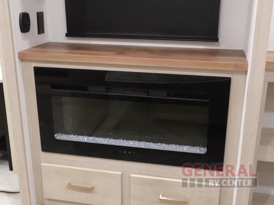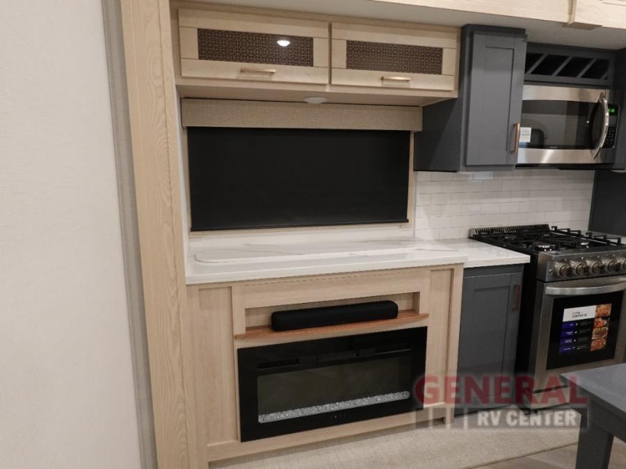 This fifth wheel is sure to wow you! You can easily invite your close neighbor friends along since there is a front den/bedroom that includes dual opposing slides, a Murphy bed/desk, a tri-fold sofa and a wardrobe, plus a full bath! You'll have the master suite towards the back all to yourselves, and here you'll find a king bed slide out, a bedroom fireplace, and a full rear bath, complete with dual bath sinks. There is even a linen closet with washer and dryer prep if you want the option to go full-time! In the morning, everyone can meet in the combined kitchen and living area as the chef whips up breakfast on the four burner cooktop. There is a gourmet island with a flip-up counter and a hidden dinette to provide everyone space to gather around. And you'll love the large sofa with pop-up chargers across from the hidden Smart TV and fireplace. Don't let this fifth wheel slip away!