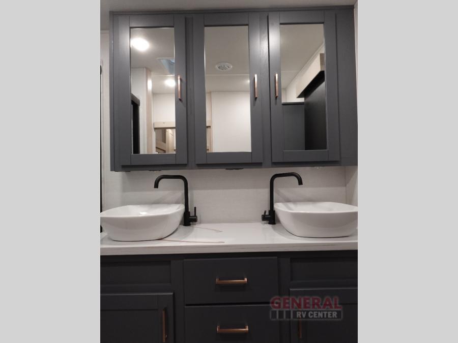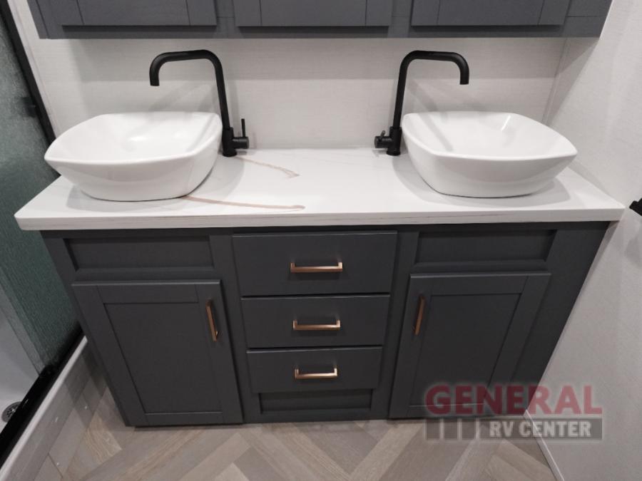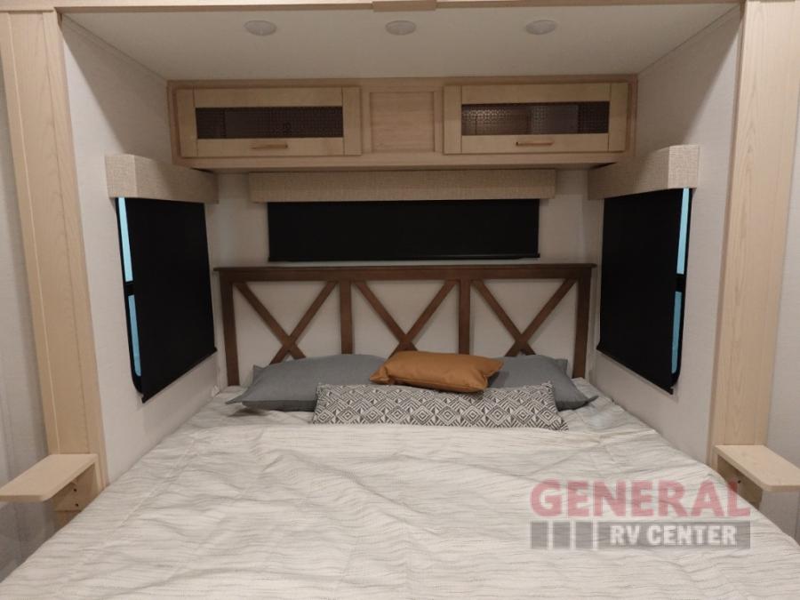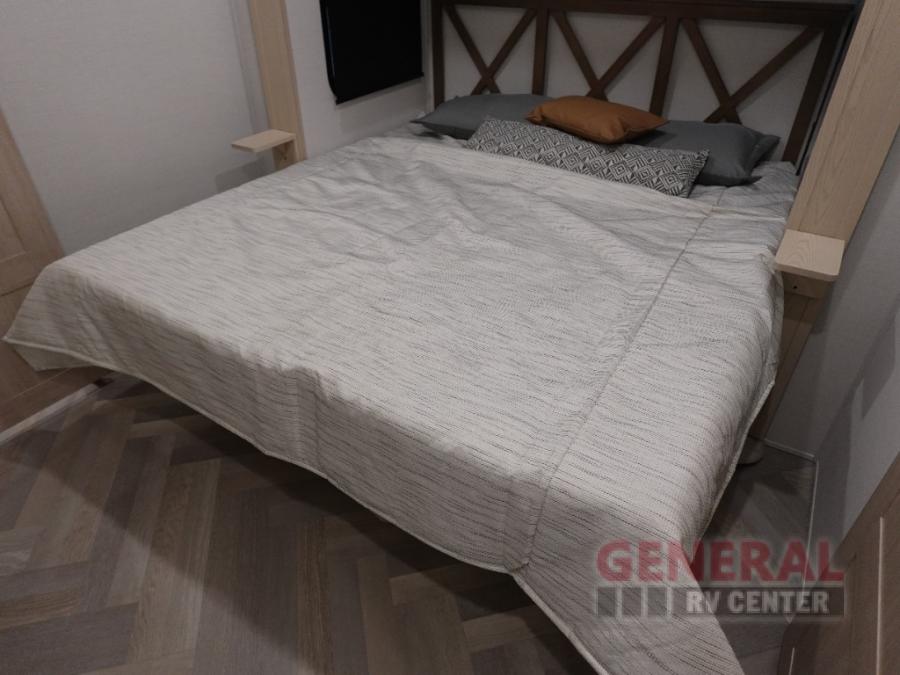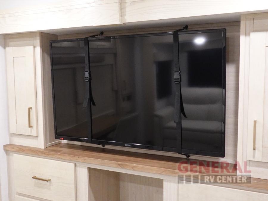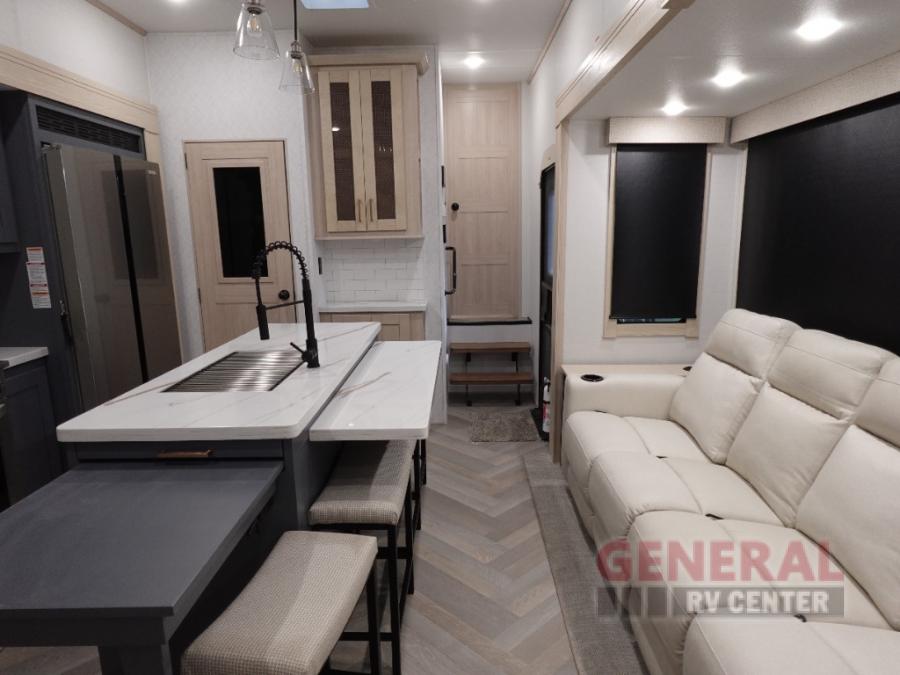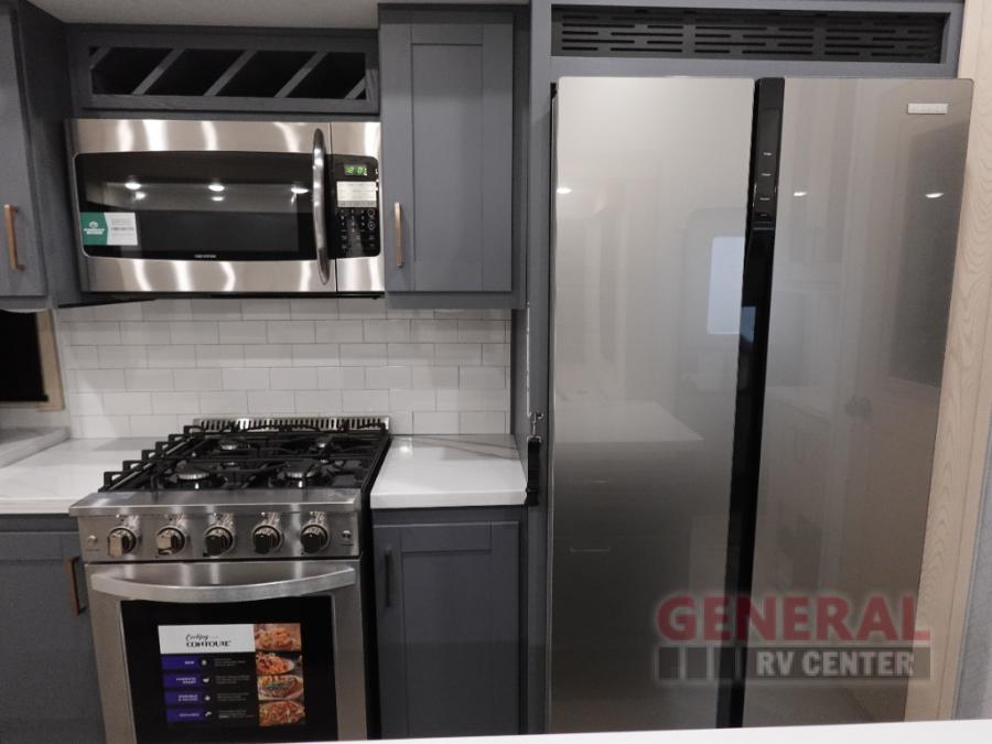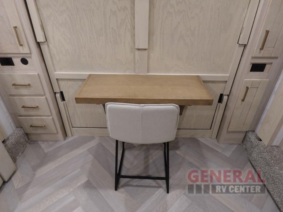 This fifth wheel is sure to wow you! You can easily invite your close neighbor friends along since there is a front den/bedroom that includes dual opposing slides, a Murphy bed/desk, a tri-fold sofa and a wardrobe, plus a full bath! You'll have the master suite towards the back all to yourselves, and here you'll find a king bed slide out, a bedroom fireplace, and a full rear bath, complete with dual bath sinks. There is even a linen closet with washer and dryer prep if you want the option to go full-time! In the morning, everyone can meet in the combined kitchen and living area as the chef whips up breakfast on the four burner cooktop. There is a gourmet island with a flip-up counter and a hidden dinette to provide everyone space to gather around. And you'll love the large sofa with pop-up chargers across from the hidden Smart TV and fireplace. Don't let this fifth wheel slip away!