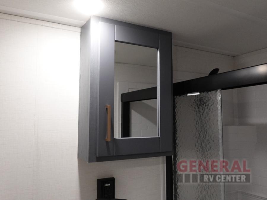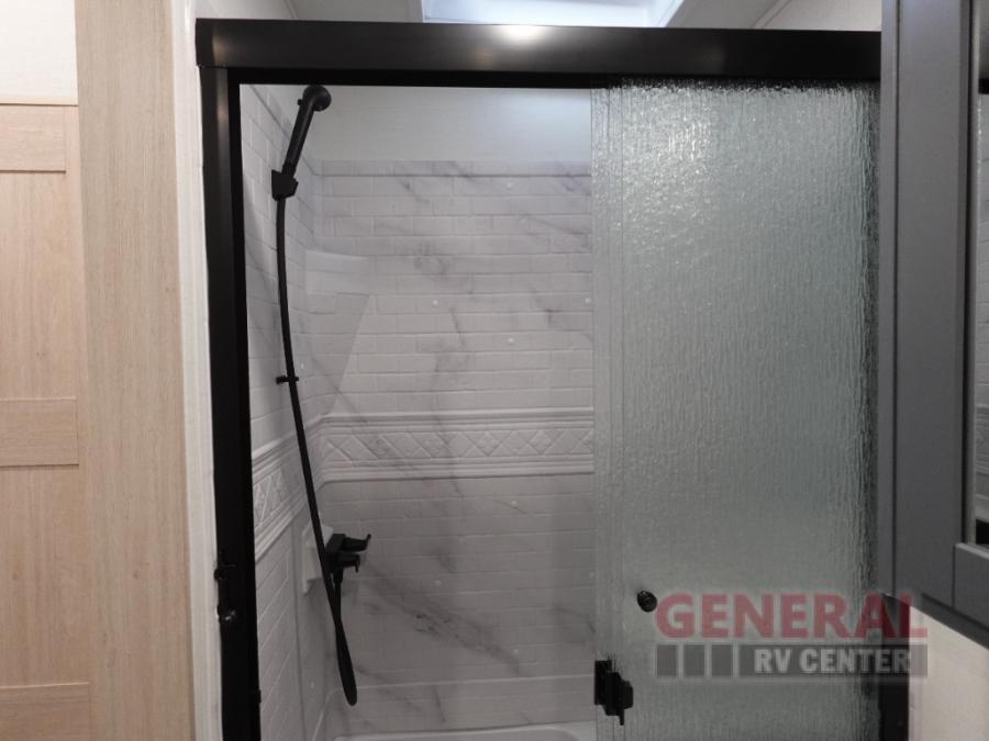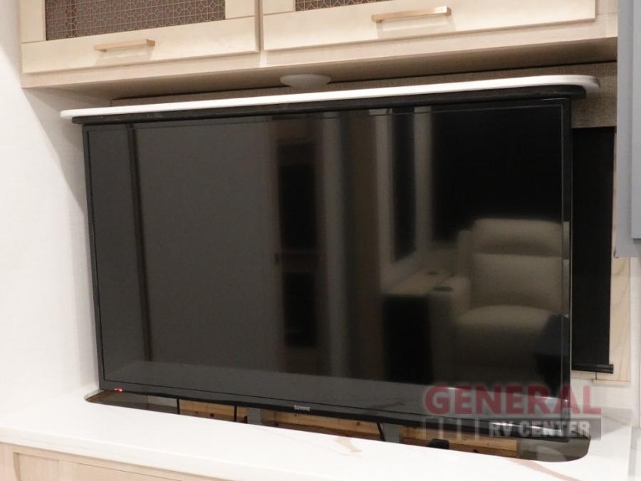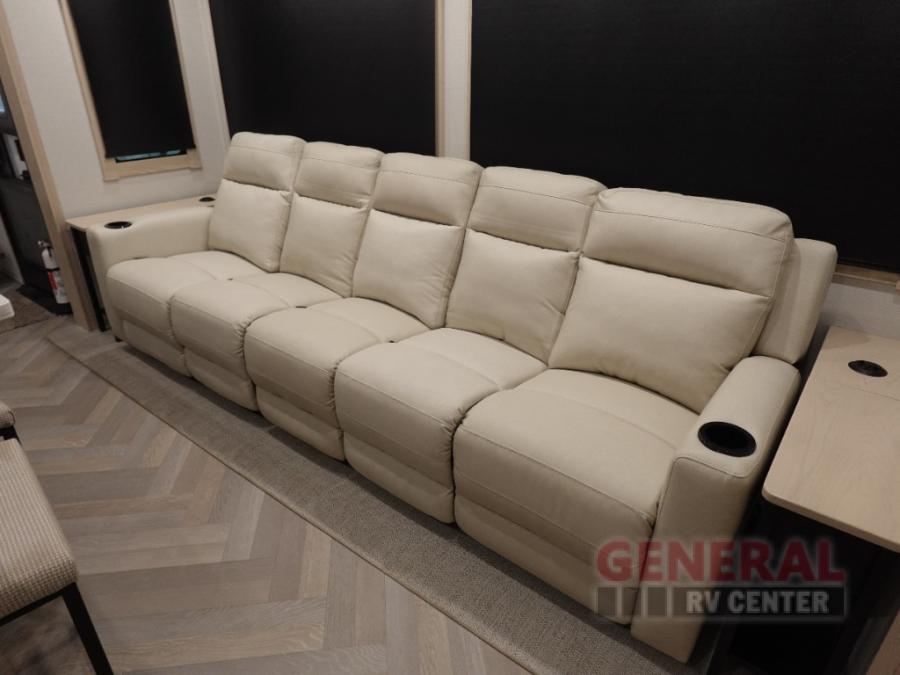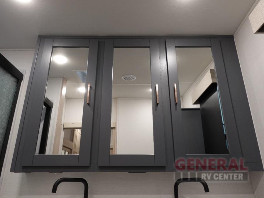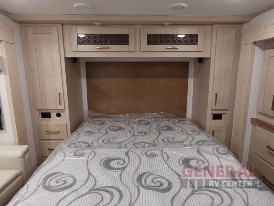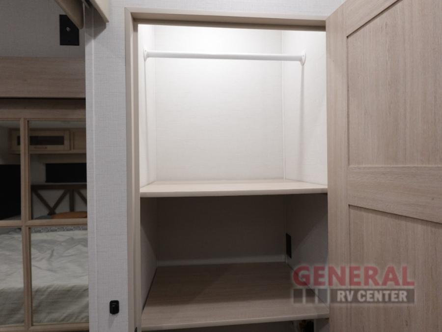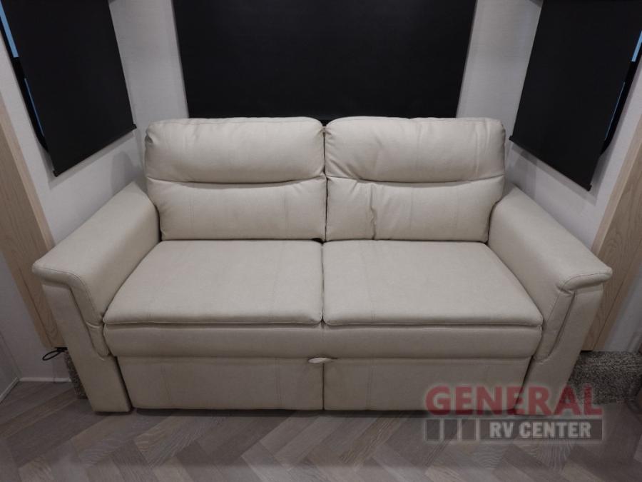This fifth wheel is sure to wow you! You can easily invite your close neighbor friends along since there is a front den/bedroom that includes dual opposing slides, a Murphy bed/desk, a tri-fold sofa and a wardrobe, plus a full bath! You'll have the master suite towards the back all to yourselves, and here you'll find a king bed slide out, a bedroom fireplace, and a full rear bath, complete with dual bath sinks. There is even a linen closet with washer and dryer prep if you want the option to go full-time! In the morning, everyone can meet in the combined kitchen and living area as the chef whips up breakfast on the four burner cooktop. There is a gourmet island with a flip-up counter and a hidden dinette to provide everyone space to gather around. And you'll love the large sofa with pop-up chargers across from the hidden Smart TV and fireplace. Don't let this fifth wheel slip away!