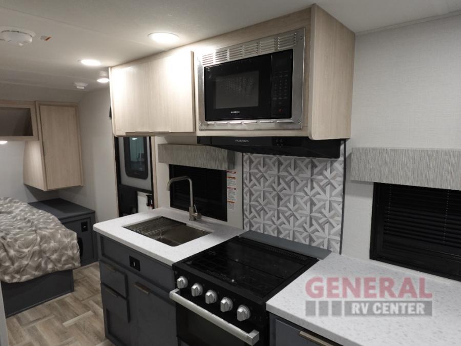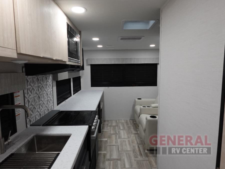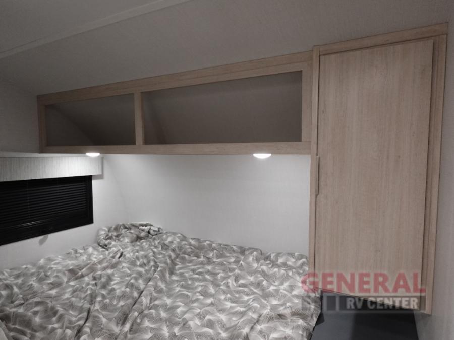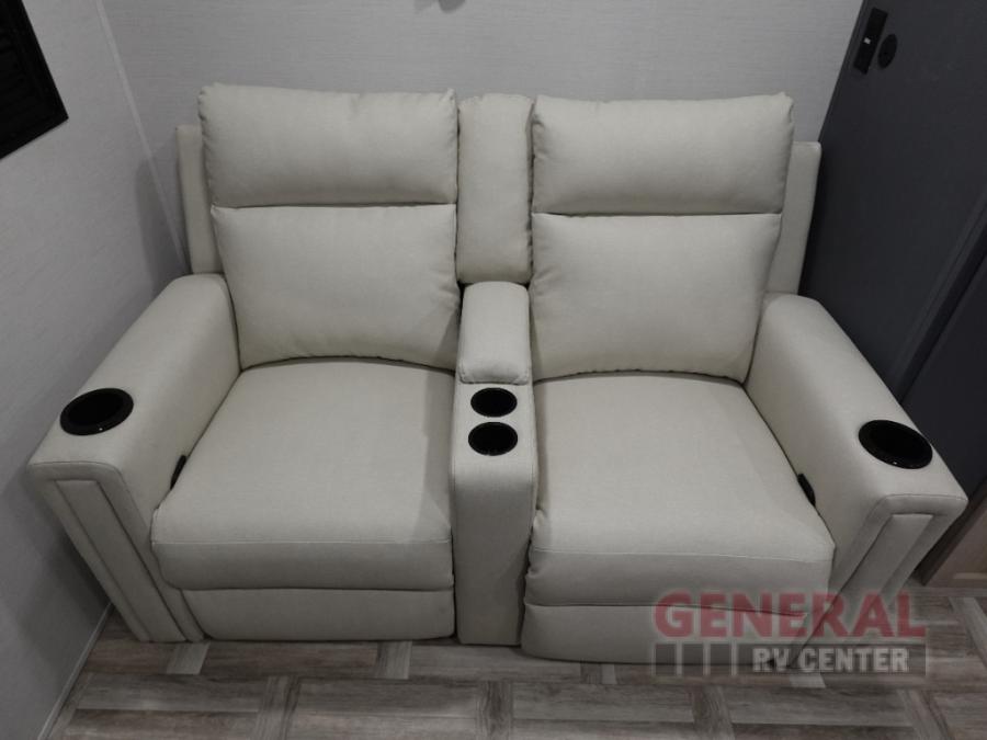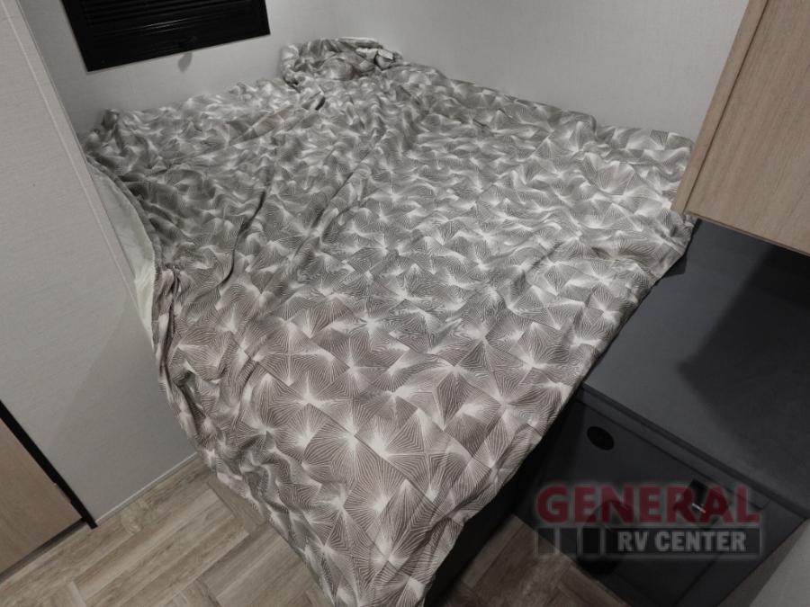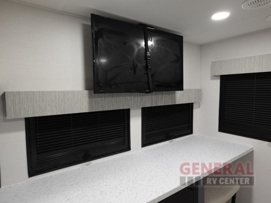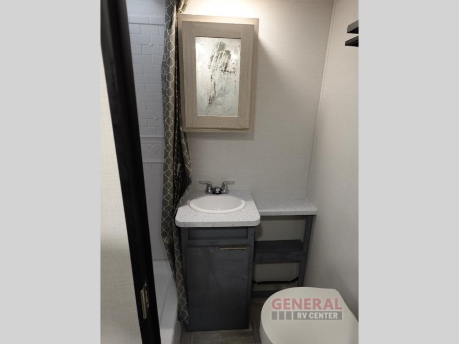 This couple's trailer is perfect for weekend trips to the lake! You'll love waking up each morning on the front queen bed instead of on an air mattress, plus there are overhead cabinets and a wardrobe for your things. The theater seating provides a place for you to relax in the evenings, and the bartop with two stools will be the perfect place to dine together. Making meals will be easier than ever with a three burner cooktop and microwave oven, plus there is a refrigerator and pantry for food storage. And don't overlook the exterior with its pass-thru storage and 15' awning!