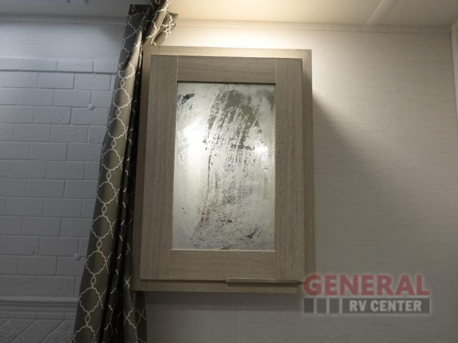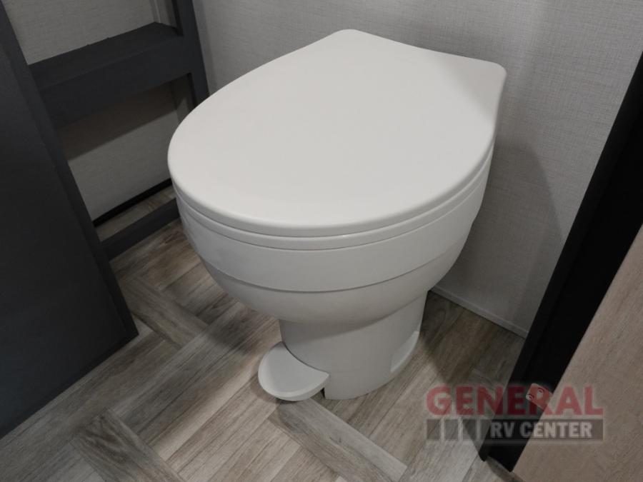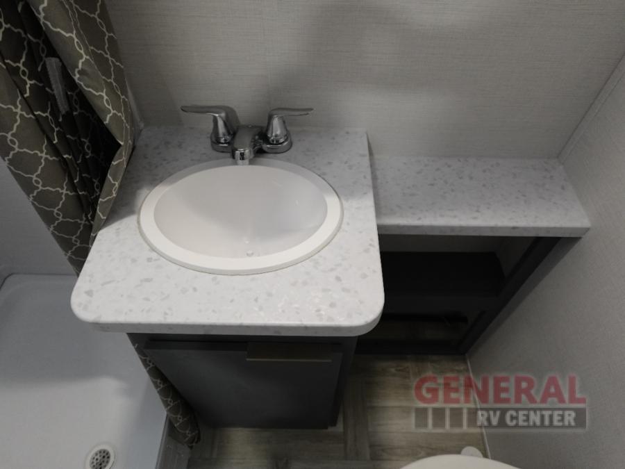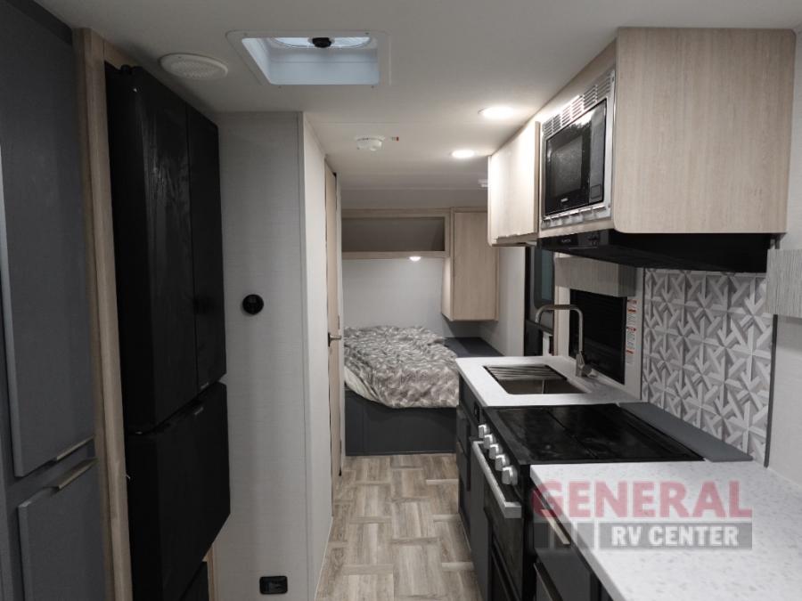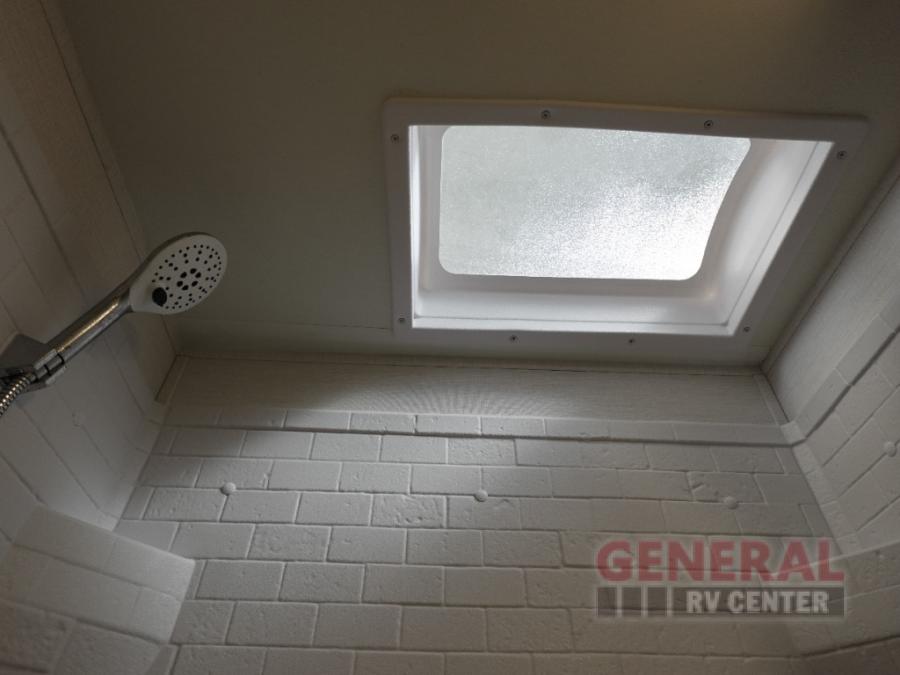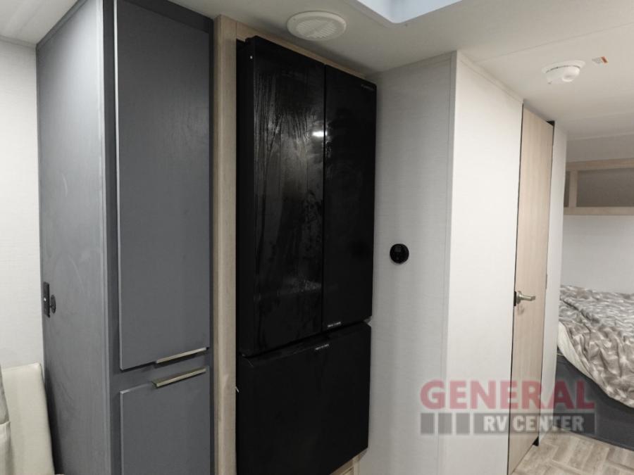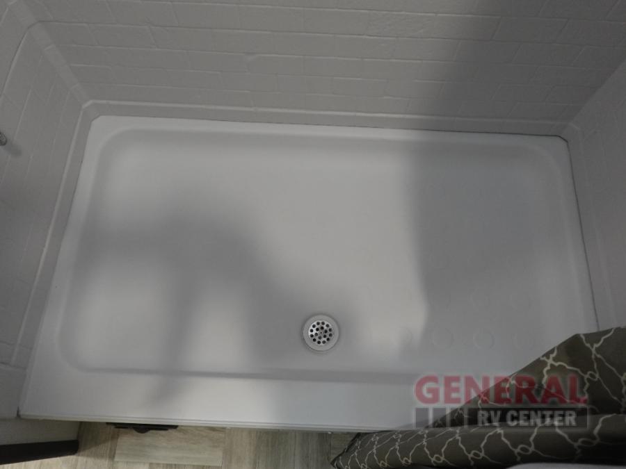 This couple's trailer is perfect for weekend trips to the lake! You'll love waking up each morning on the front queen bed instead of on an air mattress, plus there are overhead cabinets and a wardrobe for your things. The theater seating provides a place for you to relax in the evenings, and the bartop with two stools will be the perfect place to dine together. Making meals will be easier than ever with a three burner cooktop and microwave oven, plus there is a refrigerator and pantry for food storage. And don't overlook the exterior with its pass-thru storage and 15' awning!