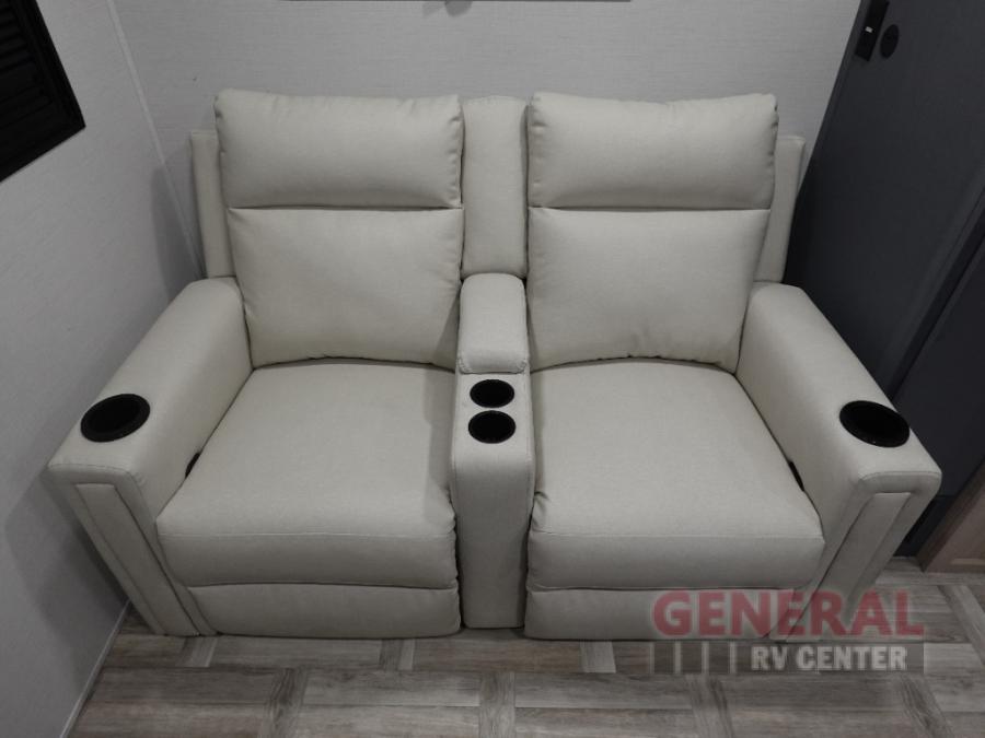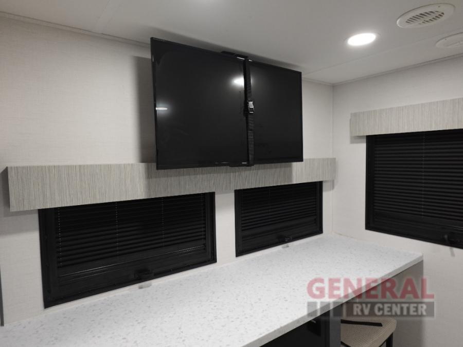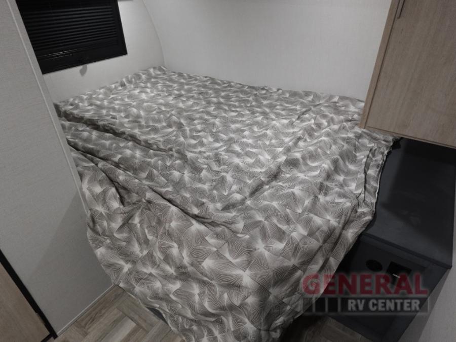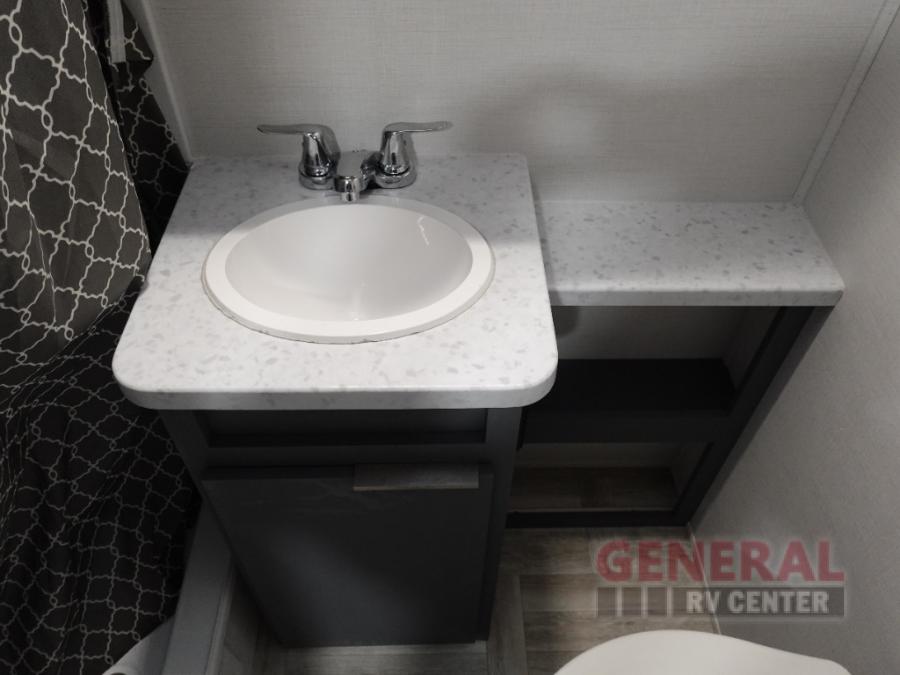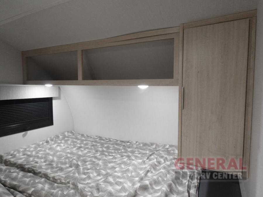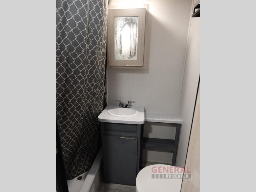 This couple's trailer is perfect for weekend trips to the lake! You'll love waking up each morning on the front queen bed instead of on an air mattress, plus there are overhead cabinets and a wardrobe for your things. The theater seating provides a place for you to relax in the evenings, and the bartop with two stools will be the perfect place to dine together. Making meals will be easier than ever with a three burner cooktop and microwave oven, plus there is a refrigerator and pantry for food storage. And don't overlook the exterior with its pass-thru storage and 15' awning!
