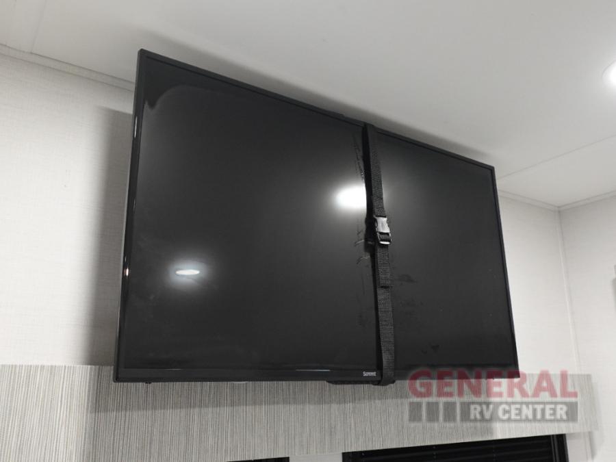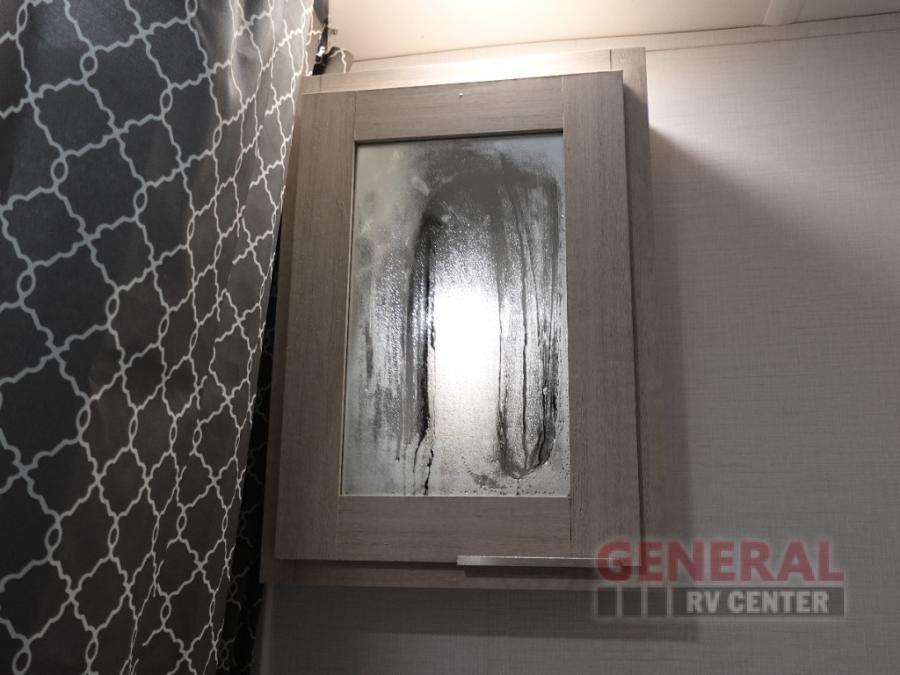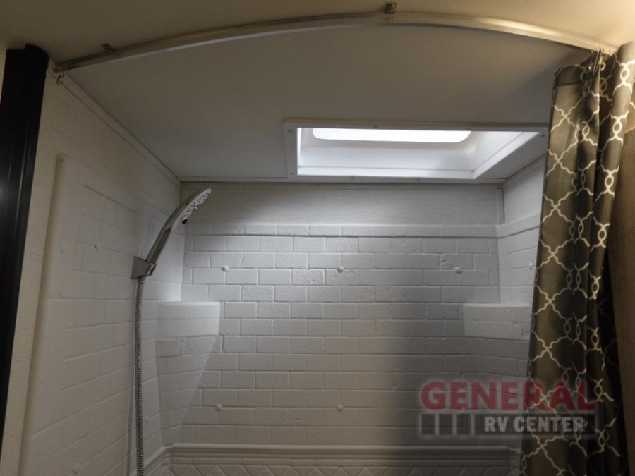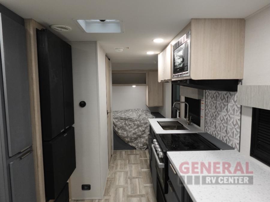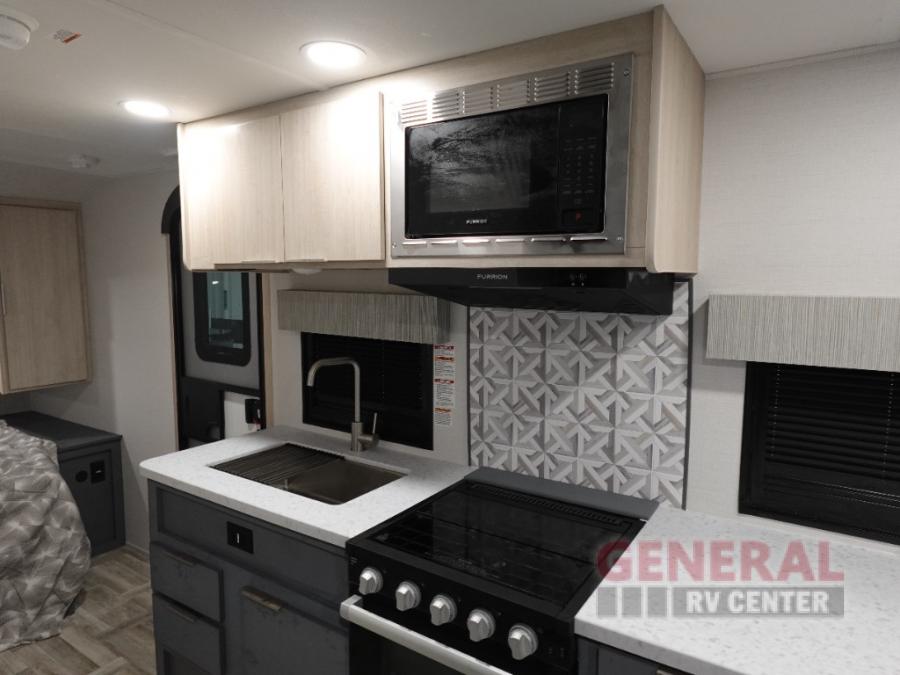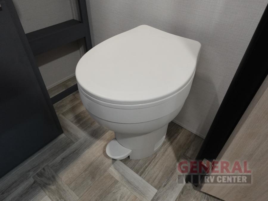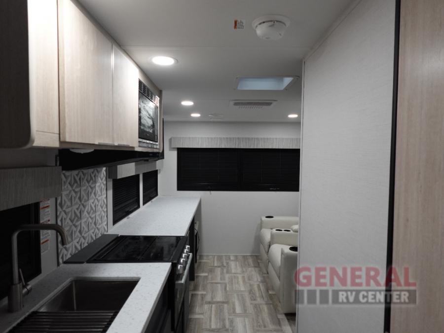 This couple's trailer is perfect for weekend trips to the lake! You'll love waking up each morning on the front queen bed instead of on an air mattress, plus there are overhead cabinets and a wardrobe for your things. The theater seating provides a place for you to relax in the evenings, and the bartop with two stools will be the perfect place to dine together. Making meals will be easier than ever with a three burner cooktop and microwave oven, plus there is a refrigerator and pantry for food storage. And don't overlook the exterior with its pass-thru storage and 15' awning!