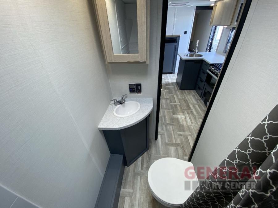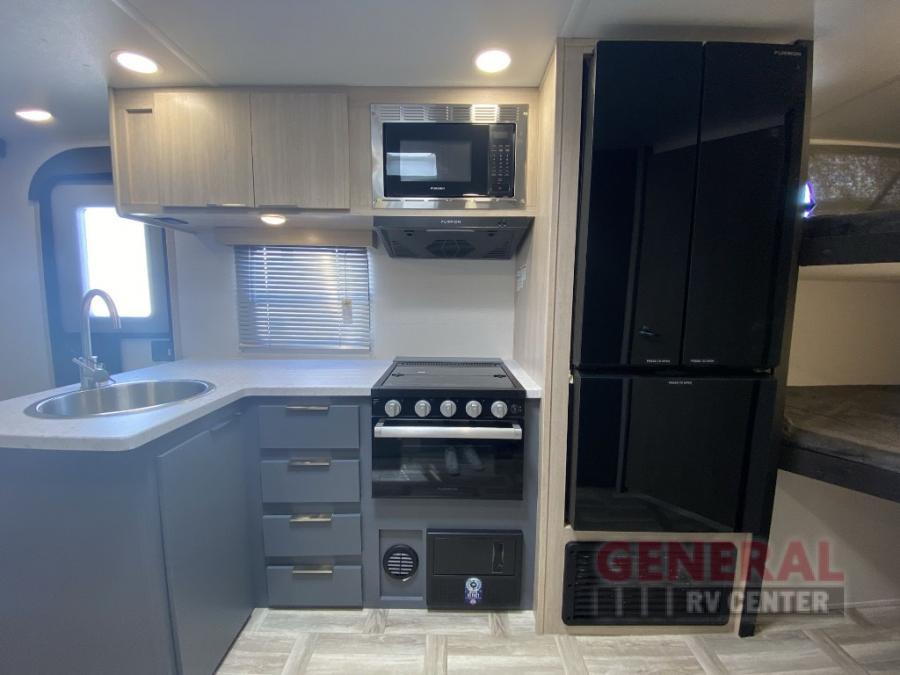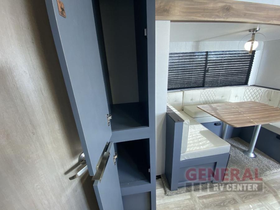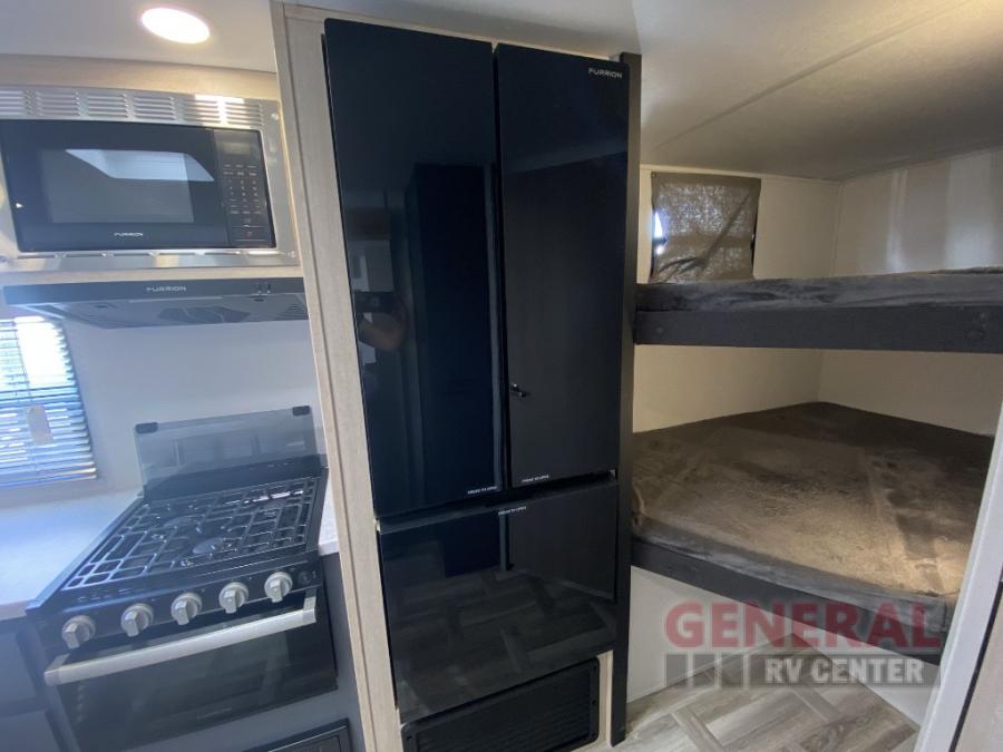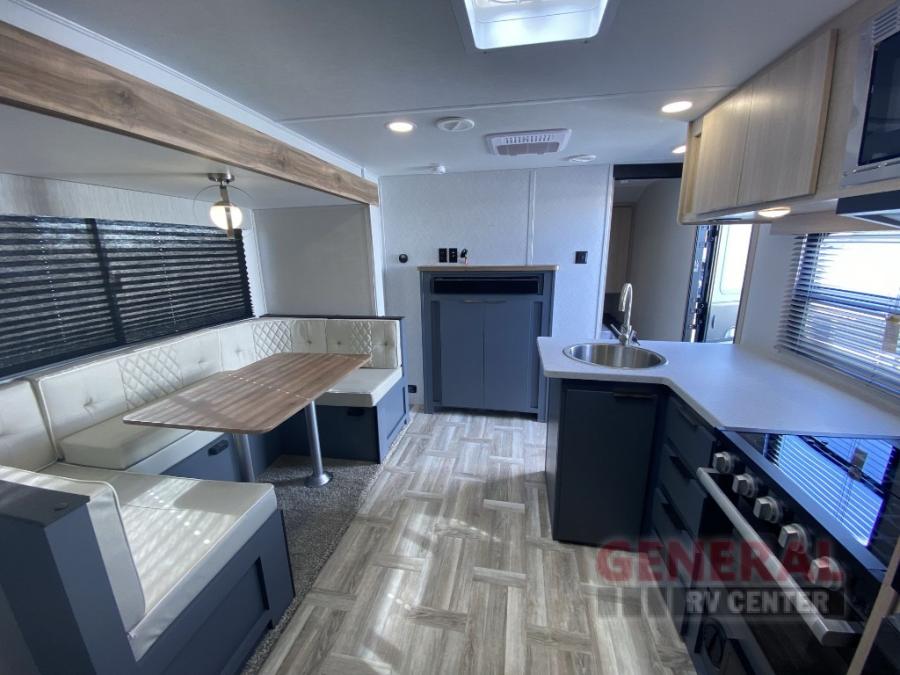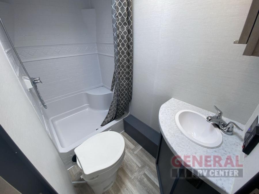 Camping with your friends and family can be comfortable and fun when you have this trailer! From the double-size bunks next to the full bathroom to the queen bed up front, everyone will have their own space. The U-shaped dinette slide out offers extra floor space and elbow room, and the kitchen offers full amenities including an L-shaped counter with a kitchen sink to keep everything clean.