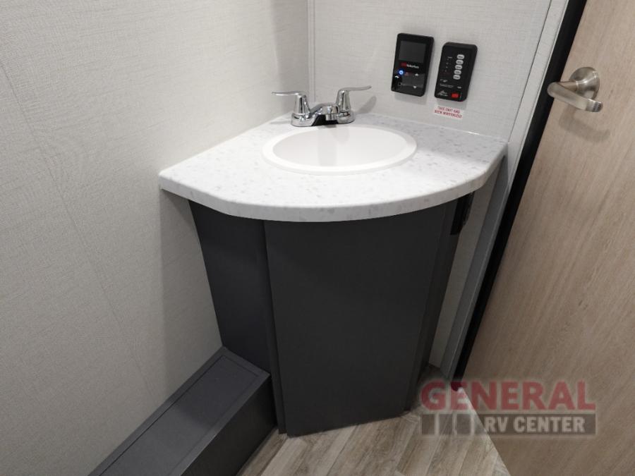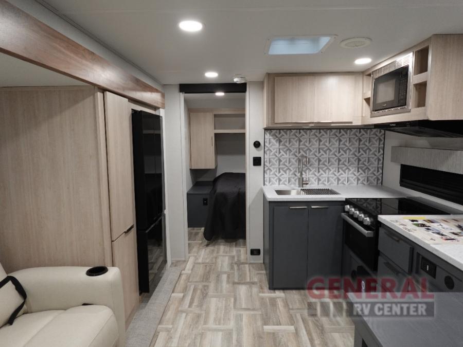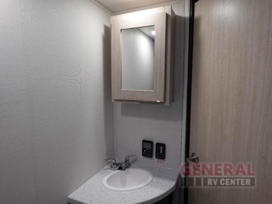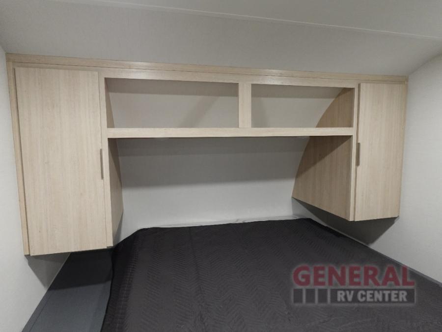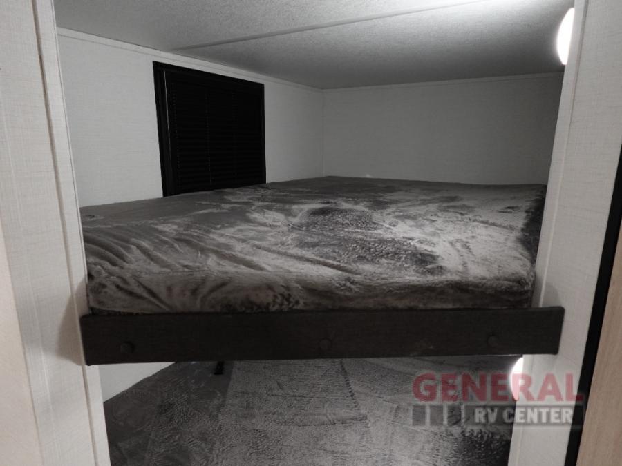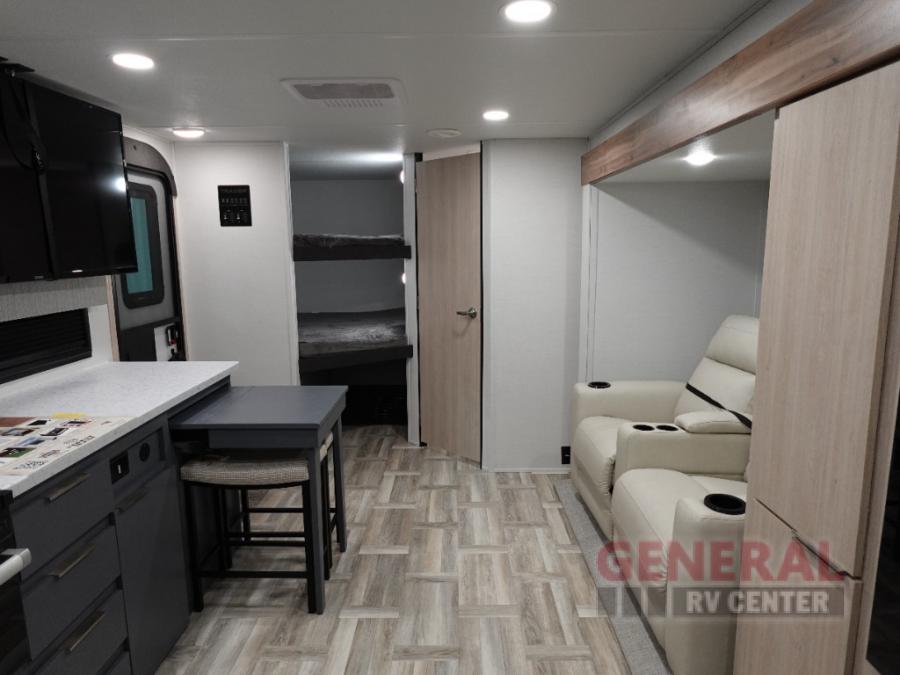 If you're looking for more comfort and a larger sleeping capacity in your next RV, this travel trailer is the one! There are double-size bunks in the rear corner, along with a ladder to easily hop into bed, and the full bath is in the other rear corner for easy nighttime use. You'll enjoy the front private bedroom with its queen bed and dual wardrobes for your things. In the morning, you can make breakfast in the full kitchen, then dine at the bartop with three stools. Or head outdoors to cook on the camp kitchen and eat under the awning! There is also a theater seat within the slide out for more comfort and space, plus the pantry and refrigerator are here so you can easily grab a snack!