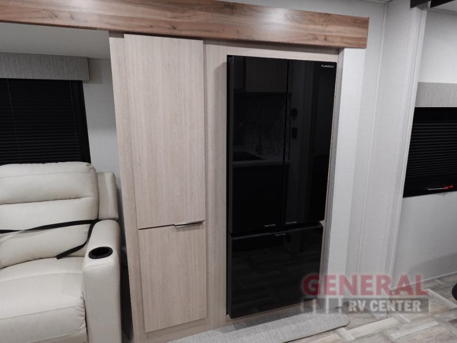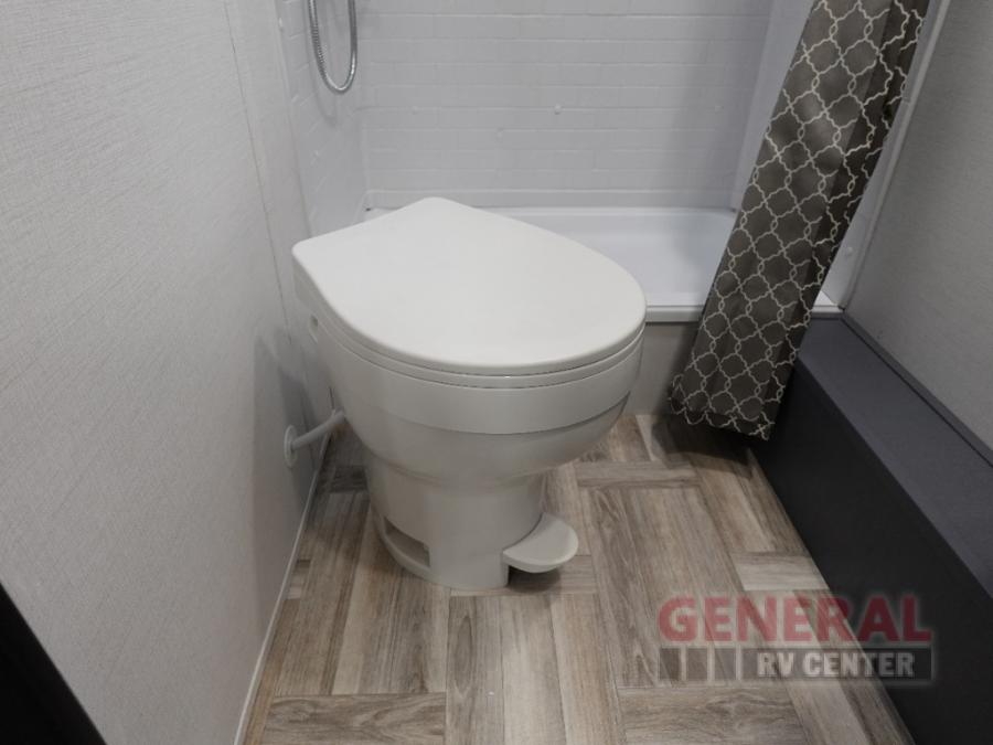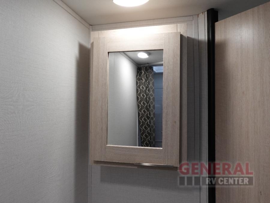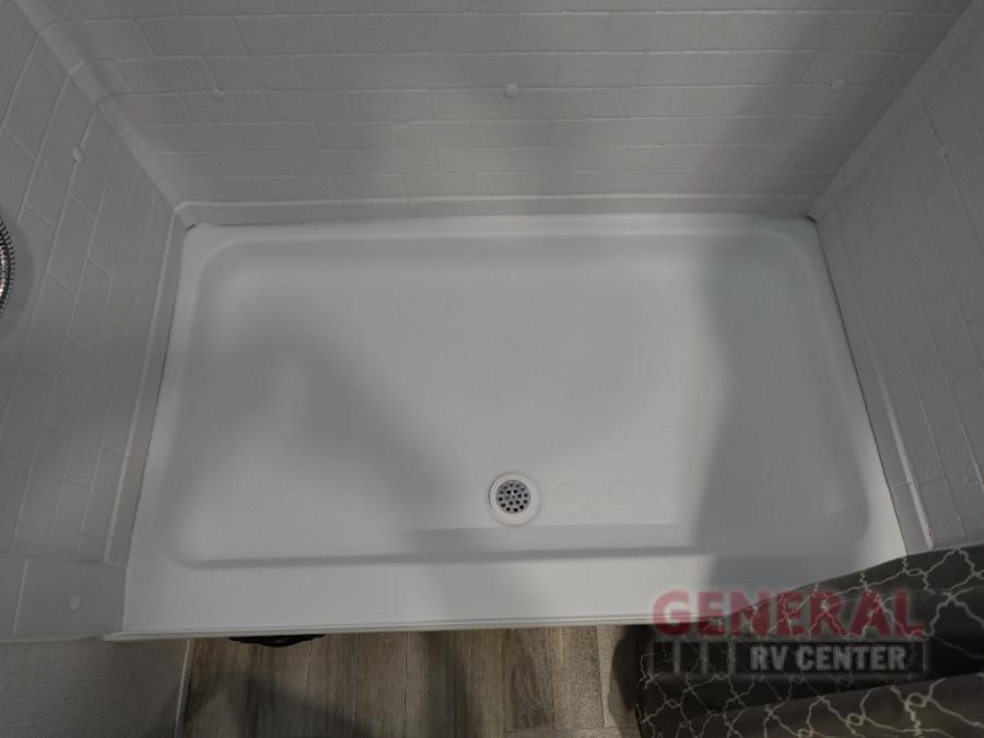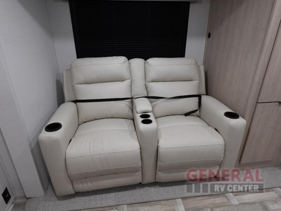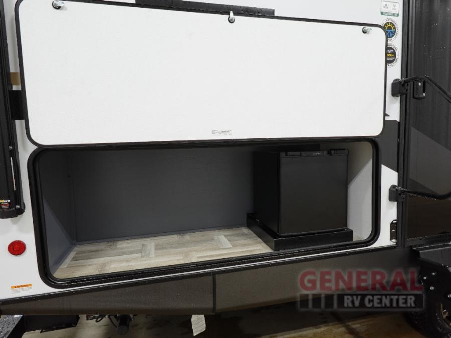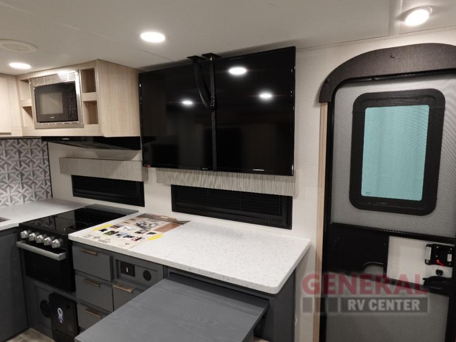 If you're looking for more comfort and a larger sleeping capacity in your next RV, this travel trailer is the one! There are double-size bunks in the rear corner, along with a ladder to easily hop into bed, and the full bath is in the other rear corner for easy nighttime use. You'll enjoy the front private bedroom with its queen bed and dual wardrobes for your things. In the morning, you can make breakfast in the full kitchen, then dine at the bartop with three stools. Or head outdoors to cook on the camp kitchen and eat under the awning! There is also a theater seat within the slide out for more comfort and space, plus the pantry and refrigerator are here so you can easily grab a snack!