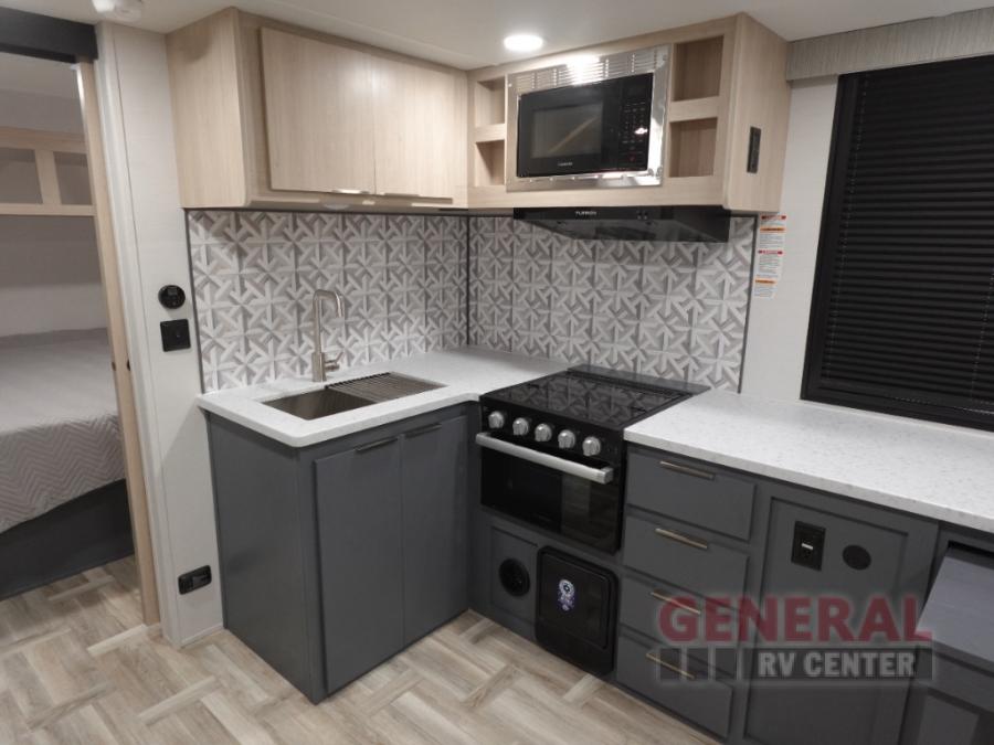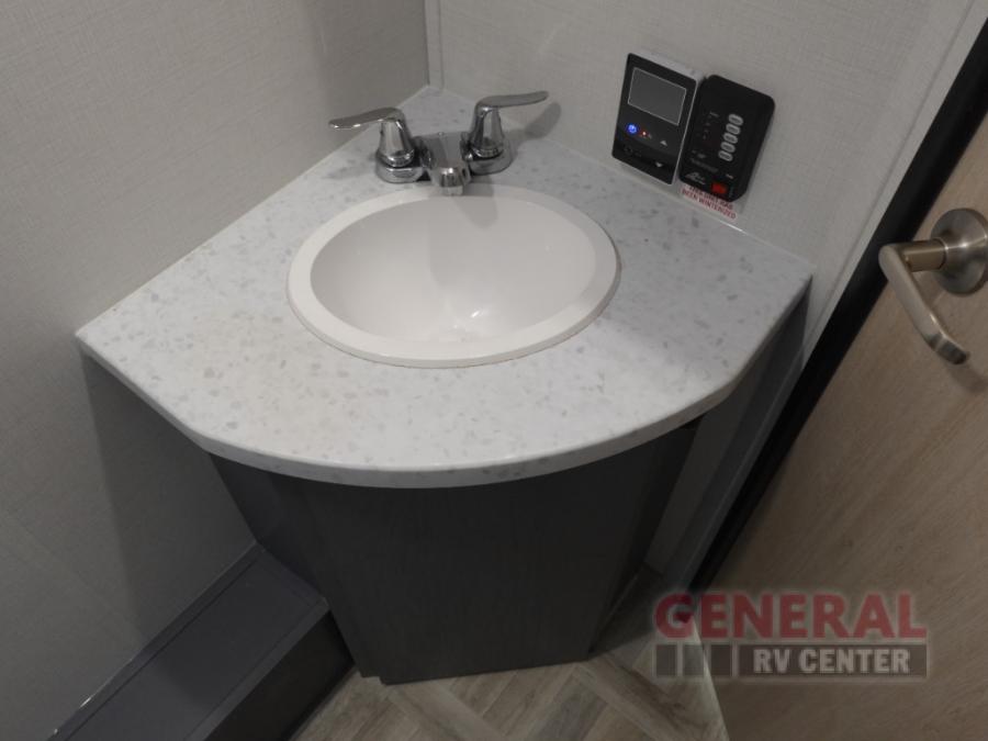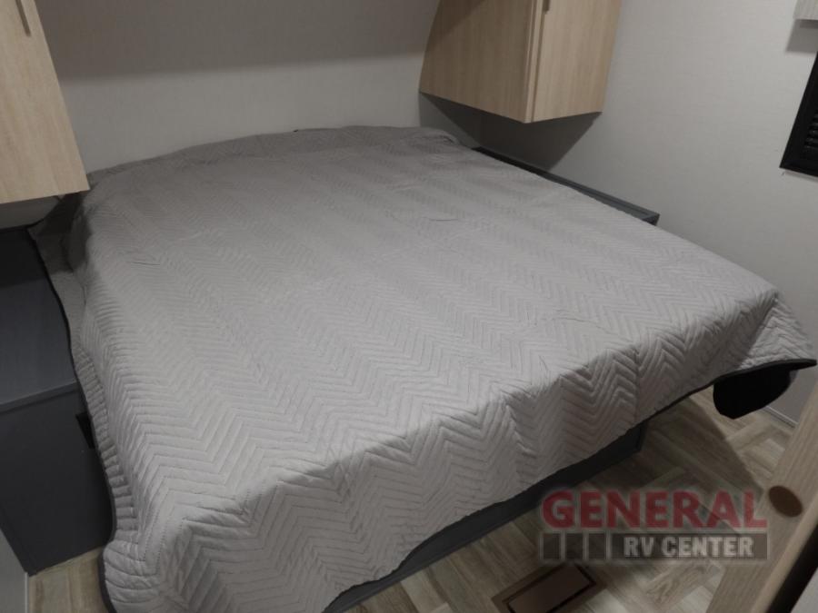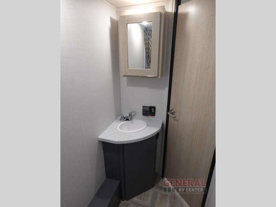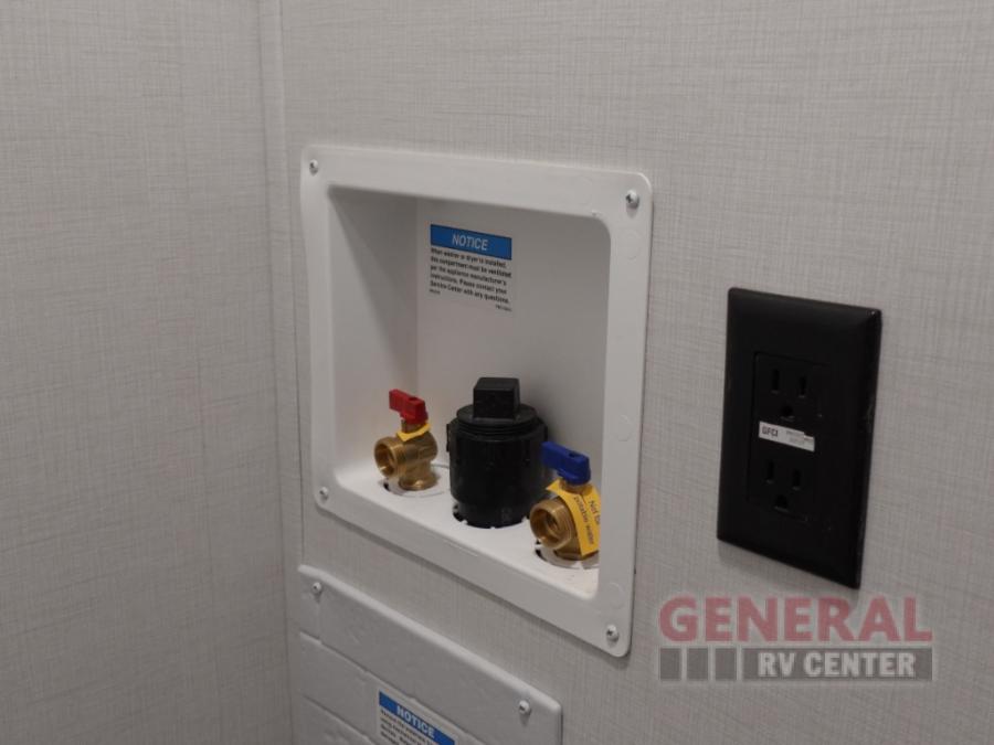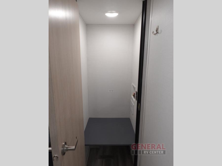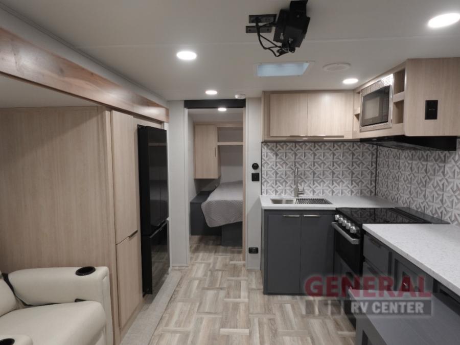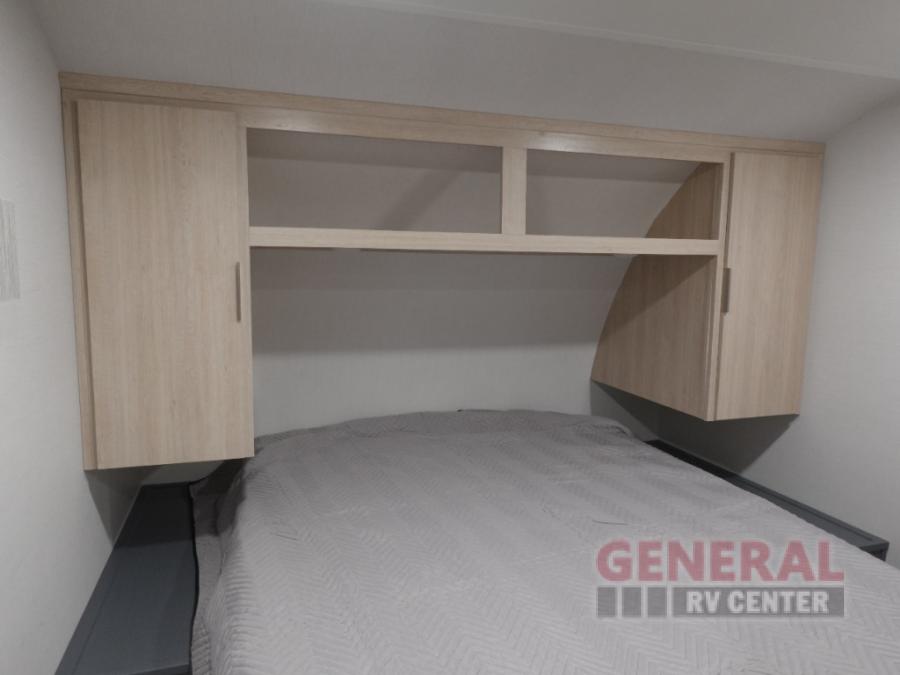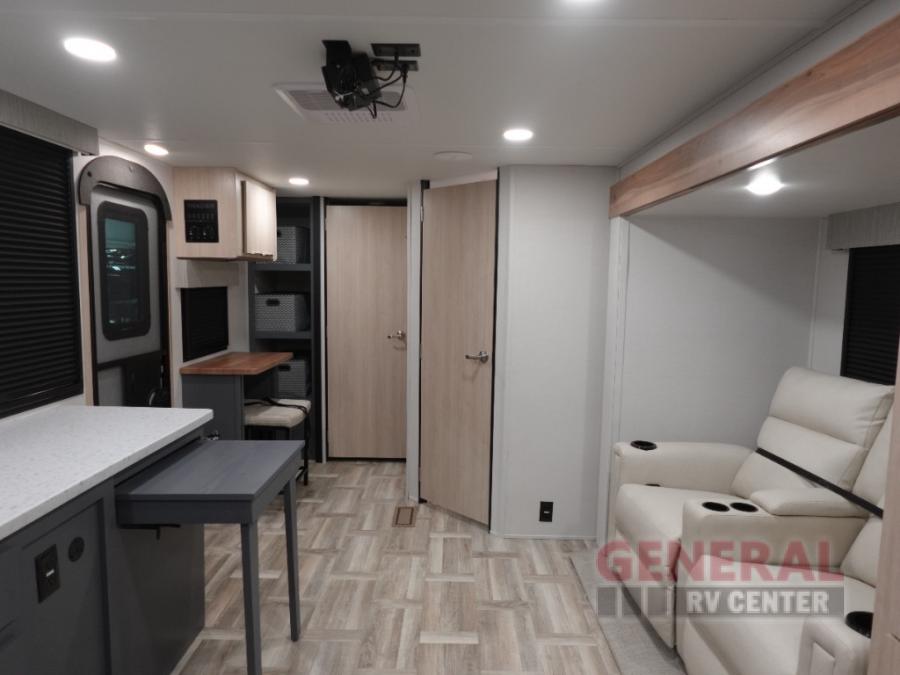 The perfect couple's trailer is found with this RV! You'll enjoy the front private bedroom with its queen bed and dual wardrobes for your things, and the rear corner full bath on board will let you stay clean throughout your trip. In the morning, you can make breakfast in the full kitchen, then dine at the bartop with three stools. There is also a theater seat within the slide out for more comfort and space, plus the pantry and refrigerator are here so you can easily grab a snack. A desk with a chair lets you work while you're away from home if you need to, and there is even a closet with washer and dryer prep if you choose to add those appliances!
