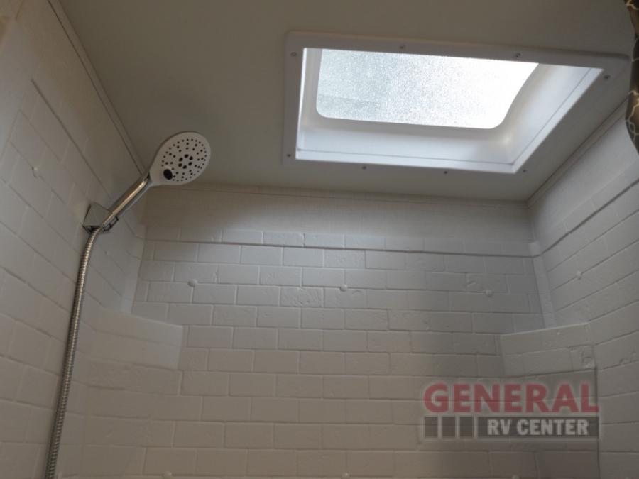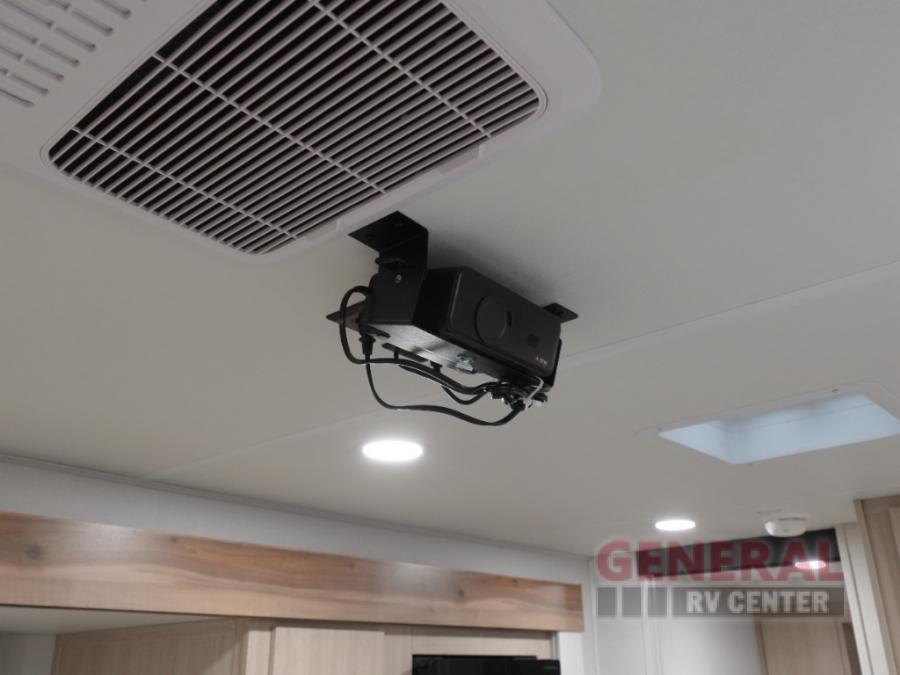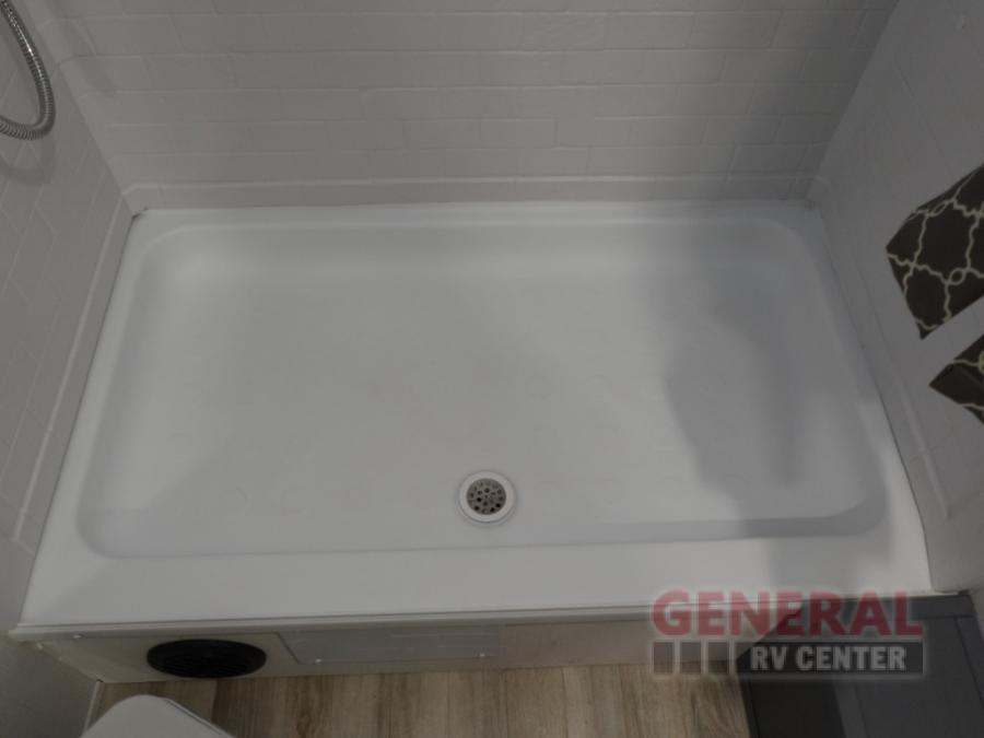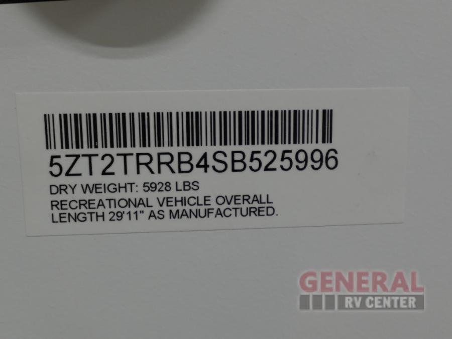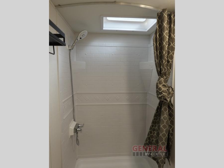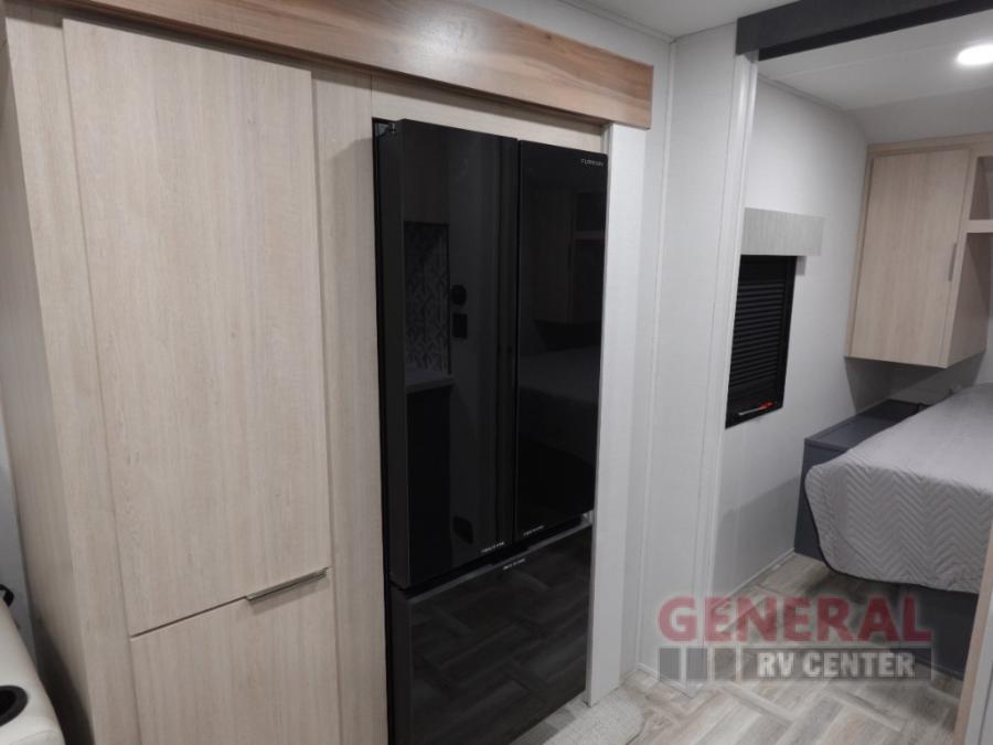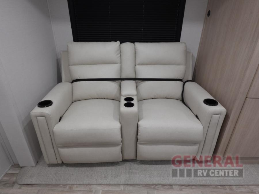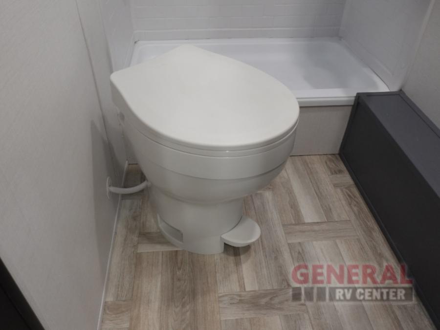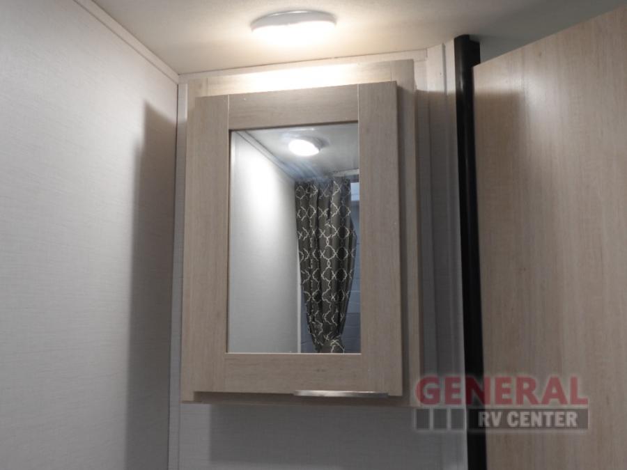 The perfect couple's trailer is found with this RV! You'll enjoy the front private bedroom with its queen bed and dual wardrobes for your things, and the rear corner full bath on board will let you stay clean throughout your trip. In the morning, you can make breakfast in the full kitchen, then dine at the bartop with three stools. There is also a theater seat within the slide out for more comfort and space, plus the pantry and refrigerator are here so you can easily grab a snack. A desk with a chair lets you work while you're away from home if you need to, and there is even a closet with washer and dryer prep if you choose to add those appliances!