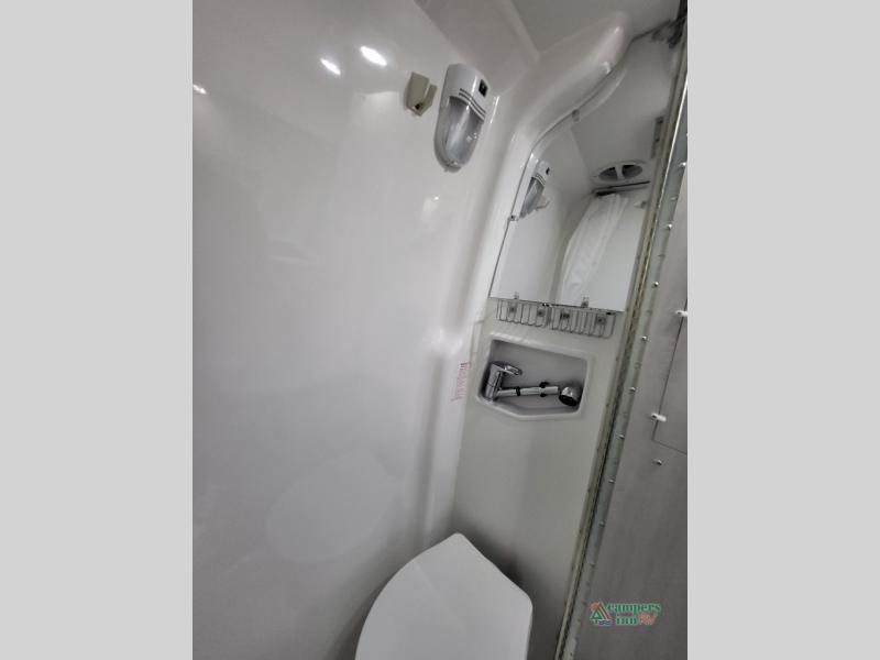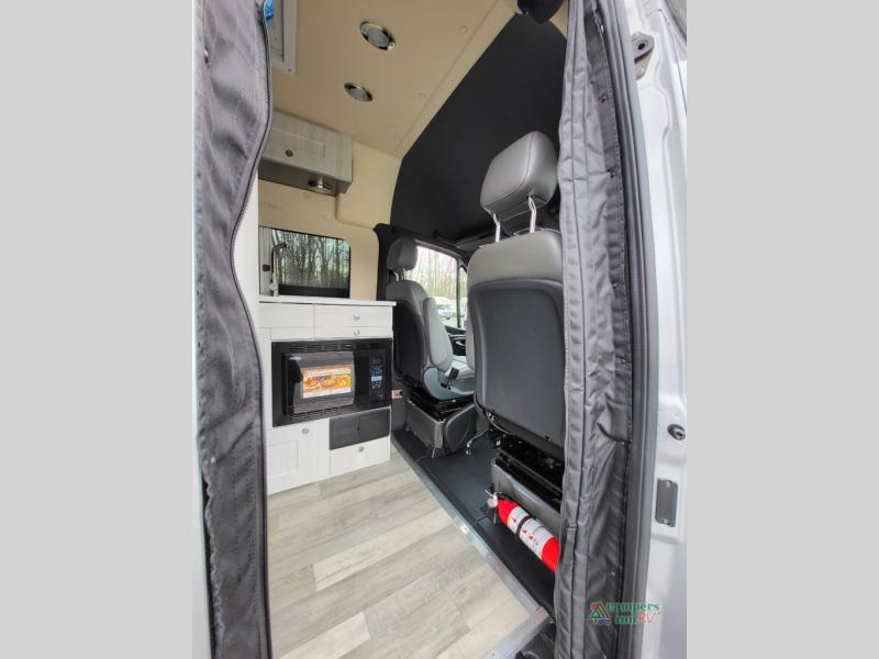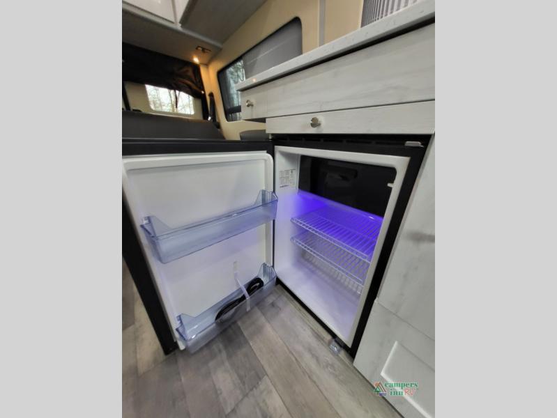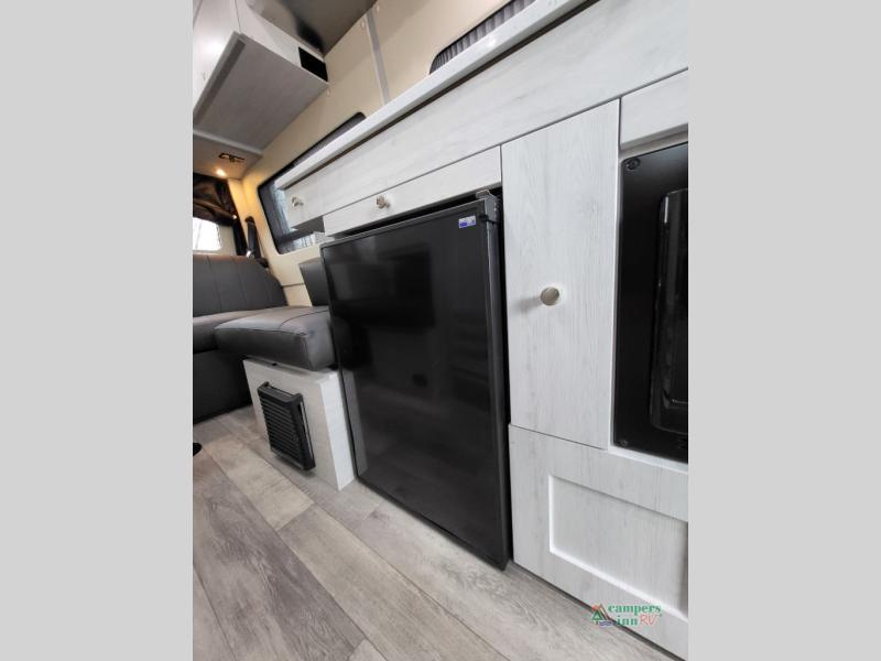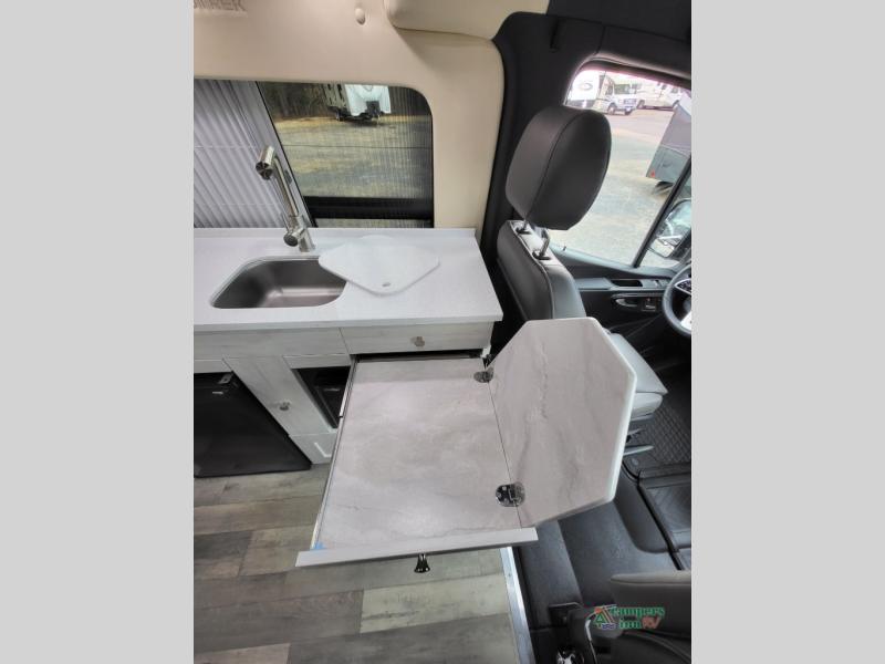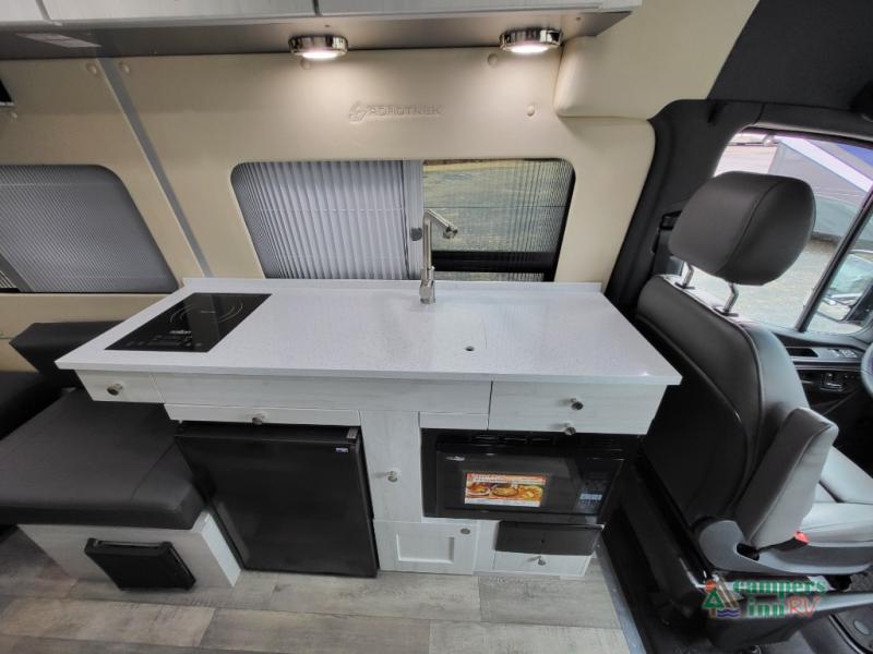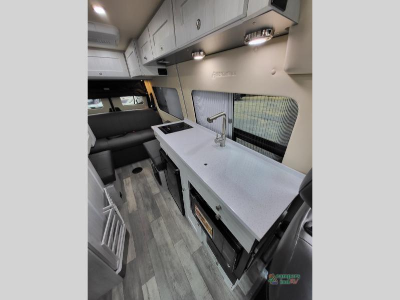 - Fully Equipped Galley: Includes a 3.1 cu ft 12V/110V refrigerator, two-burner cooktop (with optional induction stove), convection microwave, and solid surface countertops for convenient meal preparation.