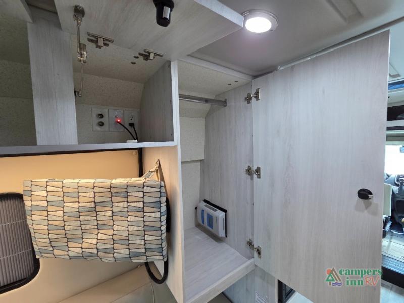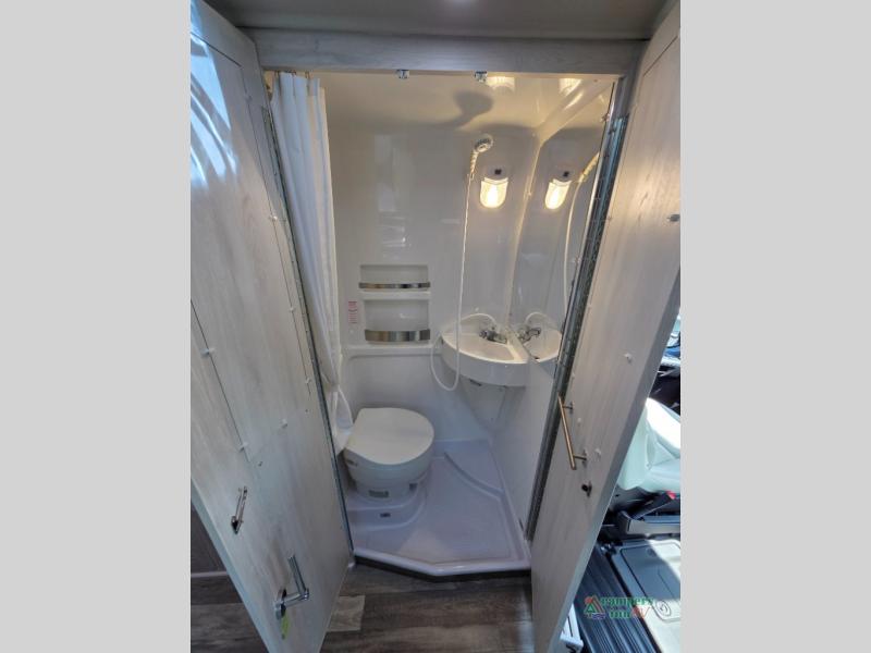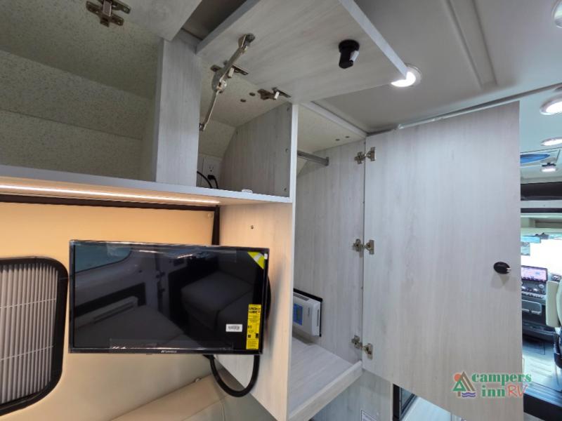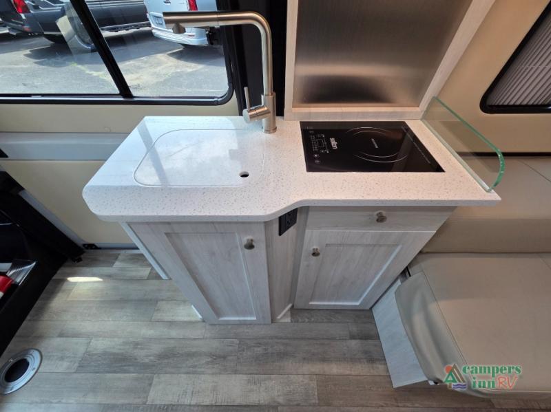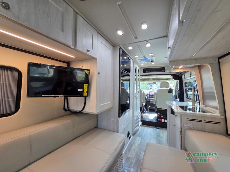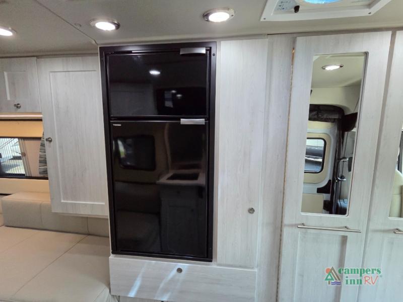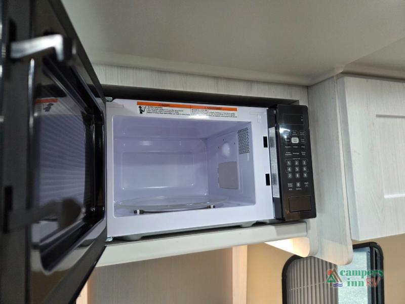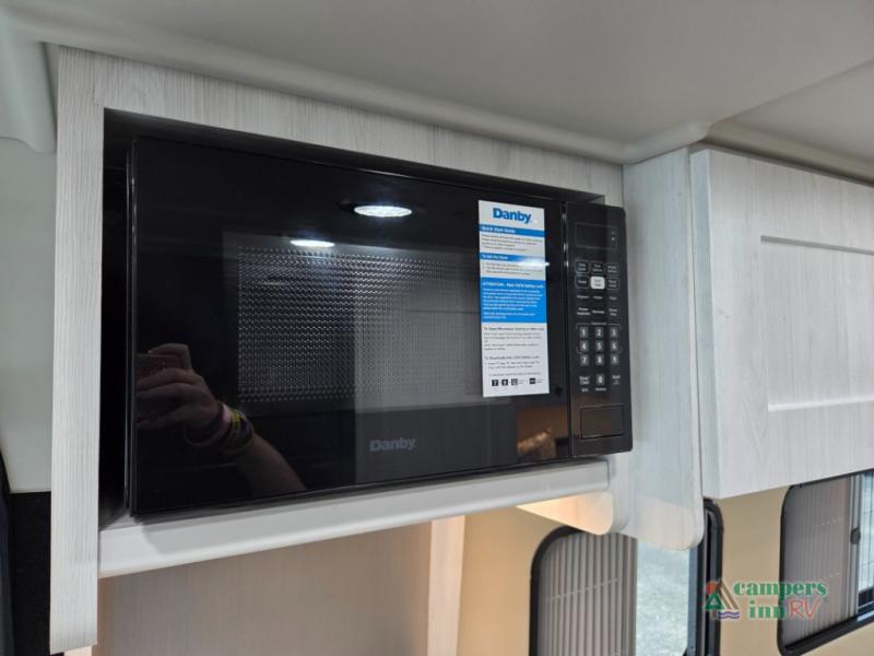 Chase your outdoor excursions in this comfortable motorhome for two! You will find side-facing rear power sofas that can convert to twin beds or a king-size bed for your comfort. If you're needing more sleeping space, just add the optional folding mattress for the front captain's seats! You can prepare at-home meals in the galley that features a two-burner propane stove, a 5.3-cu. ft. refrigerator, plus a counter extension with a charging station for your tablet or phone. After you've freshened up in the convenient wet bath, head outdoors for the day to enjoy the sunshine. When you return, you can make popcorn in the microwave oven and watch a movie on the 24" Smart TV!