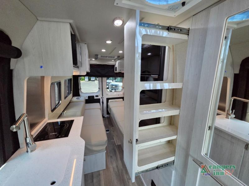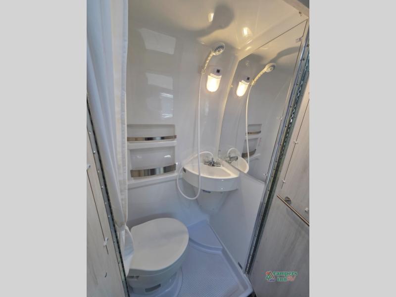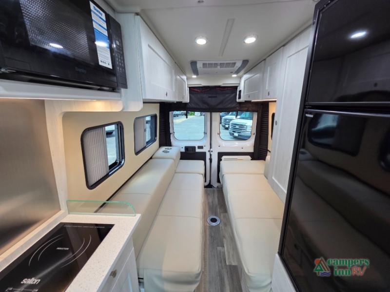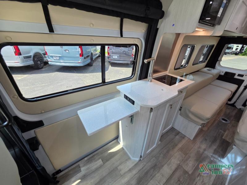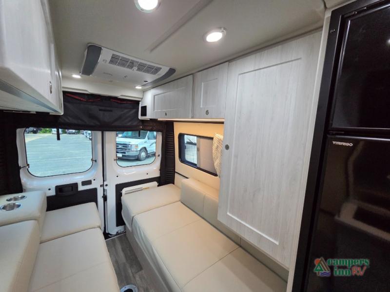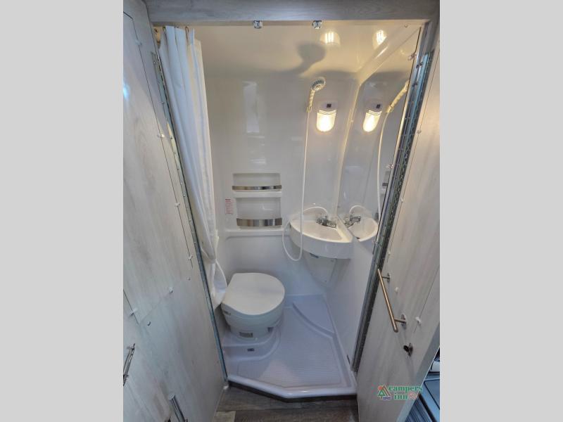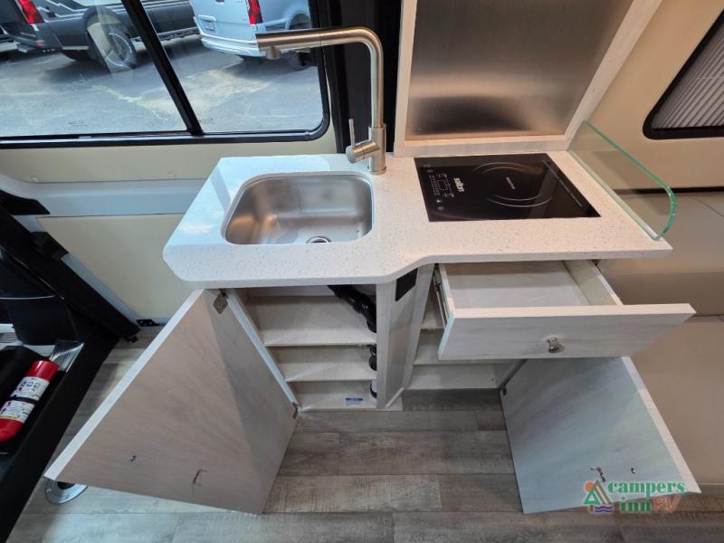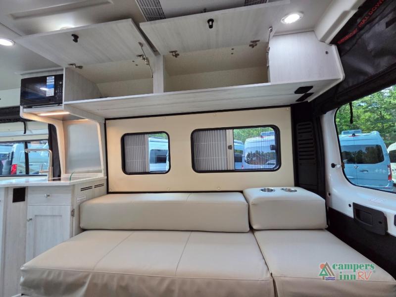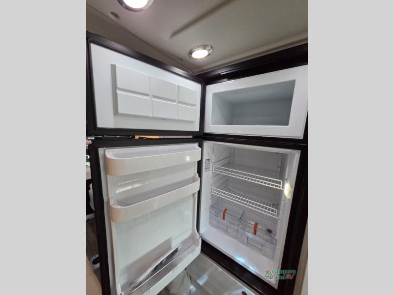 Chase your outdoor excursions in this comfortable motorhome for two! You will find side-facing rear power sofas that can convert to twin beds or a king-size bed for your comfort. If you're needing more sleeping space, just add the optional folding mattress for the front captain's seats! You can prepare at-home meals in the galley that features a two-burner propane stove, a 5.3-cu. ft. refrigerator, plus a counter extension with a charging station for your tablet or phone. After you've freshened up in the convenient wet bath, head outdoors for the day to enjoy the sunshine. When you return, you can make popcorn in the microwave oven and watch a movie on the 24" Smart TV!