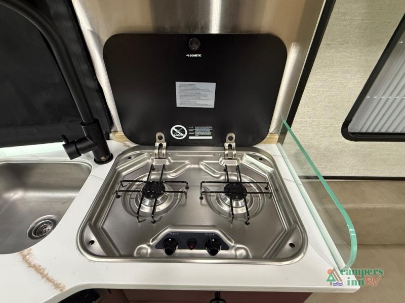 You can sleep four to five in this coach thanks to the pop-top sleeping area! You'll find plenty of storage space for items small and large, including a large pot drawer and a slide out pantry in the kitchen! The rear power sofa can easily convert to sleeping space at the push of a button, plus you can add the optional folding mattress to go over the front captain's seats if a grandkid tags along. Prepare breakfast on the two-burner propane stove or use the microwave oven if you're on-the-go. The wet bath with a sink, shower and toilet will allow you to freshen up after a day of hiking, and the 13' power awning outdoors will provide shade if you choose to dine outdoors for dinner.