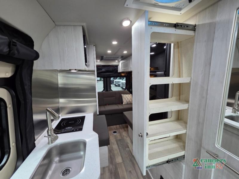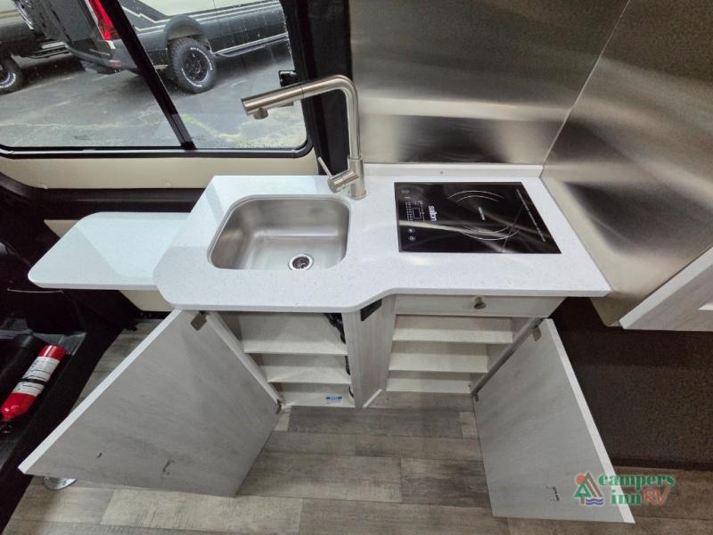 • Slide-Out Pantry & Countertop Extension with Charging Station – Store snacks, expand your prep space, and power up your devices after a day on the trails.