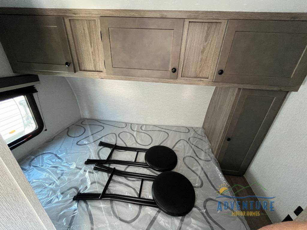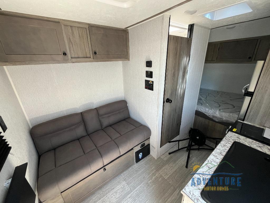 This compact travel trailer will be perfect for trips to the lake. Since there is a front bed, you won't have to sleep on an air mattress, and the convenient wet bath lets you freshen up each day. Breakfast can be made on two burner cooktop or in the microwave oven, and there is a refrigerator to keep your food fresh. This model also includes a sofa where you can relax in the evenings, and guests can sleep here if they want to tag along!