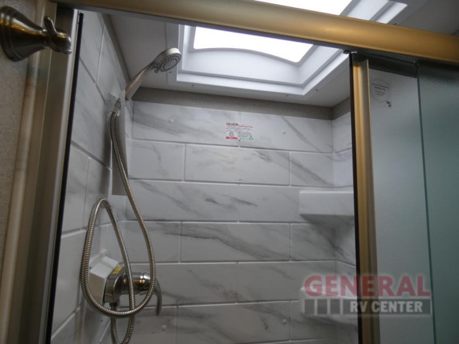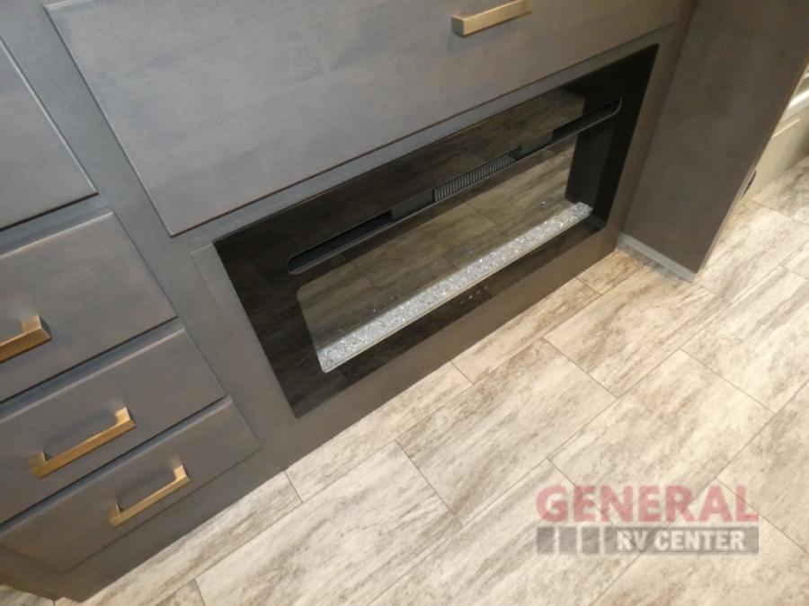 Relax in the full rear bathroom, featuring a spacious 30” x 36” shower. The living area boasts a versatile sofa with a murphy bed, perfect for guests or extra sleeping space. Cozy up by the fireplace, enjoy your favorite shows on the TV, and organize your stuff in the ample shelving and storage. The closet also provides additional space for your belongings. The kitchen is a culinary dream, equipped with a pantry, drawers, fridge, three-burner cooktop, and a microwave. Gather with family and friends at the 70” dream dinette, perfect for meals and game nights. Additional sleeping space is available in the front bunk over the cab, and when you're ready to take the party outside, enjoy your favorite shows on the exterior TV.