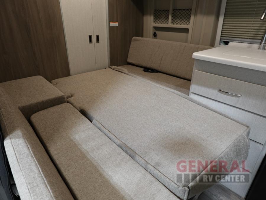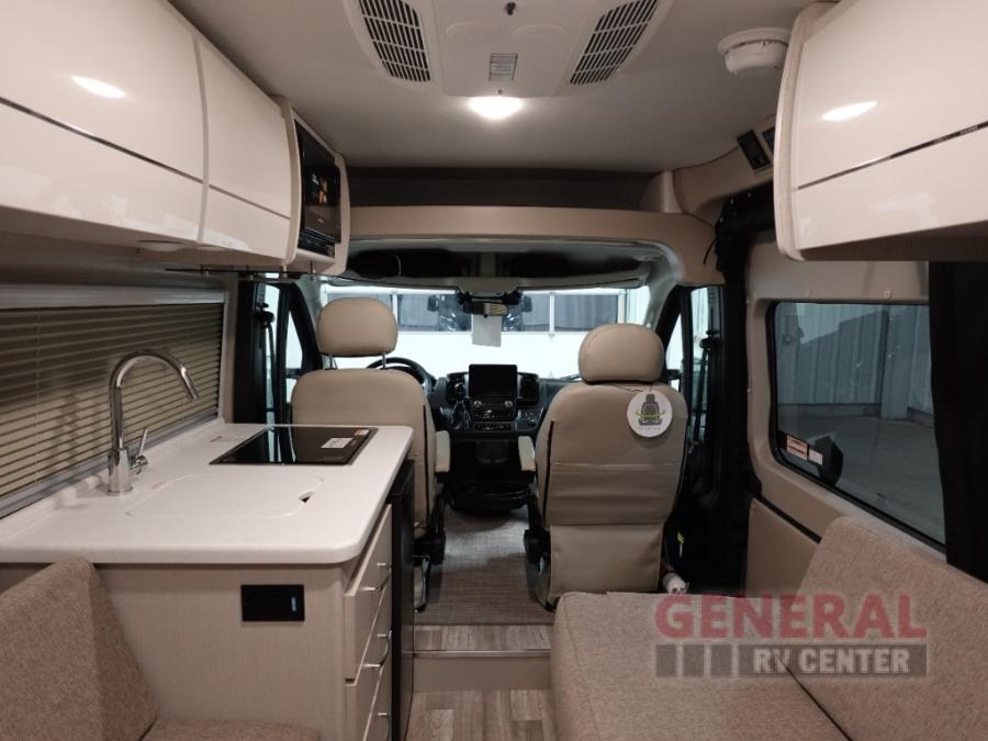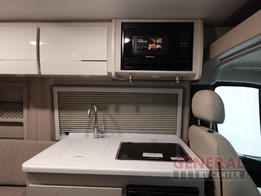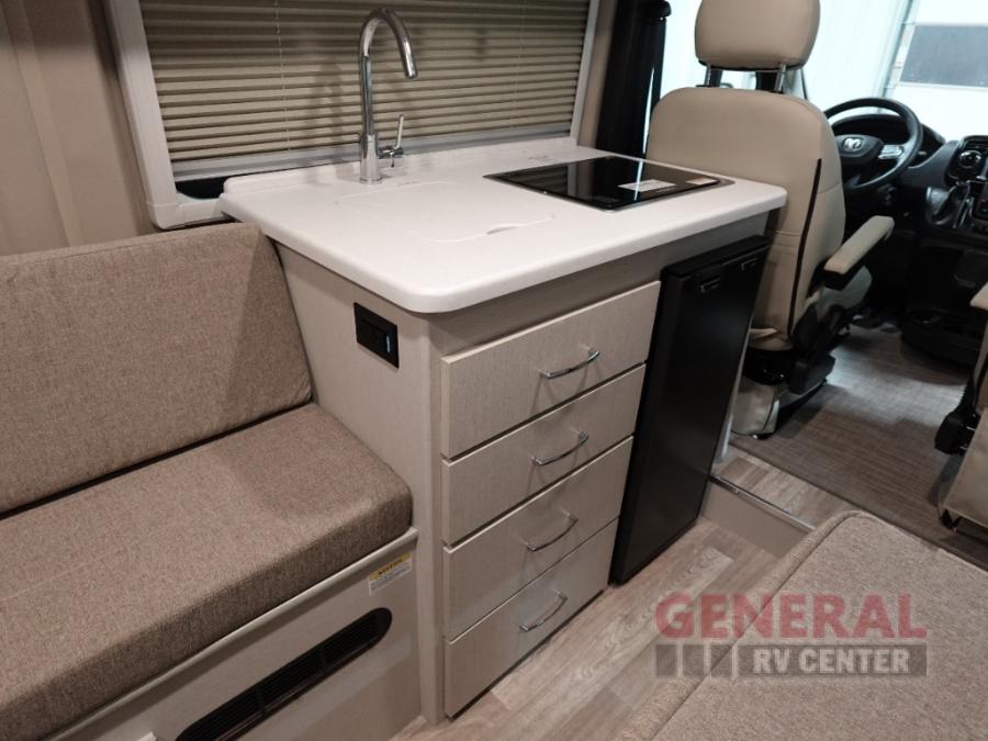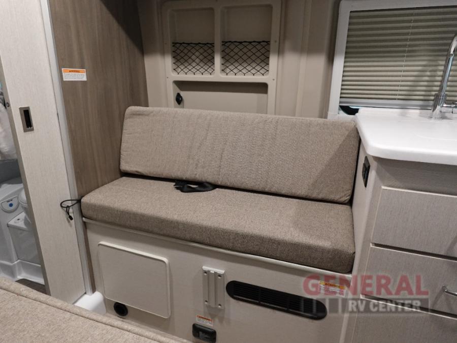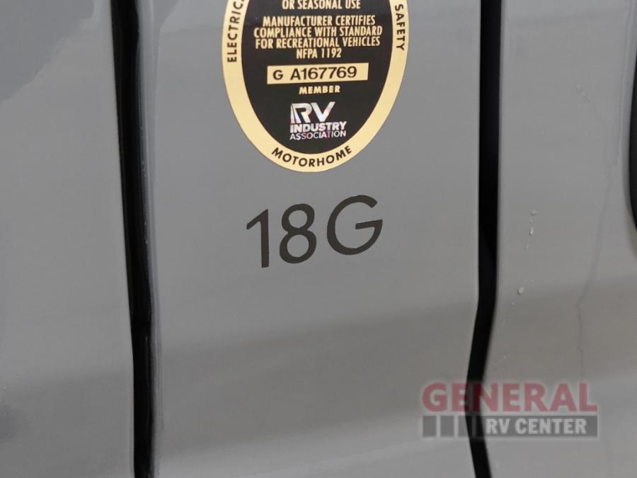 Travel easily in this Rize 18G motorhome. When you are ready to get off the road for a few hours or several days you will have plenty of comforts to enjoy before you head to your next location. The expanding sleeper sofa offers plenty of seating during the day and additional seating can be found opposite with each seating area offering one set of seat belts for two rear travelers. Create meals on the go with a two-burner gas cooktop and microwave oven, you can dine while seated in one of the captain's chairs that swivel, or from the seating in back. Create a 44" x 70" sleeping space at night with the expanding sofa along the curbside. The large opening window above the sink and stove will provide plenty of fresh air throughout, and the wet bath in back is a convenience that you just can't beat while on the road or in camp!