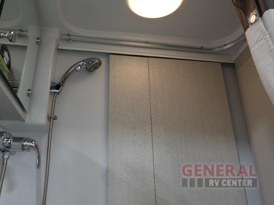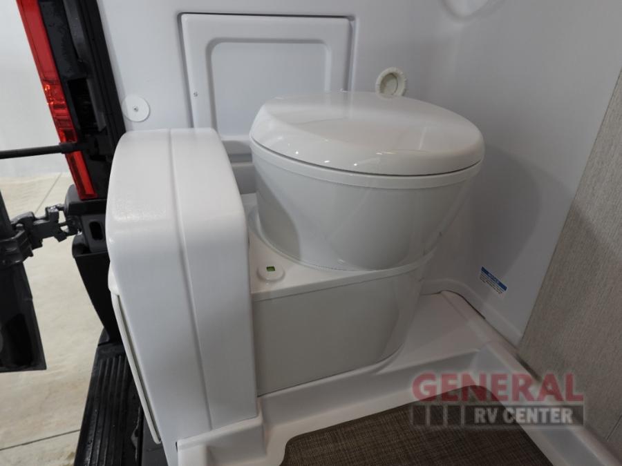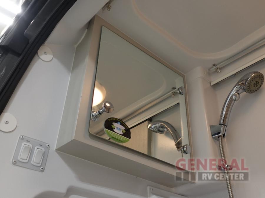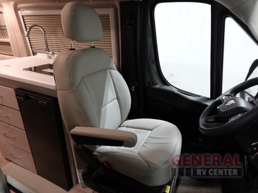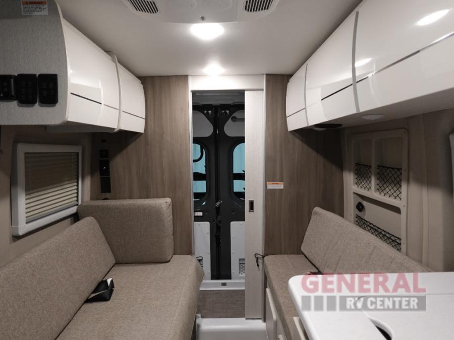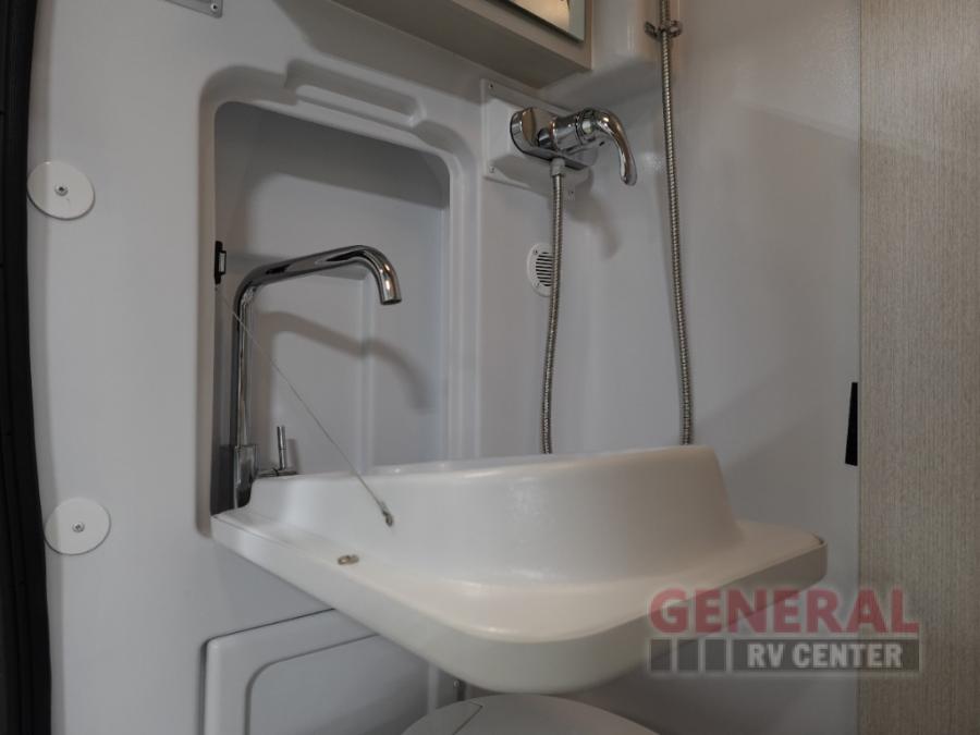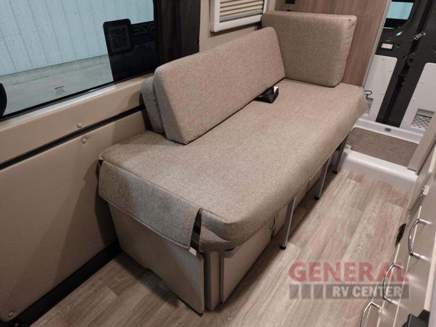 Travel easily in this Rize 18G motorhome. When you are ready to get off the road for a few hours or several days you will have plenty of comforts to enjoy before you head to your next location. The expanding sleeper sofa offers plenty of seating during the day and additional seating can be found opposite with each seating area offering one set of seat belts for two rear travelers. Create meals on the go with a two-burner gas cooktop and microwave oven, you can dine while seated in one of the captain's chairs that swivel, or from the seating in back. Create a 44" x 70" sleeping space at night with the expanding sofa along the curbside. The large opening window above the sink and stove will provide plenty of fresh air throughout, and the wet bath in back is a convenience that you just can't beat while on the road or in camp!