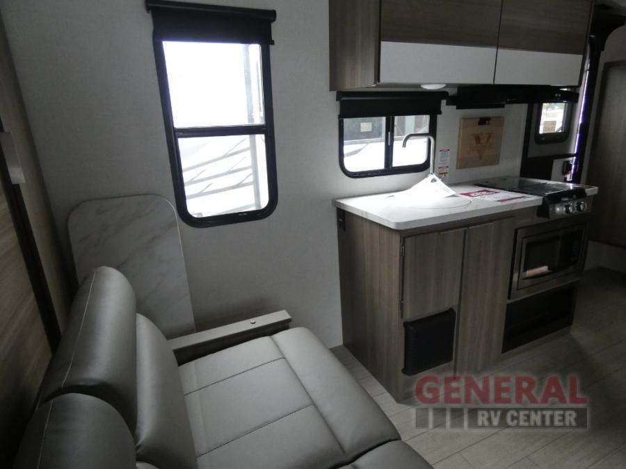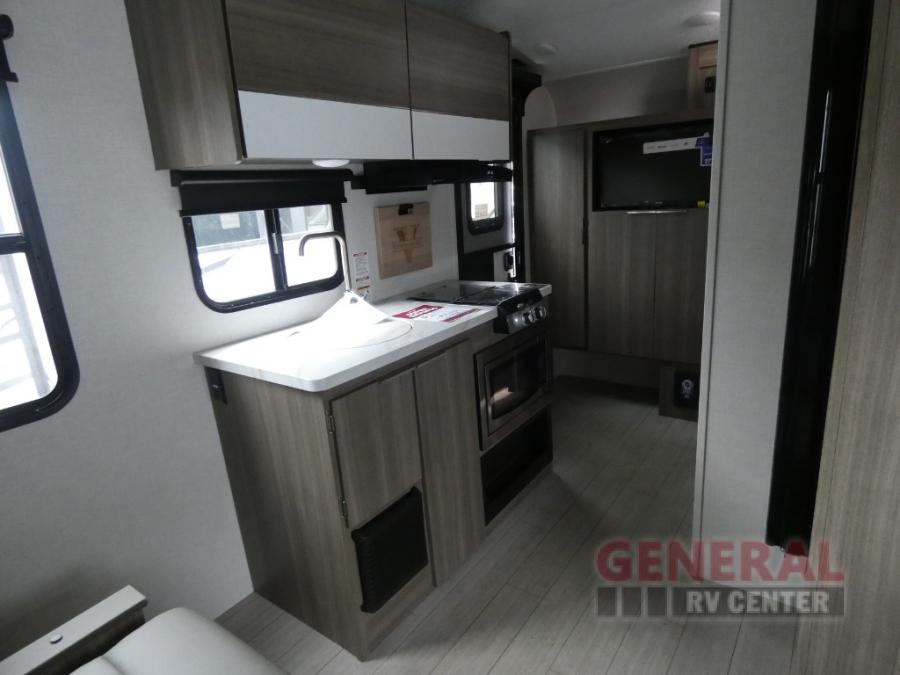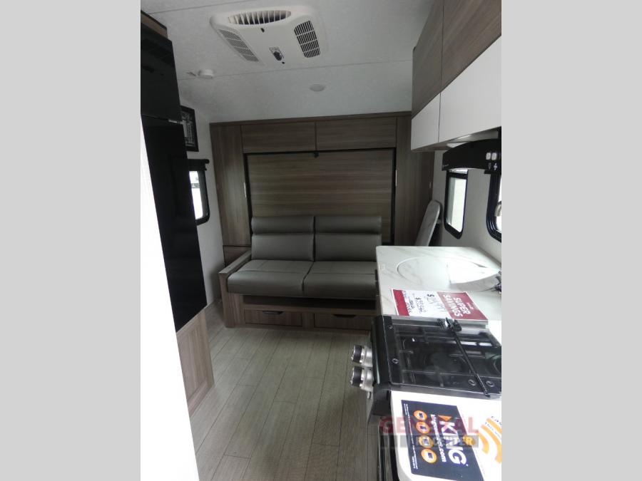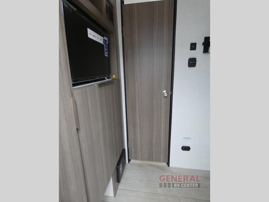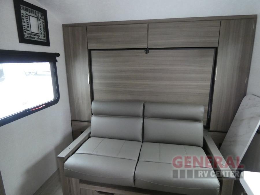 Head to your favorite campgrounds with your favorite person in this travel trailer! The front RV queen bed provides a comfortable place to lay your head at night with overhead cabinets and a wardrobe at the foot of the bed for your clothes. The sit n' slide table  dinette is handy for dining when you are inside, plus you might decide to take it outside to relax under the 12' power awning.  The full bathroom with 17" radius shower in the back corner allows you to skip the public facilities. And you will find storage throughout for clothing, dishes, and food including in the pantry, linen closet and the overhead cabinets, plus outside in the exterior pass-through storage area which includes a motion-activated light!