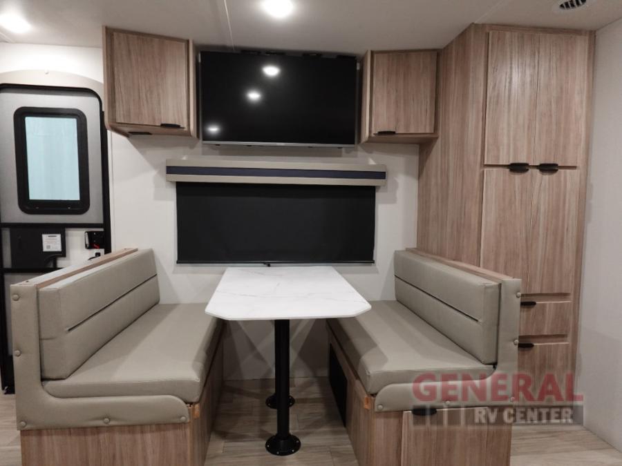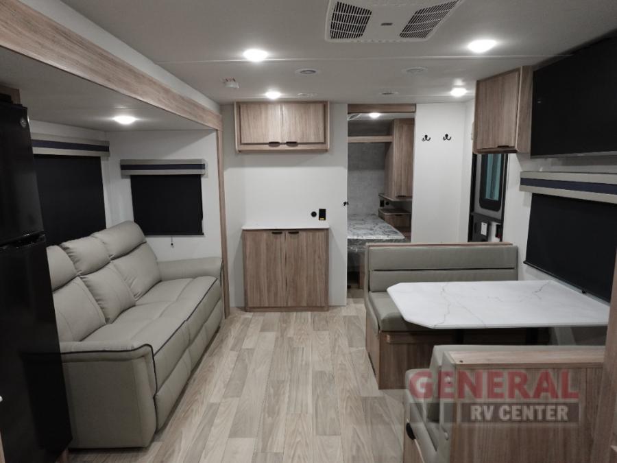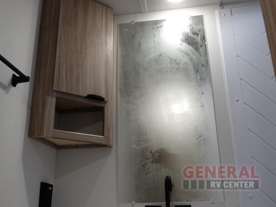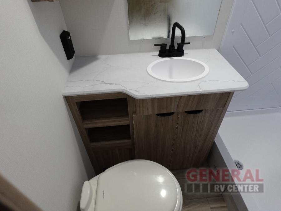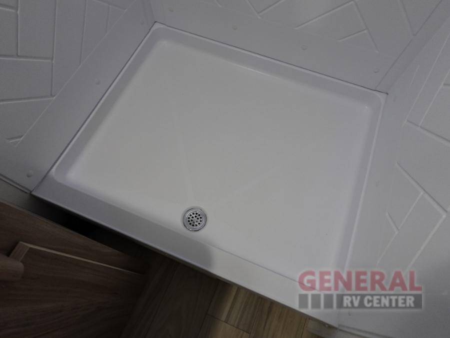 Enjoy your Access in the great outdoors! This unit features a large slide for added interior space inside. There is sleeping for two to six depending on size and furniture choices starting with the front private bedroom featuring a space saving sliding door. You can also sleep two on the optional tri-fold sofa within the slide, and the dinette opposite can be converted for one or two little ones. You will find ample storage throughout in overhead storage cabinets, under bed storage and wardrobes, plus more. The kitchen appliances are also within the large slide, plus you will find a nice size sink in the rear roadside corner with storage both above and below. A convenient rear corner bathroom allows you to skip the use of the camp facilities and enjoy cleaning up in the privacy of your own unit. Here you will find a 30" x 36" shower, porcelain toilet and a vanity with sink and corner medicine cabinet. You will also appreciate the exterior storage door within the slide and there is also convenient pass-through storage for your larger camp items to be neatly tucked away when not in use.