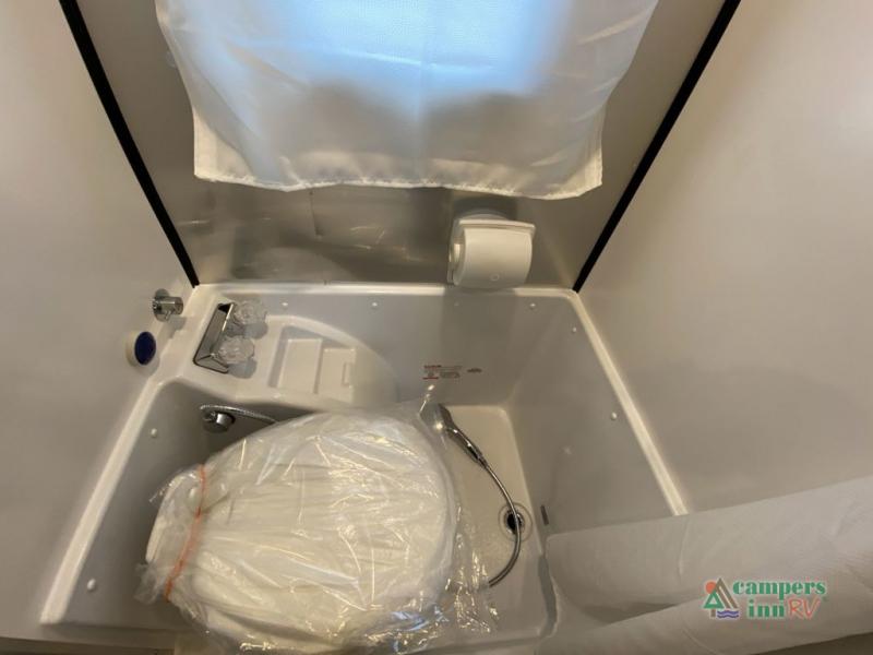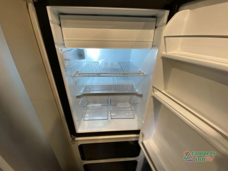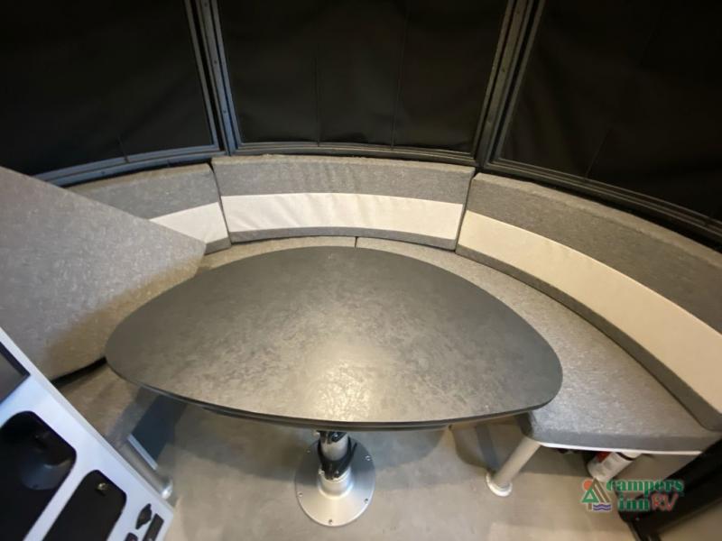 Chart a new map with this travel trailer in tow! Once you arrive at your destination, you can unload your gear, then start lunch on the single burner induction cooktop. An all-electric refrigerator lets you store cold items, and an optional microwave can be added for added convenience. You'll find bench seating in the back with removable tables that can be adjusted to different heights and directions. When it's time for bed, the benches can be converted to a half bed on one side, a full bed that spans the back of the unit, or a split sleeping area. A rear door gives you quick and easy access to your built-in floor storage with a drain, doubling it as a cooler!