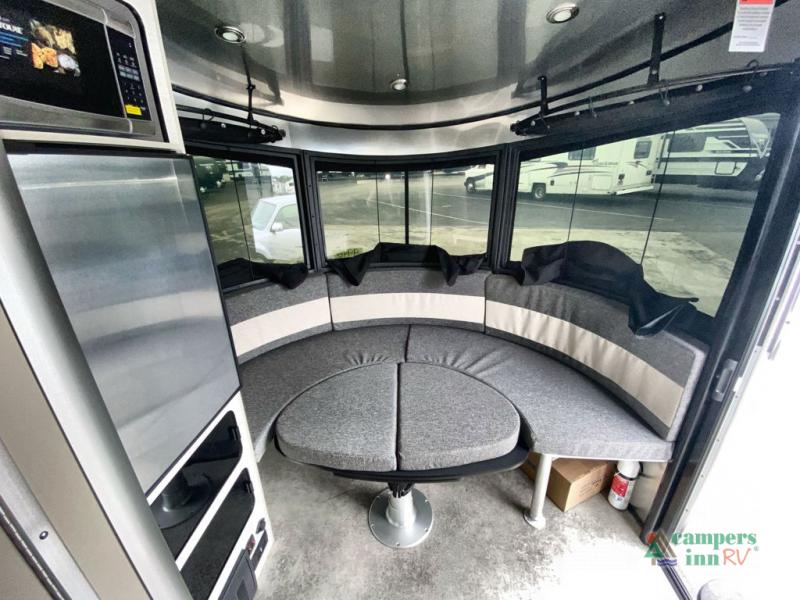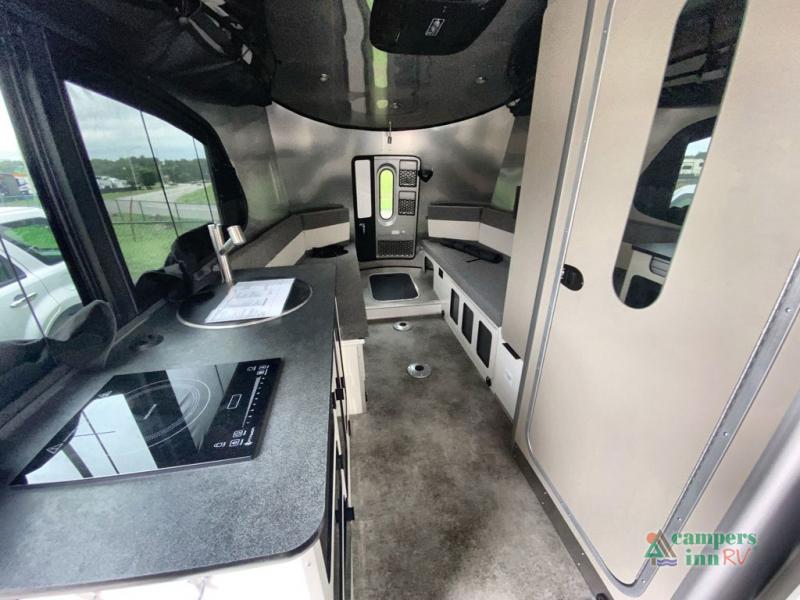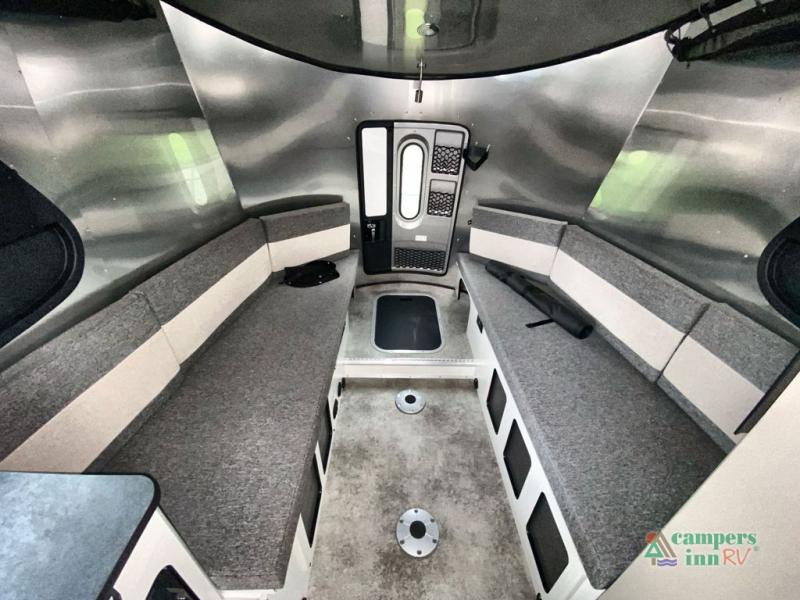 Inside, the Basecamp 20XE offers a bright, flexible, and surprisingly spacious interior that supports active lifestyles. With expanded floor space and convertible seating, the layout allows you to transition effortlessly from dining and lounging to sleeping and gear organization. The rear seating transforms into a comfortable sleeping space, while the front dinette provides additional functionality and panoramic views through Airstream’s signature wraparound windows.