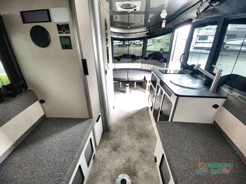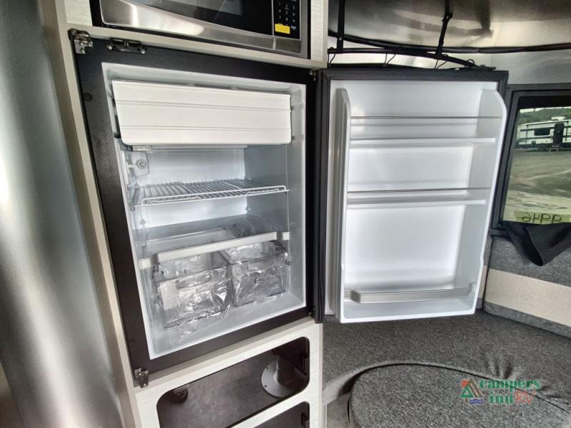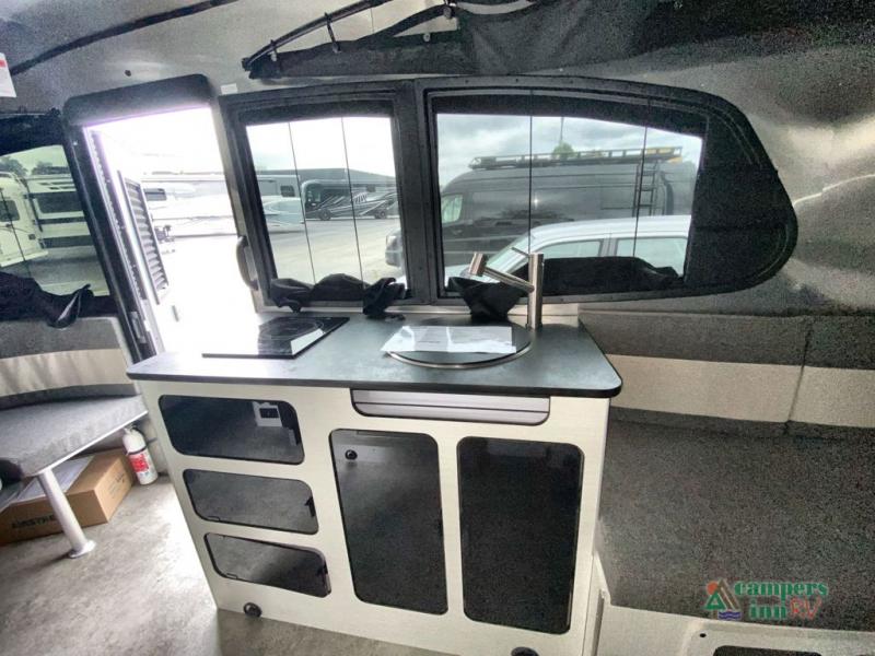 The compact but fully equipped kitchen includes high-quality appliances, a refrigerator, two-burner cooktop, deep sink, and thoughtful storage solutions. Whether you’re cooking quick meals between trail runs or preparing hearty breakfasts before heading out to explore, the Basecamp 20XE’s galley supports your on-the-go needs.
