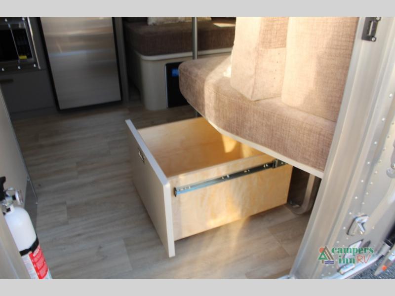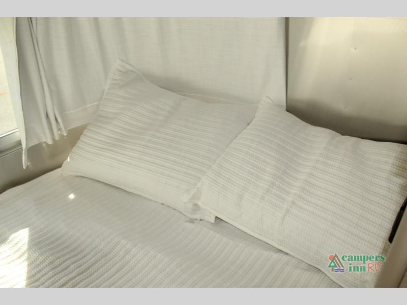 You'll always have a stylish and comfortable place to stay with the Airstream Caravel travel trailer! The manual Zip Dee patio awning can be paired with matching optional window awnings that can help keep the interior cool and private. The rear polished bumper with storage will help you keep your tools, cords, and more hidden away in a bonus storage space, and the JL Audio stereo with Bluetooth connectivity and four speakers, surround sound, and subwoofer will play your music throughout the trailer. You can stay powered while off the grid If you add the optional solar package, depending on the model you choose, and the blackout curtains will let you have privacy when you head to bed. The stainless steel front stone guard protection will prevent damage to the body of your trailer while towing, and the panoramic windows will make the interior fresh and bright with natural sunlight.
