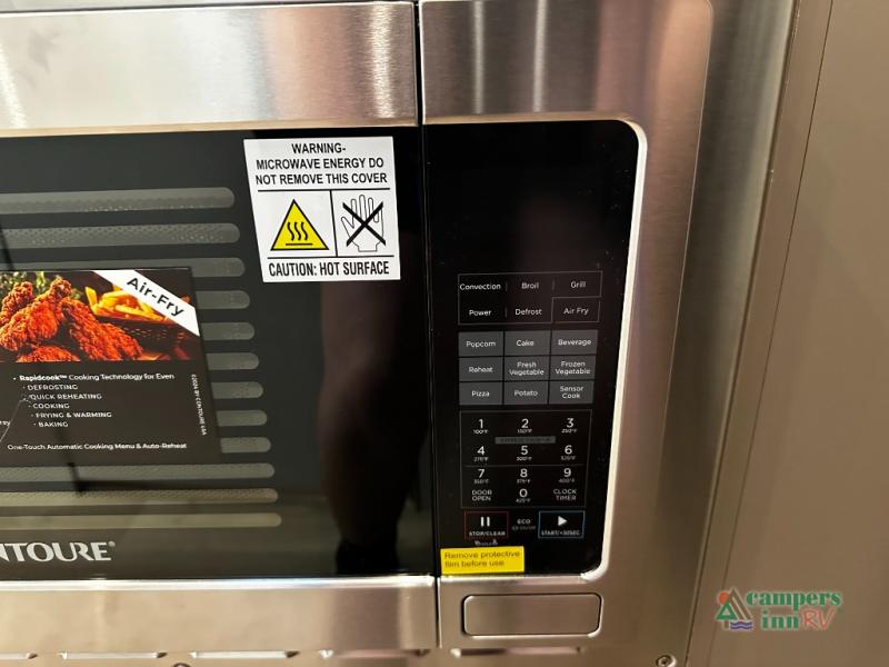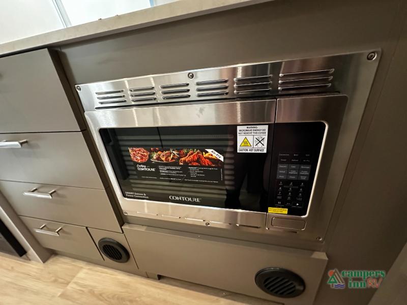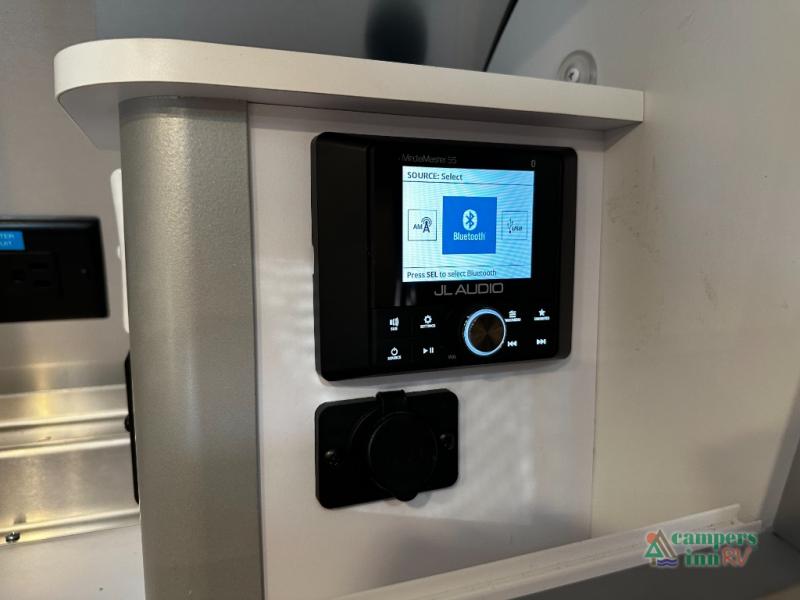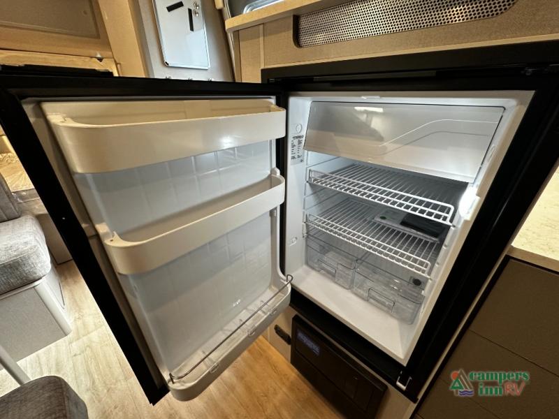 The fully equipped galley kitchen includes a two-burner cooktop, microwave, refrigerator, and stainless-steel sink, making meal prep easy no matter where your adventures take you. The wet bath is compact yet functional, providing all the convenience you need while preserving living space. High-quality finishes, durable materials, and thoughtful lighting make the interior both welcoming and practical.