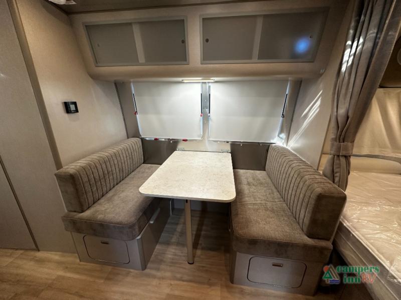 The Caravel 20FB features Airstream’s signature aluminum exterior and panoramic front windows, delivering both durability and timeless style. Inside, the front bedroom suite offers a private retreat for restful nights, while the rear dinette converts into additional sleeping space for family or guests. Smart storage solutions throughout maximize space and keep your gear organized.