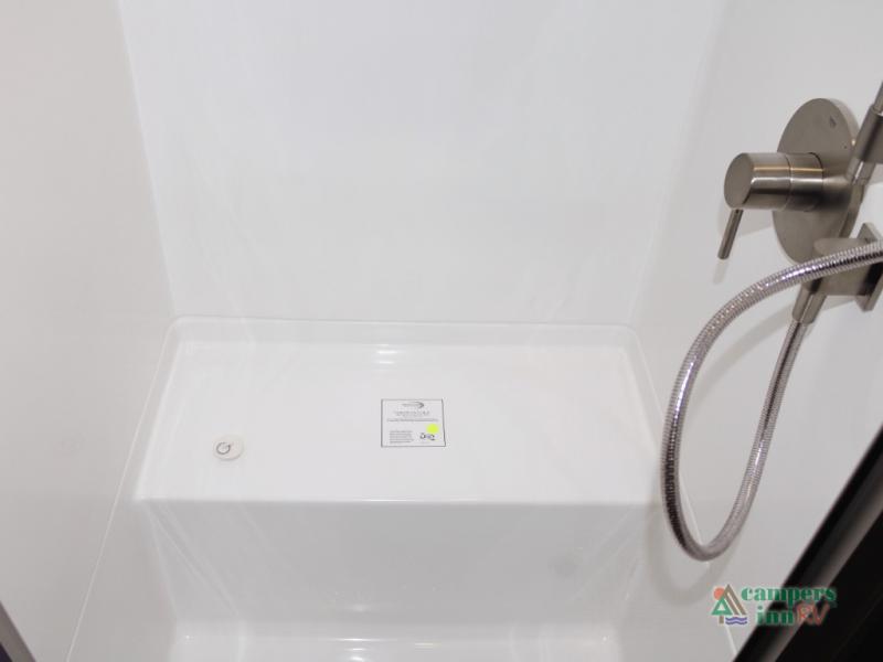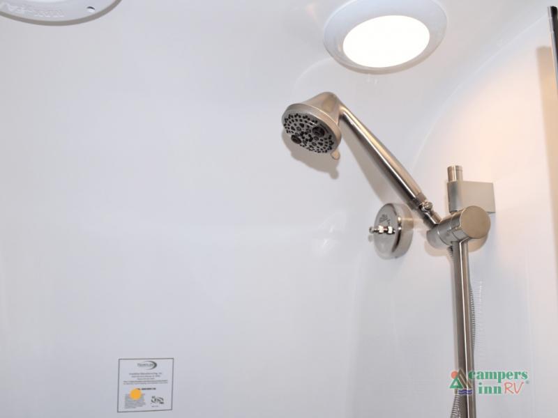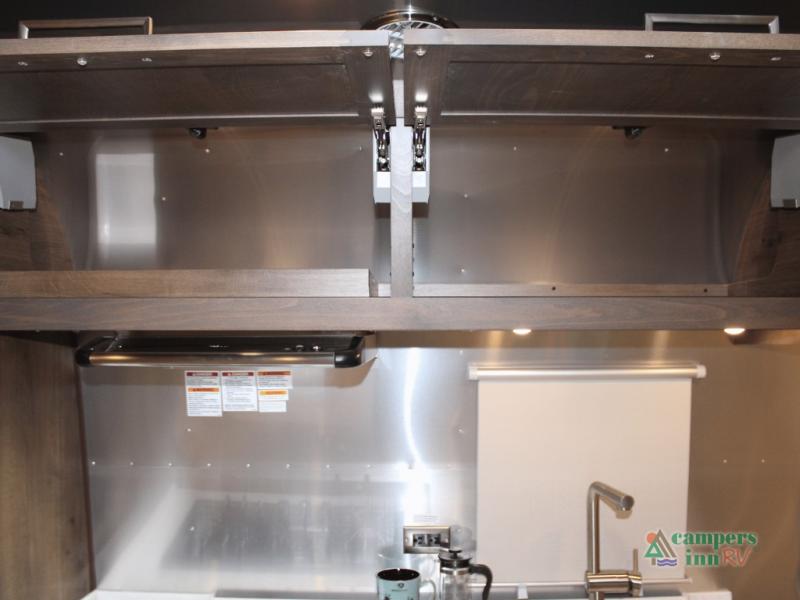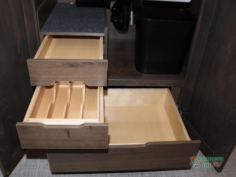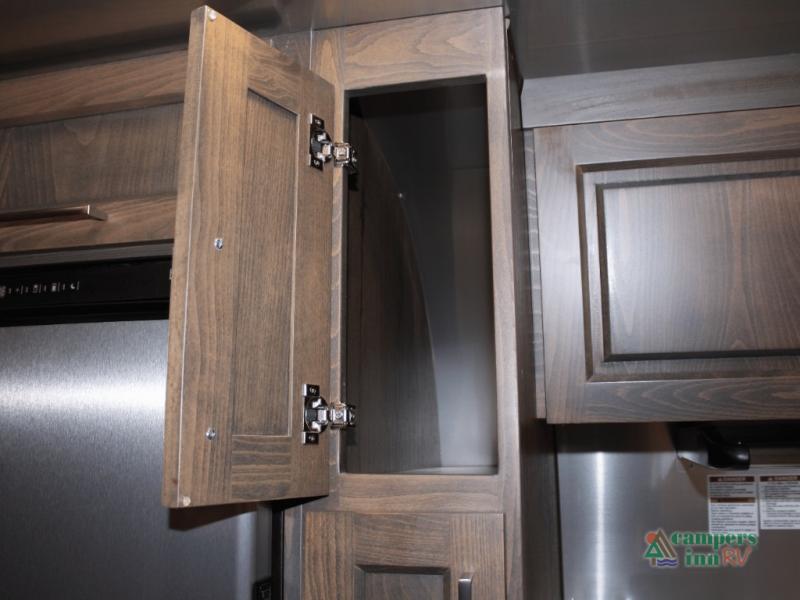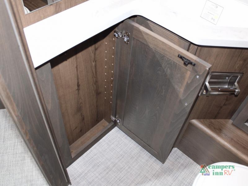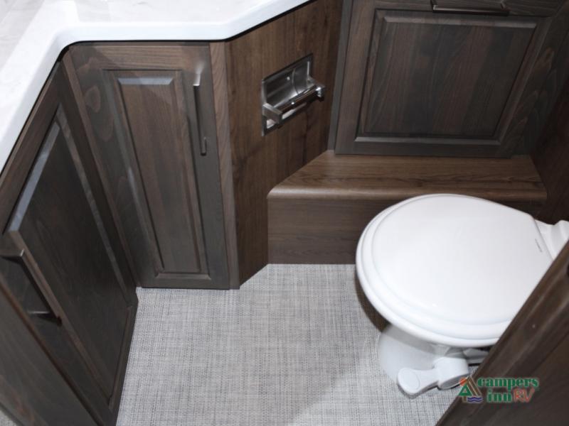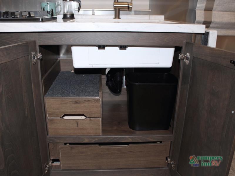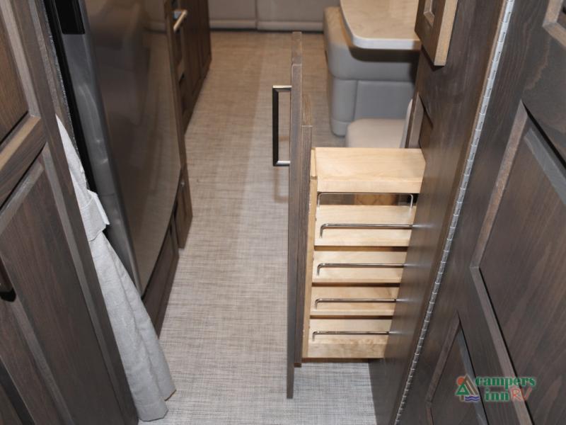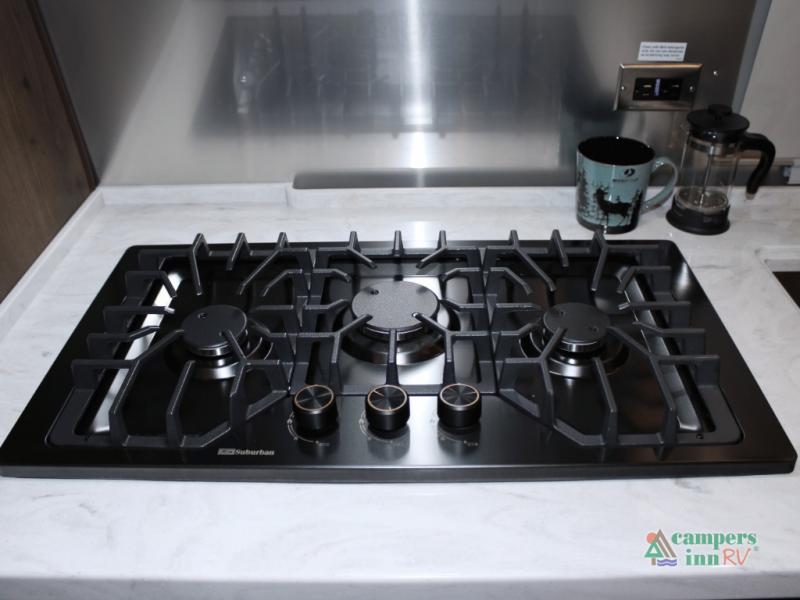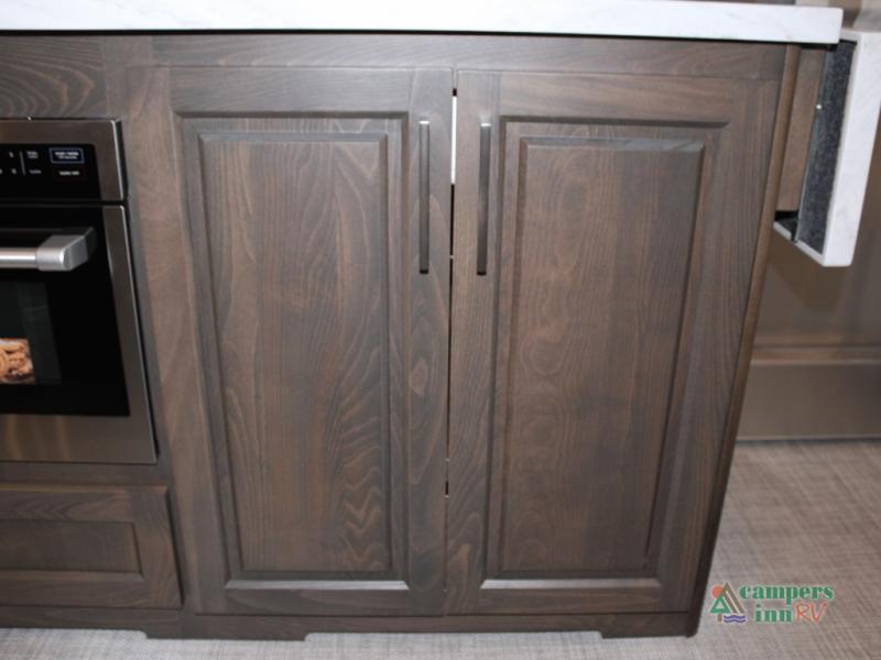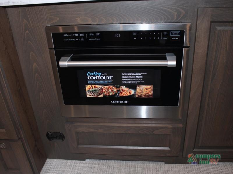 Cook in style with a three-burner cooktop, convection microwave, and an 8.2 cu. ft. 12V refrigerator that keeps your ingredients fresh and your meals delicious. The premium kitchen is crafted with top-tier appliances and handcrafted hardwood cabinetry, blending style with function.