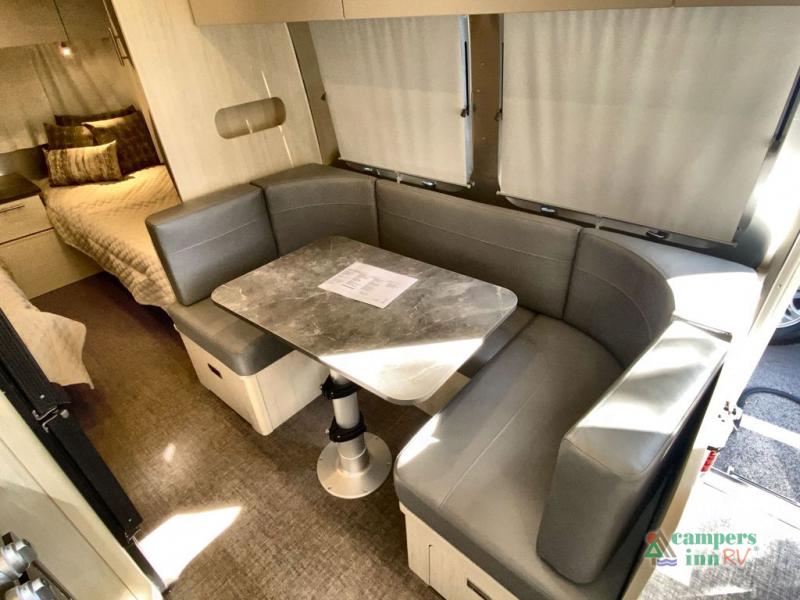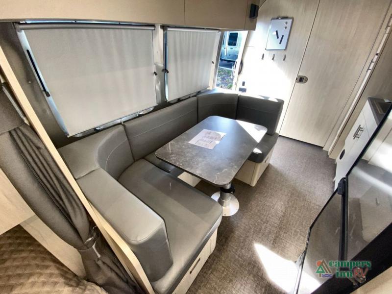 The main living area feels surprisingly spacious for a 23-foot trailer, thanks to panoramic windows, thoughtful layout, and modern styling. The dinette provides a comfortable space for meals, work, or evening relaxation, and it converts into additional sleeping space when guests join the adventure. The combination of natural light and sleek finishes creates a calm, enjoyable atmosphere that transforms every campground into a serene retreat.
