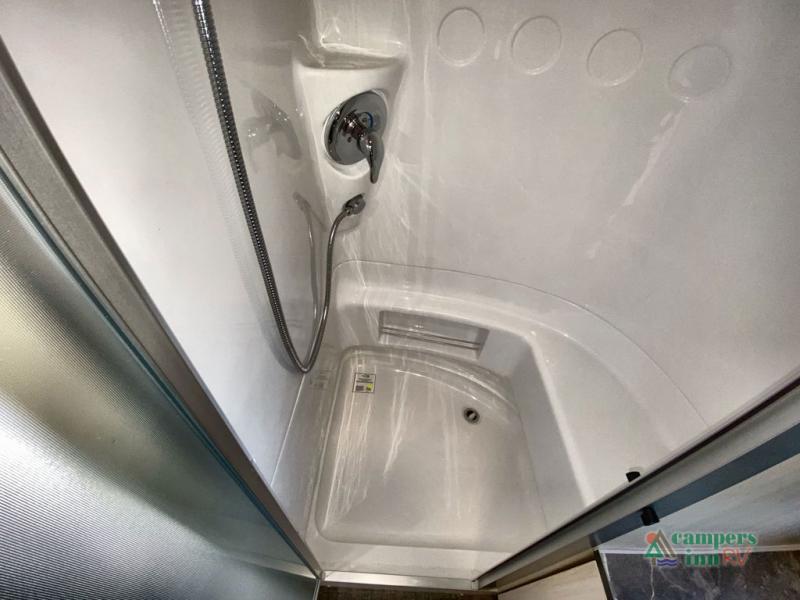 Toward the rear, the spacious bathroom gives you the comfort and privacy of home. With a separate shower, vanity, and storage solutions, you can maintain your daily routines without compromise. The interior’s smart organization allows you to carry everything you need for short trips or extended travels.