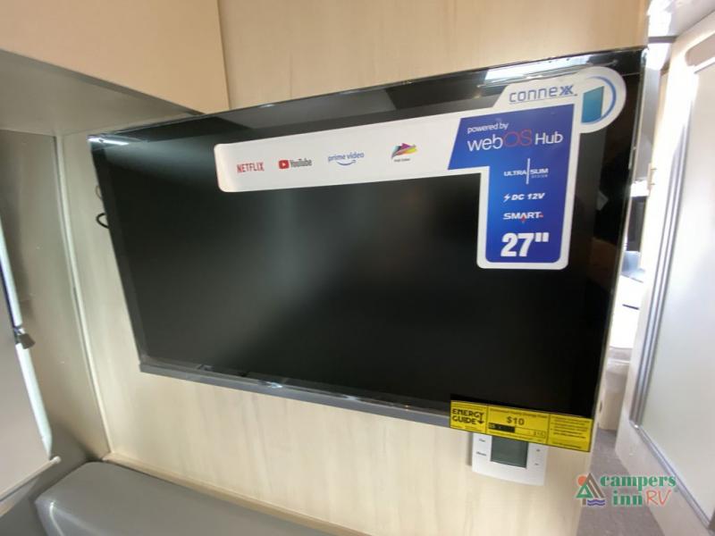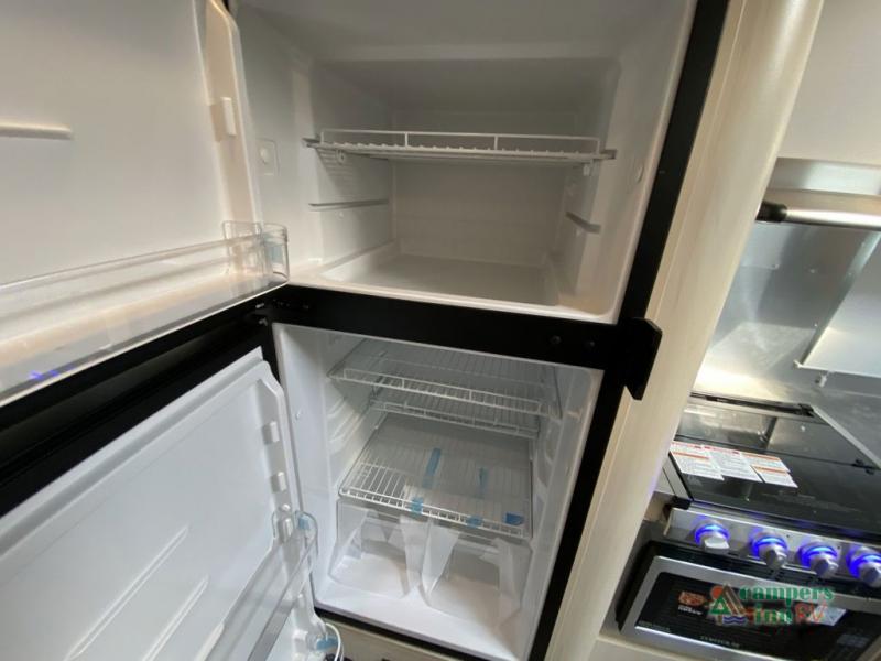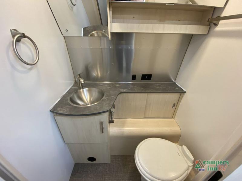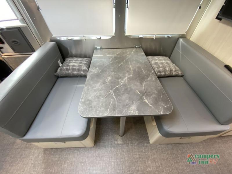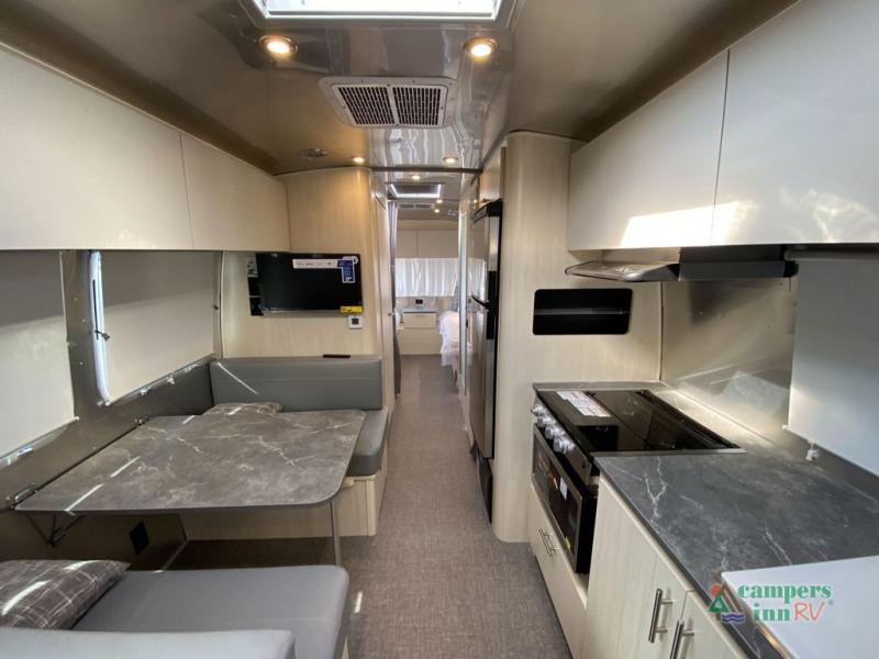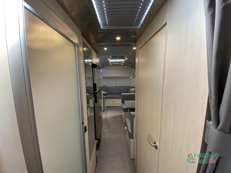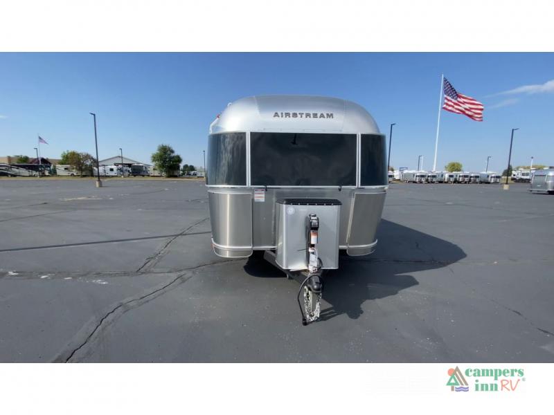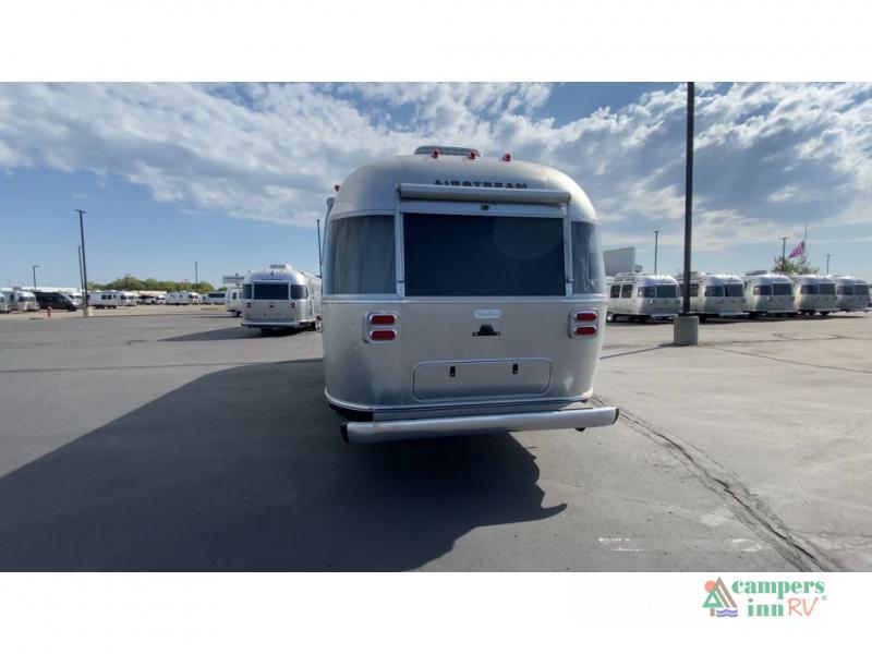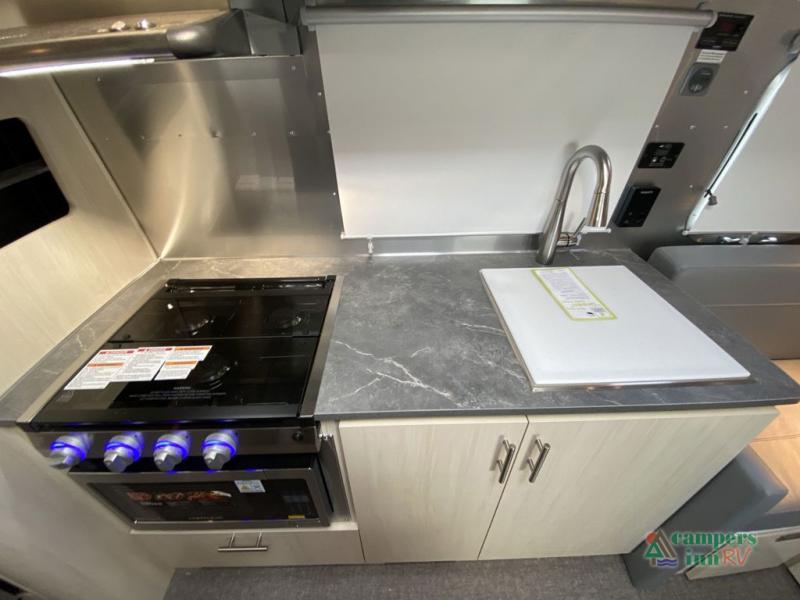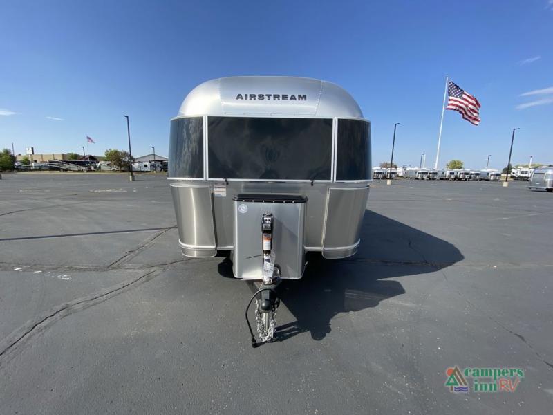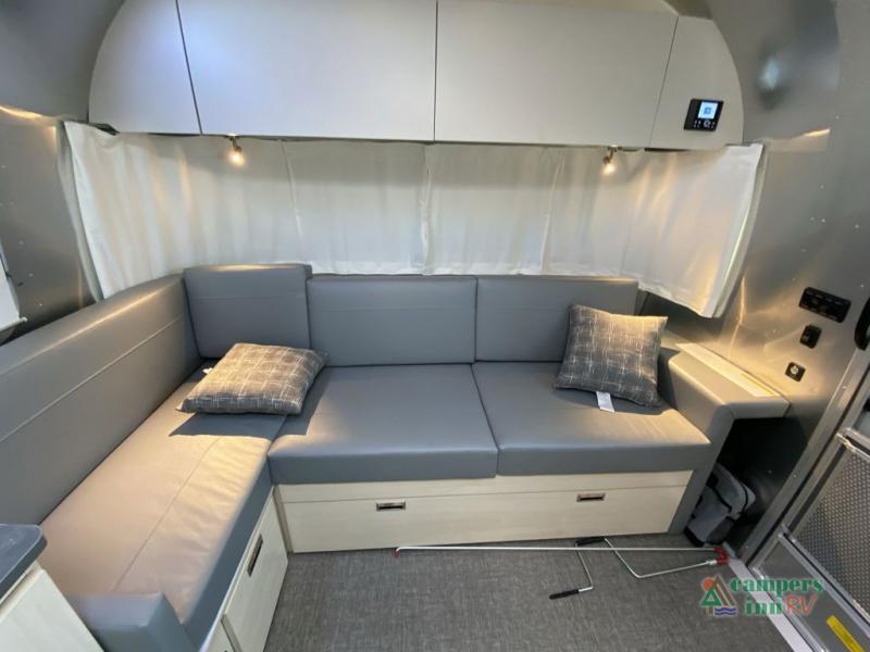 With each Flying Cloud travel trailer by Airstream, there are two axles, and each is built for ease of towing, plus there is a rear-view camera to make reversing and parking easier, and stainless-steel front stone guards to protect the lower segments from road debris. The iconic Airstream design is created outside and inside by the semi-monocoque aluminum superstructure, the temperature reducing one-piece white aluminum roof, the panoramic front windows, and the stylish aluminum wheels. The interior will have you feeling right at home with handcrafted cabinetry, plenty of storage and counter space, sleek roller blinds and blackout curtains, plus residential style faucets!