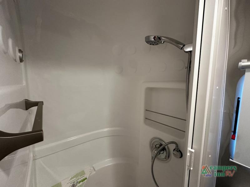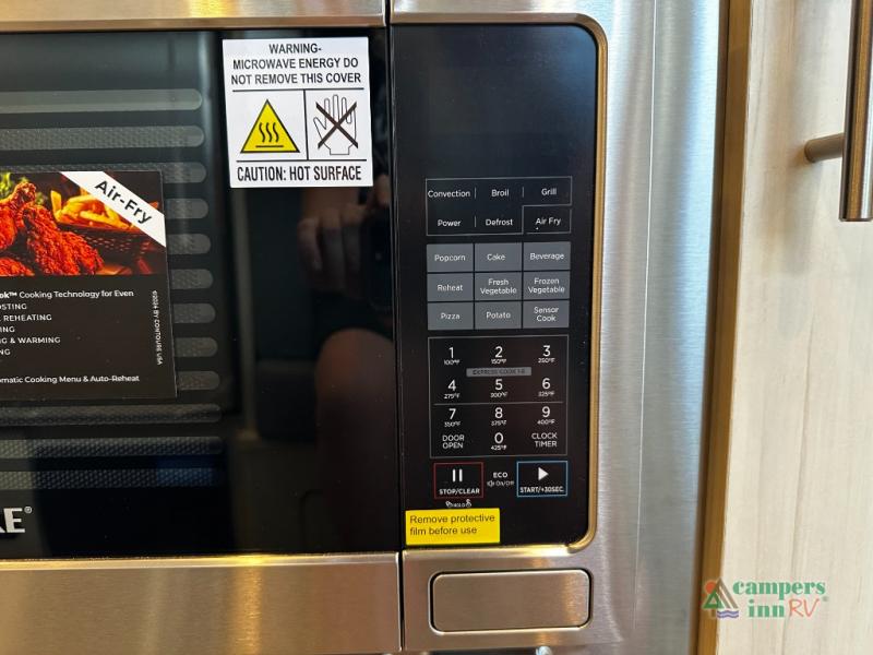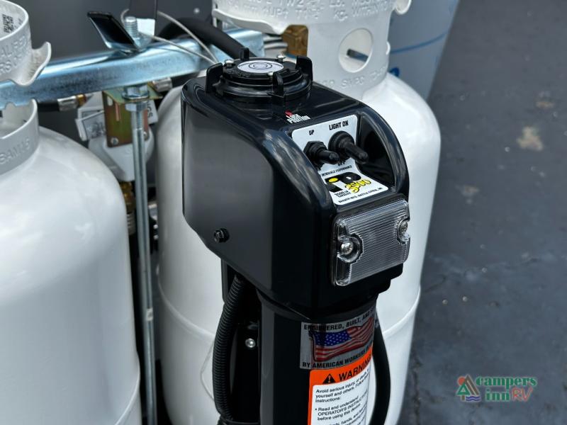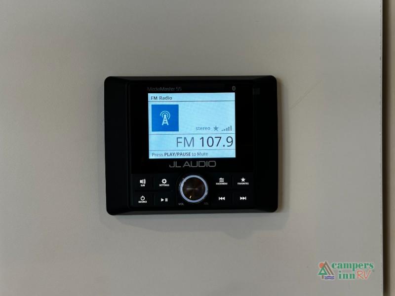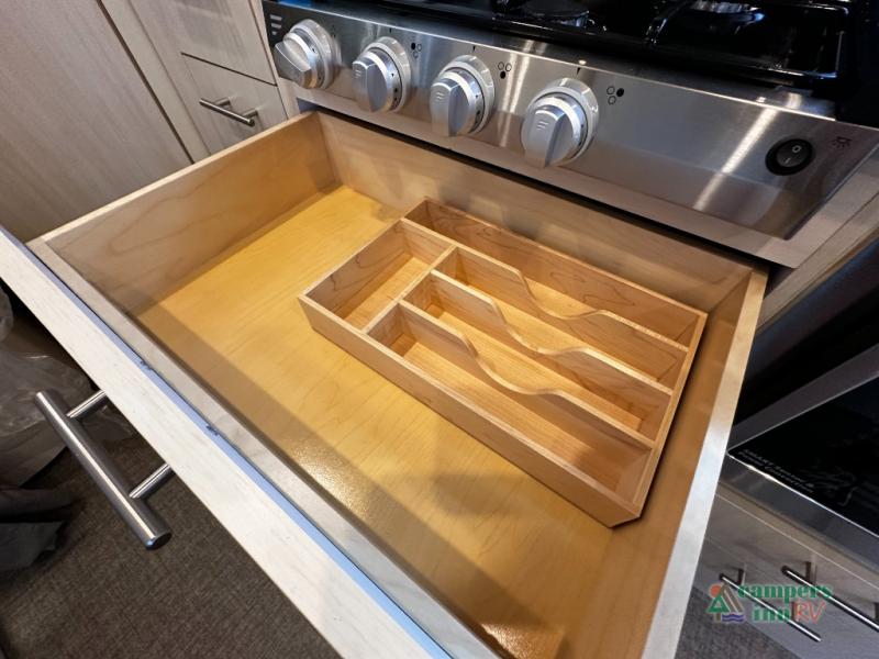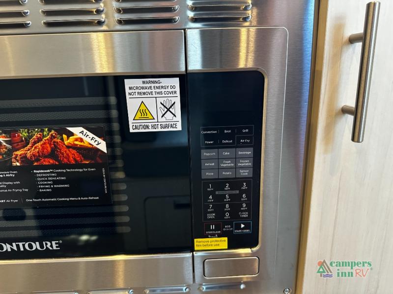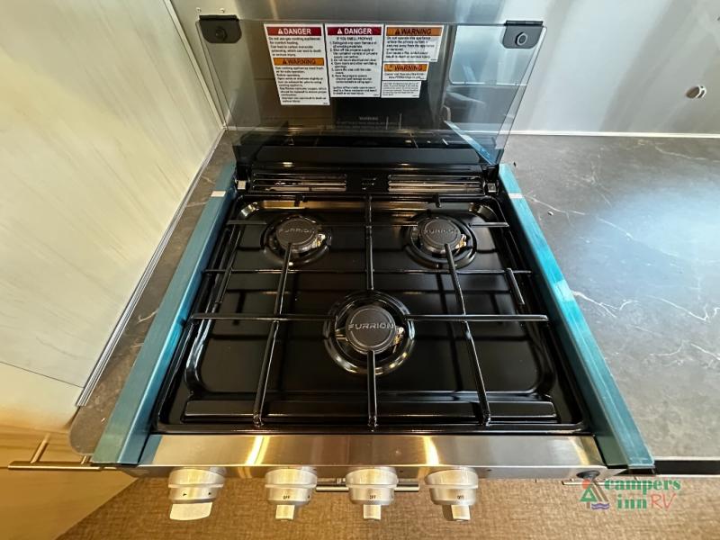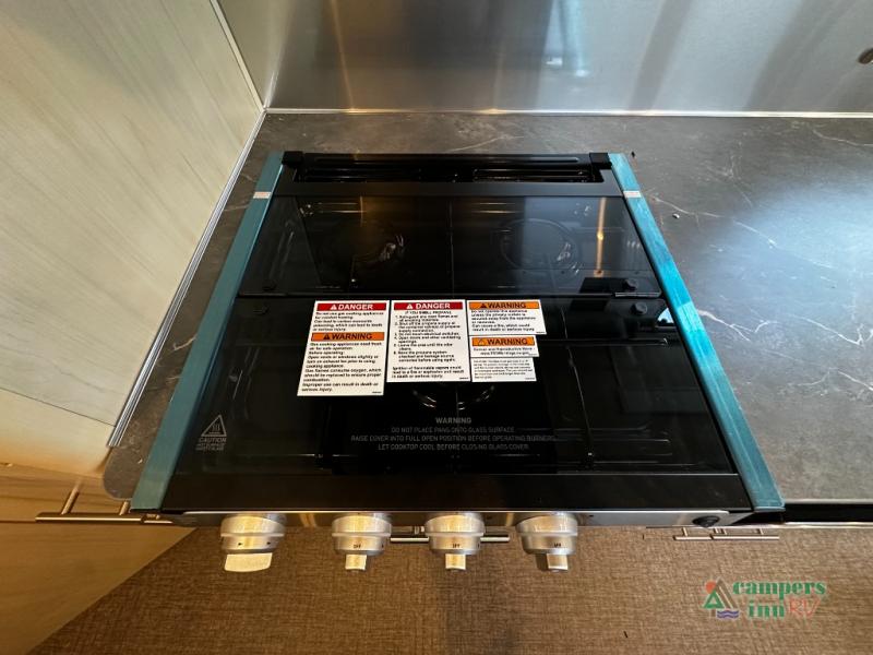 The fully equipped galley kitchen includes a three-burner cooktop, microwave, refrigerator, and stainless-steel sink, making it easy to prepare meals on the go. The luxurious wet bath features a full shower, vanity, and toilet, combining practicality with modern style. Premium materials, clever storage solutions, and thoughtful lighting throughout the trailer enhance the living experience.