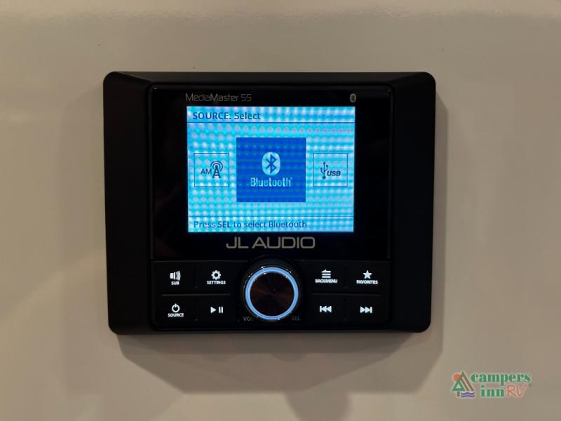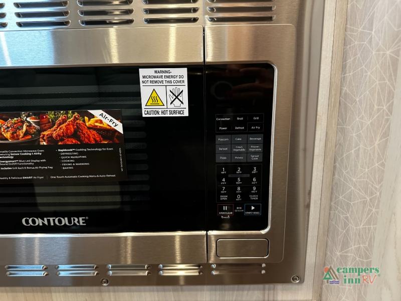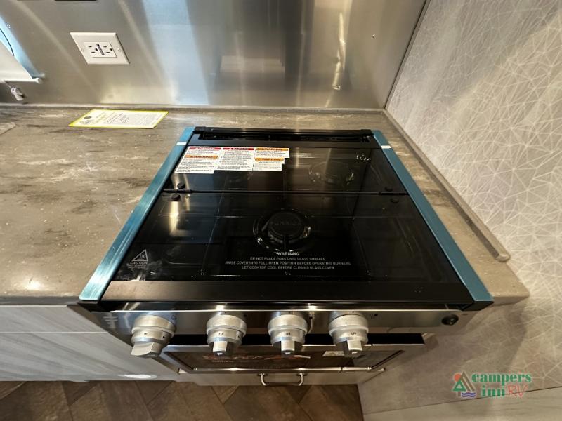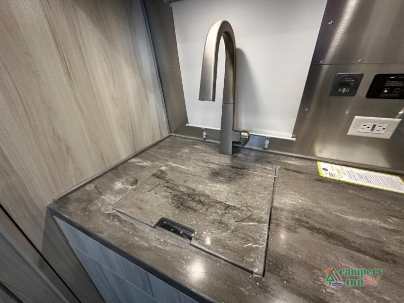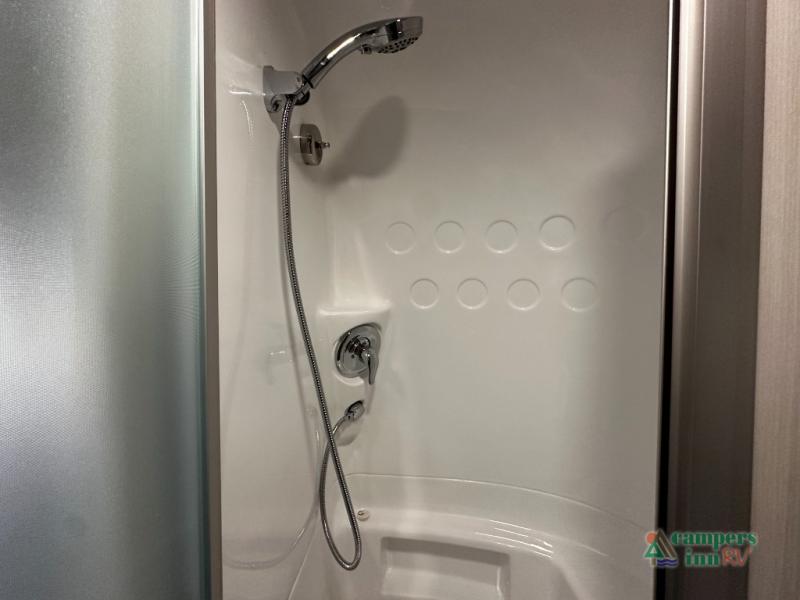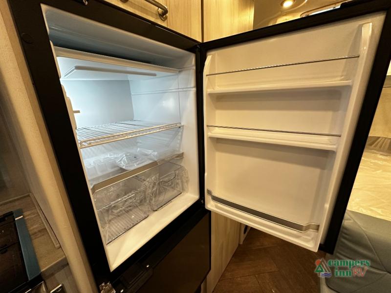 The fully equipped galley kitchen includes a two-burner cooktop, microwave, refrigerator, and stainless-steel sink, making meal preparation easy and convenient on the road. The wet bath is compact yet fully functional, providing comfort and privacy without compromising interior space. High-quality finishes, thoughtful lighting, and durable materials make the interior both stylish and practical.