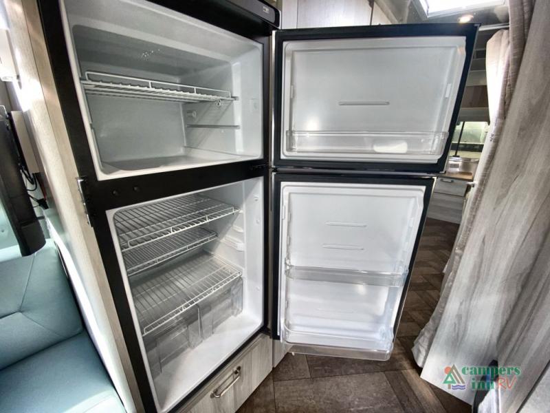 The open concept living area features stylish seating, sleek cabinetry, high-end finishes, and a layout that welcomes conversation, relaxation, or meal prep with ease. The well-equipped kitchen includes a modern stovetop, convection microwave, stainless-steel sink, refrigerator, ample counter space, and organized storage — everything needed to cook fresh meals whether you’re parked at a scenic overlook or at your favorite campground.