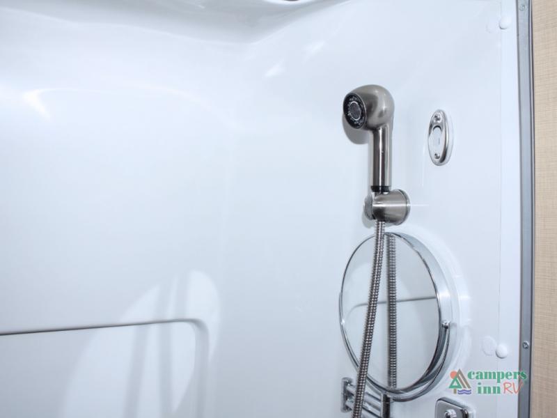 The spa-inspired wet bath includes a riveted aluminum porthole door, one-piece shower, toilet, sink with articulated mirror, towel rack, and even a retractable clothesline—the perfect combination of form and function.