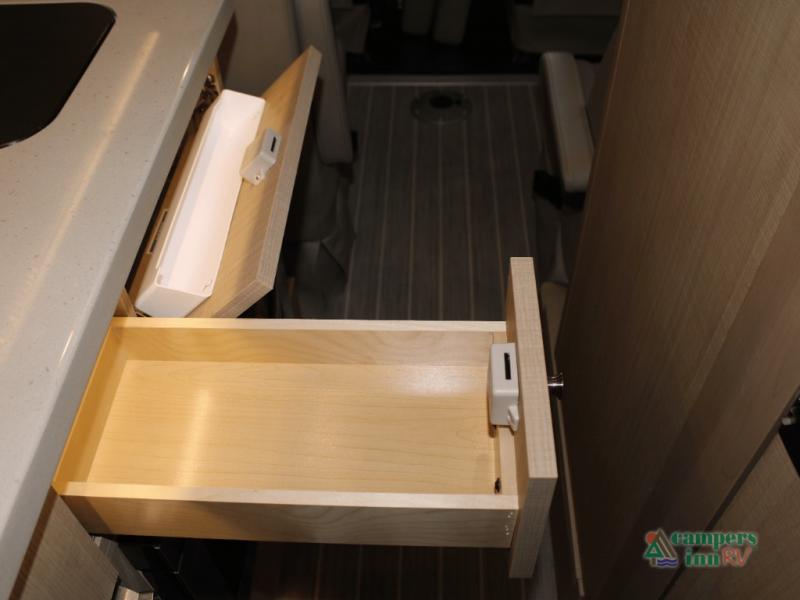 From a quick weekend escape to cross-country travel, the Interstate 24GL Tommy Bahama is equipped with everything you need for comfort on the go. The well-appointed kitchen features a single-burner induction cooktop, drawer-style microwave, and 3.1 cu. ft. refrigerator beneath sleek Corian surfaces.