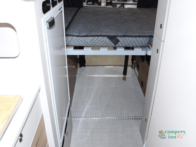 Cooking on the go is a breeze with a fully equipped galley kitchen, and the wet bath offers convenience and cleanliness wherever you are. With ample rear storage, including MOLLE panels and under-bed cargo space, you’ll have room for gear, groceries, and adventure essentials. Want to bring more people? Add the optional pop-top roof with an additional bed and three screen windows for light, ventilation, and sleeping space for up to four.
