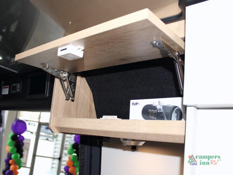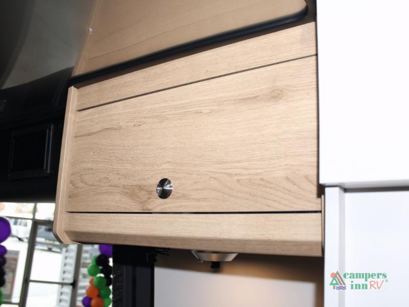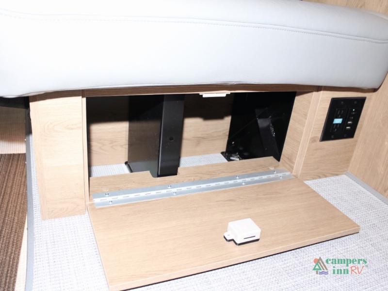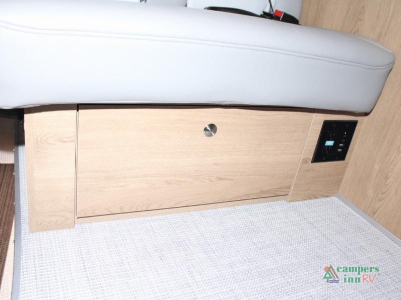 At just the right size for nimble urban maneuvering or open-highway cruising, the Rangeline RGT brings true "home on the road" functionality. Inside, you'll find a beautifully designed living space featuring Warm River Oak cabinetry, sleek gray countertops, and two elegant interior color options that give a residential, high-end feel. The innovative flex bed system folds out easily to create a full-size sleeping area, while the swivel driver and passenger seats and flex table system with bench seating provide a welcoming space for meals, work, or friendly conversation. The removable table adapts to your needs — extend it, rotate it, or remove it entirely to open up space.