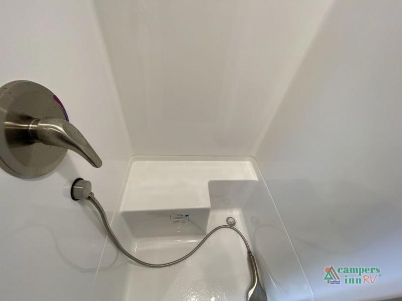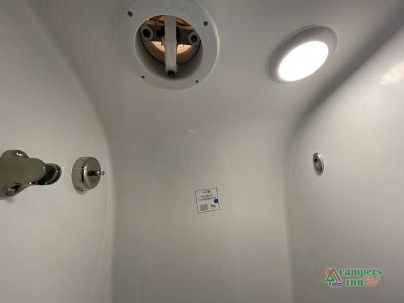 Trade your briefcase for luggage and head for the hills in this travel trailer for five! When you arrive at your destination, you can set up the ZipDee manual patio awning with LED lights, grab the camp chairs from the storage, and relax with a cold drink. There is a private toilet and vanity in a half bath, with the independent shower across the hall so two people can freshen up at once. You'll find plenty of storage throughout this model, including a closet to keep clothes wrinkle-free, underbed storage, plus upper and lower cabinets. The kitchen includes high-end appliances, including a 12V refrigerator, and a three burner stove and oven, or you can choose the optional convection microwave. Your crew can gather at the L-shaped dinette with panoramic views provided by the windows, and your guests can sleep here at night. The optional rear hatch can be added for even more convenience, as well as optional twin beds in place of the queen bed if you choose.