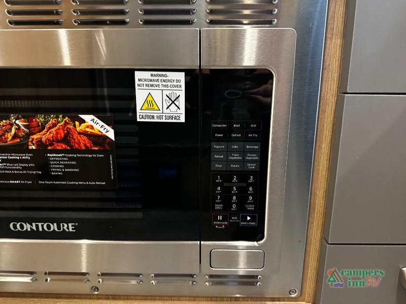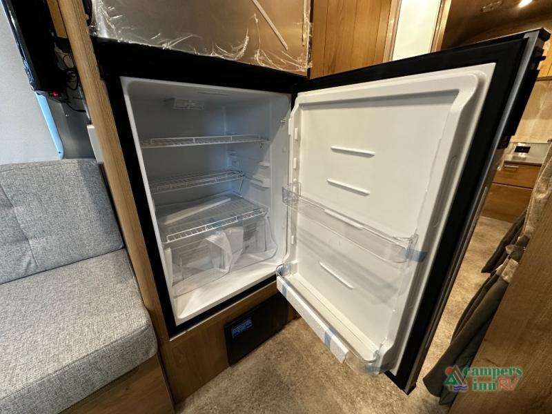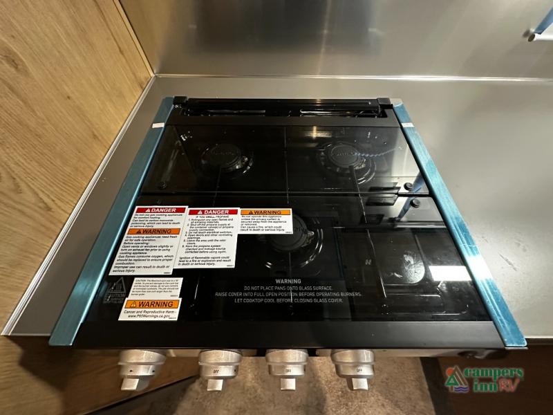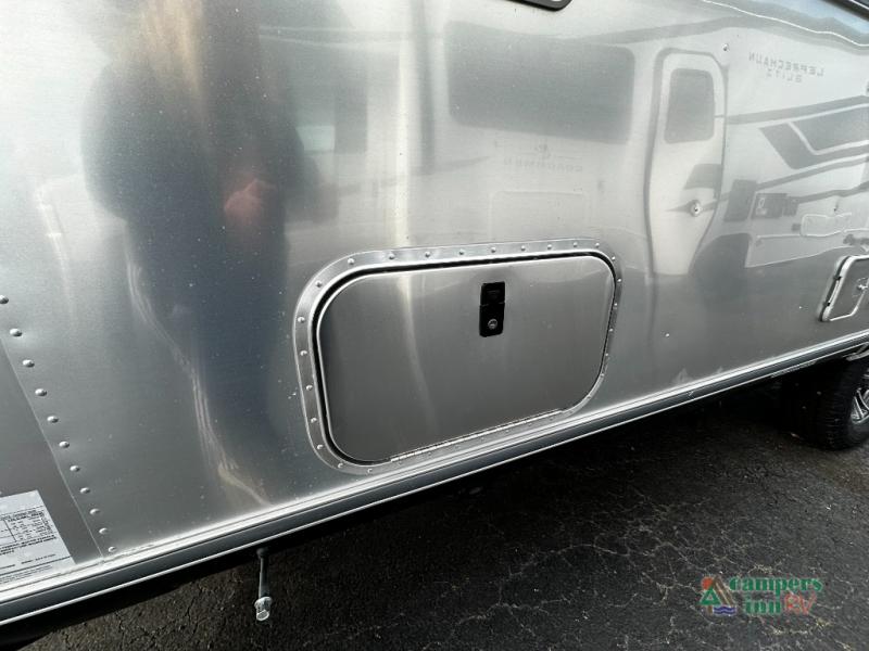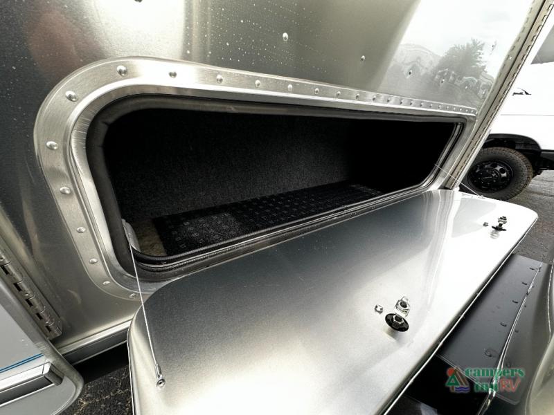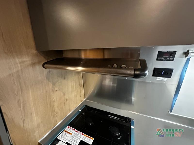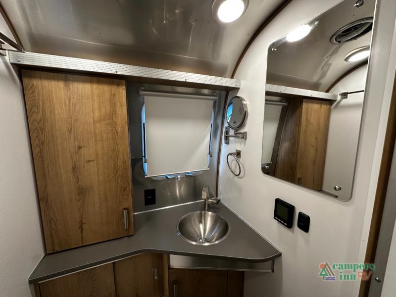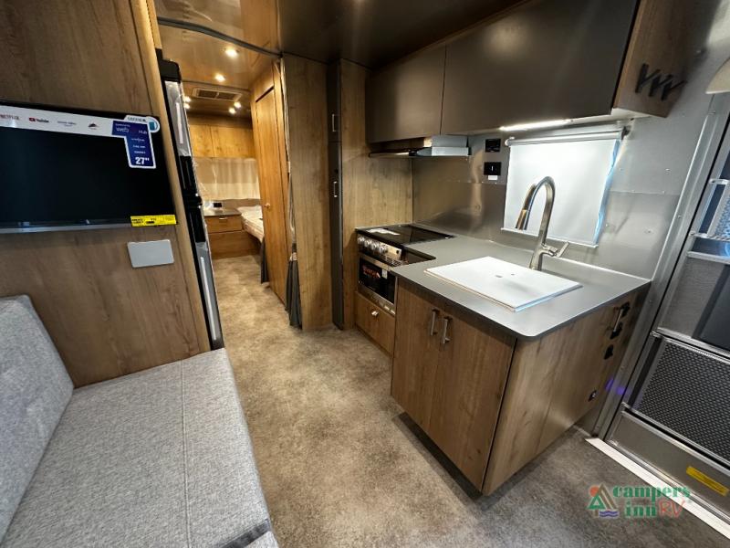 The fully equipped galley kitchen includes a two-burner cooktop, microwave, stainless-steel sink, and refrigerator, making meal prep simple even in remote locations. The wet bath is compact yet functional, providing privacy and convenience without compromising interior space. Every feature reflects Airstream’s commitment to high-quality materials, craftsmanship, and modern design.