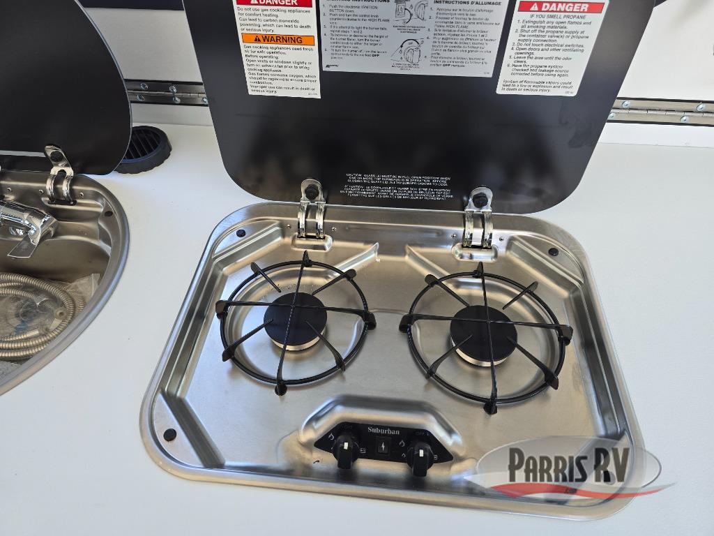 Don't wait another minute; head to the campground in this camper today! There is a two burner cooktop to make lunch on and a 3.0 cu. ft. 3-way refrigerator with a freezer for your cold items, and you can add the optional outside grill if you like to cook outdoors! The sofa bed converts to a queen-size bed and the dinette also converts to a queen-size bed or dual bunks. You'll find storage space under the dinette and on the two shelves, and there is a 32" x 32" hidden shower under the dinette so you can clean up each day. This model also has a dry weight of 2,400 lbs. for easy towing!