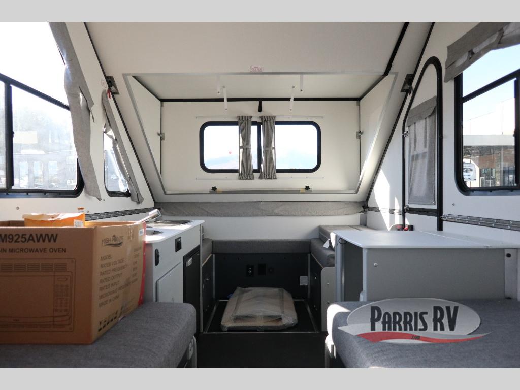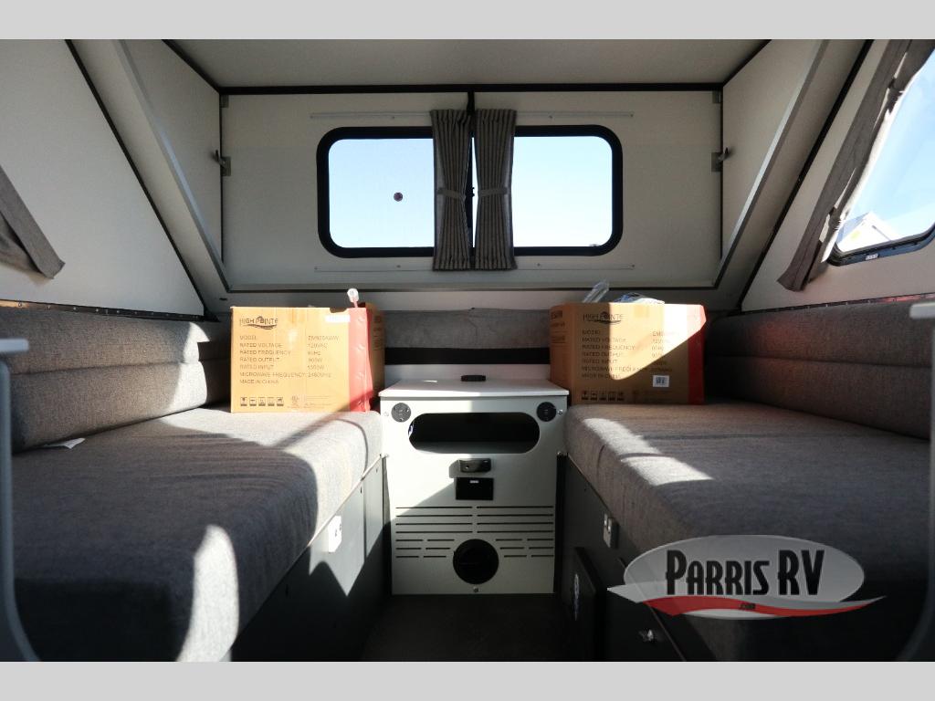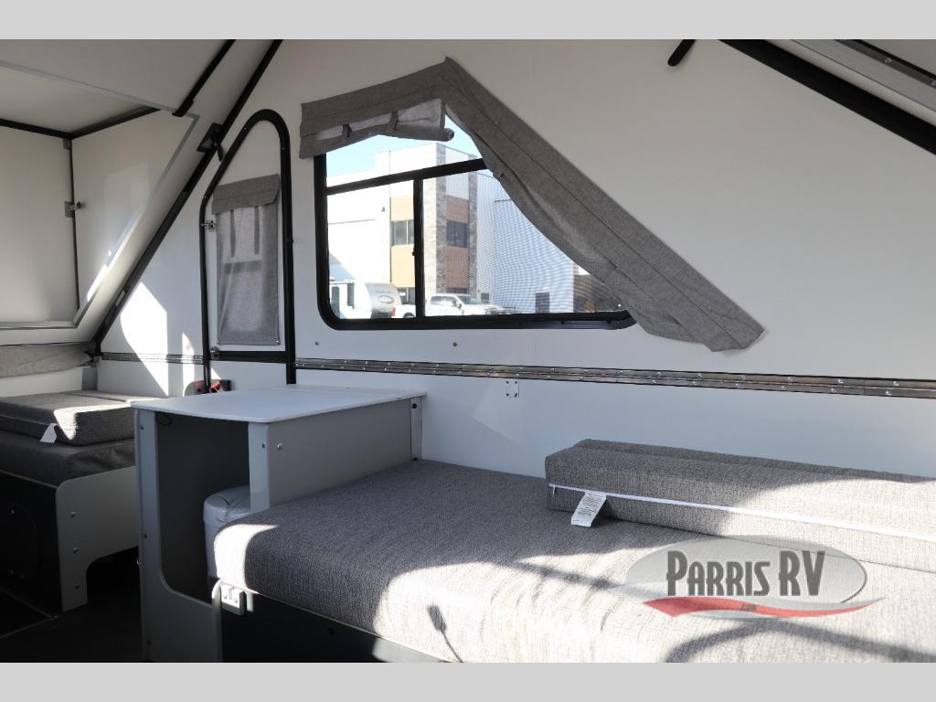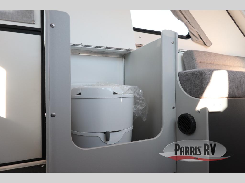 Two to four, depending on size can easily camp in this twin bed model featuring two 30" x 80" twin beds in the rear of the unit. There is a two-burner cooktop to make lunch on and a 3.2 cu. ft. 12V refrigerator for your cold items! The dinette converts to a 40" x 80" bed for one or two more tired campers. You'll find storage space inside for your things and the cassette toilet is quite handy especially at night. This model also has a dry weight of 2,400 lbs. for easy towing!