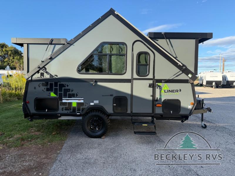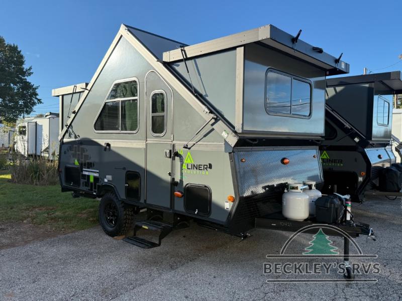 The Evolution A-frame camper by Aliner is coming to you with residential features and solid construction materials. You'll love the slate gray exterior, aluminum wheels, and the Azdel composite panels to help prolong the life of your camper. There are LED running lights, exterior baggage doors, and four stabilizer jacks to help keep your camper secure. You will also appreciate the keyless entry, the dual LP tanks with a cover, and the 200-watt solar panel on the front dormer for some off-grid power. The lift kit and 15" off-road tires add 3" to the height, allowing you to explore more roads, and you'll find many interior comforts to make you feel right at home!